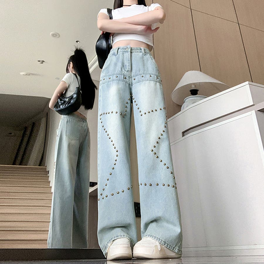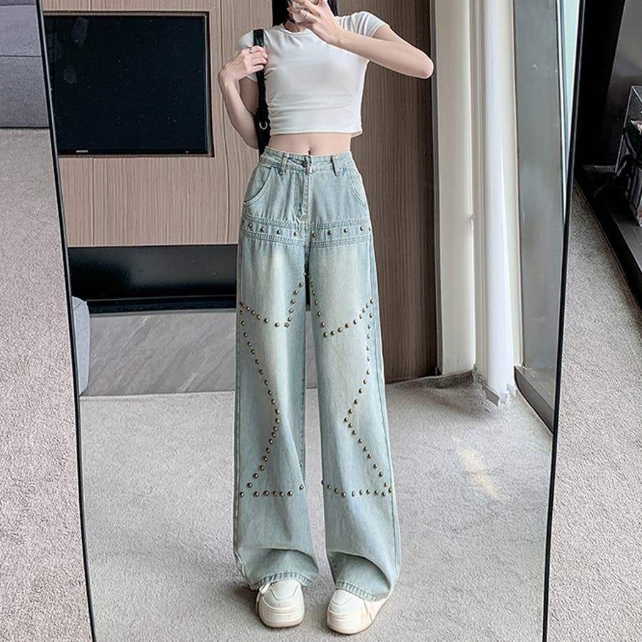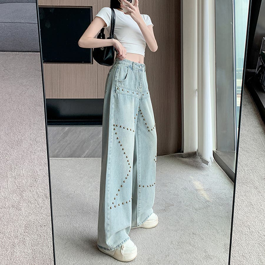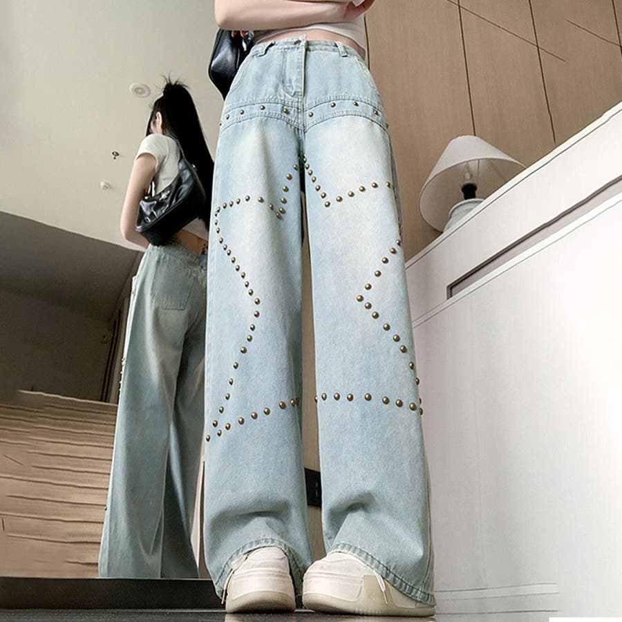 ミレニアル学園風 ゆるカワコーデ☆スタースタッド ストレートデニムパンツ