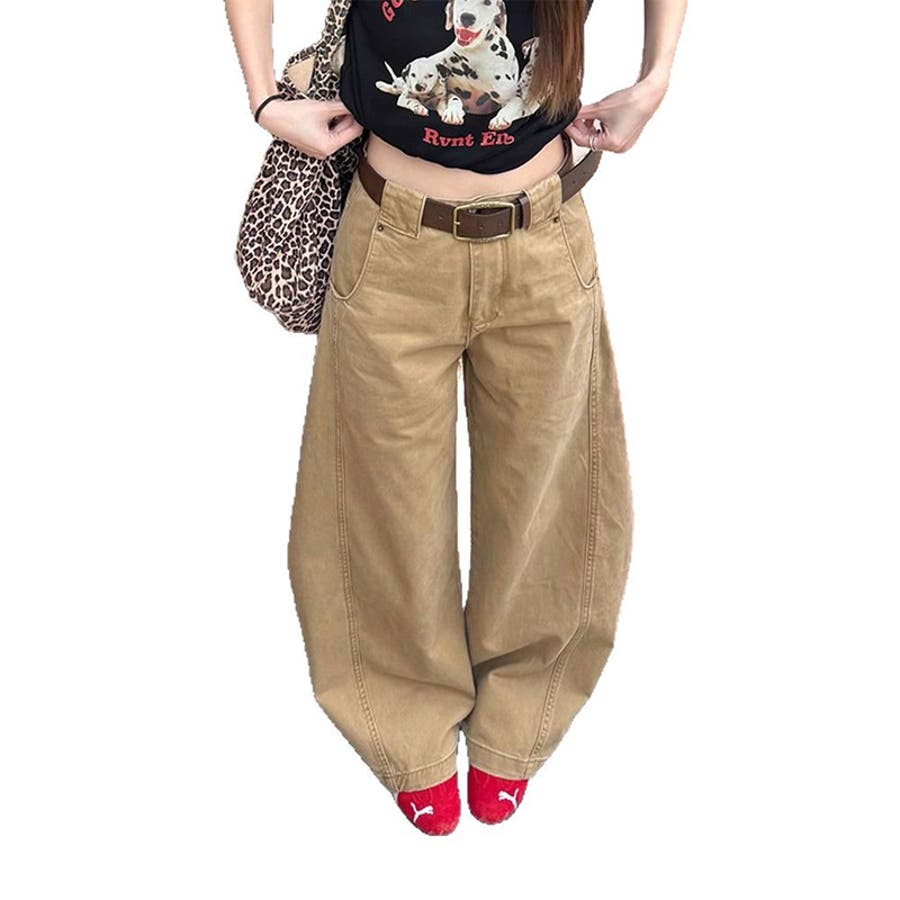 ゆるカワコーデ 米風ヴィンテージ風ライン入りカーブパンツ