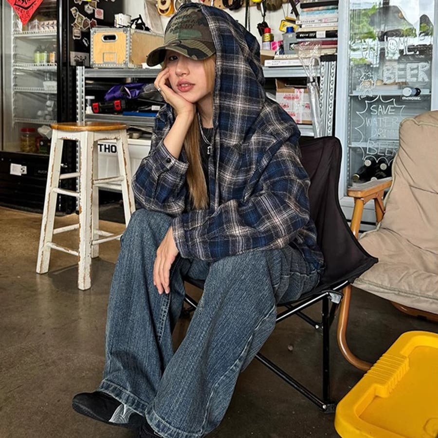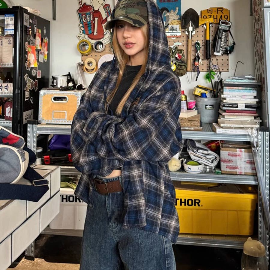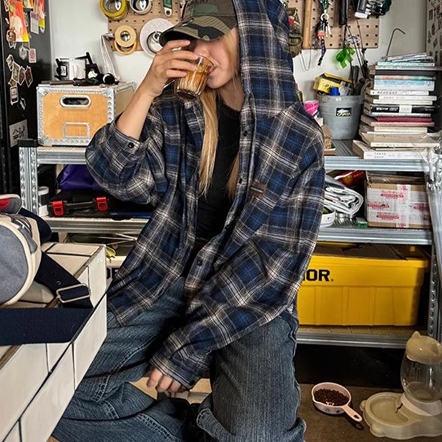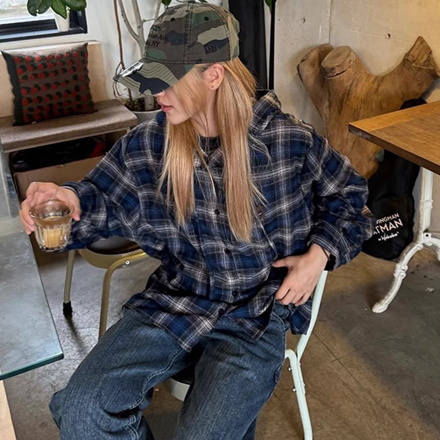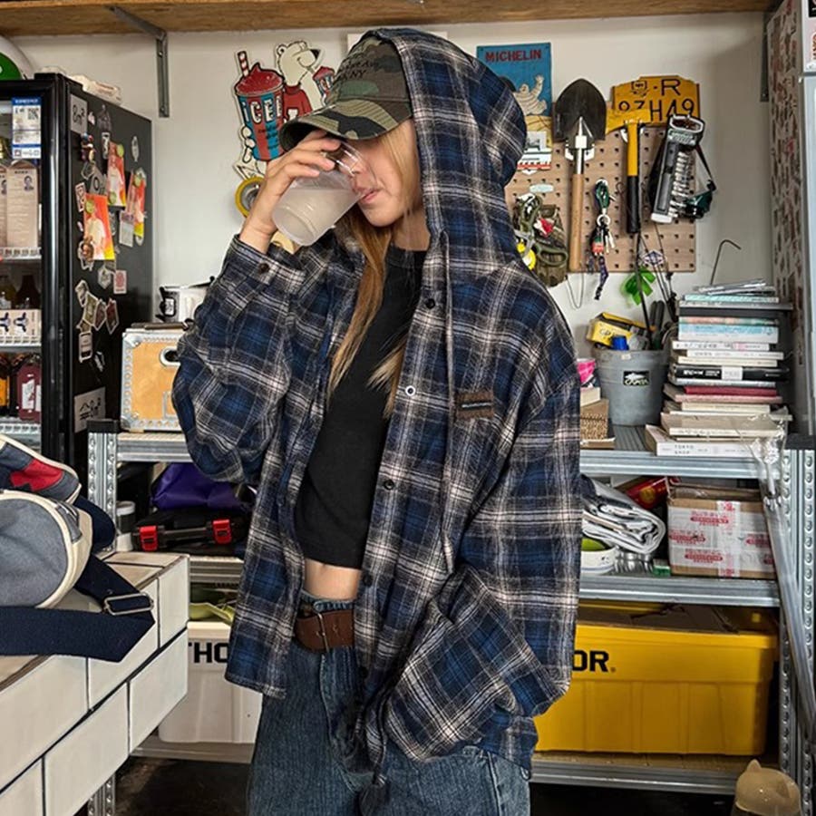 ゆるカワコーデ アメリカン配色チェック柄フード付きシャツ レトロストリート風