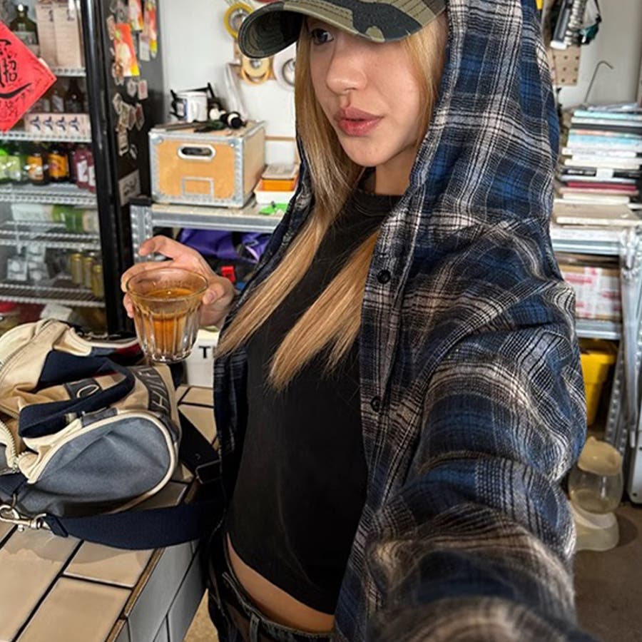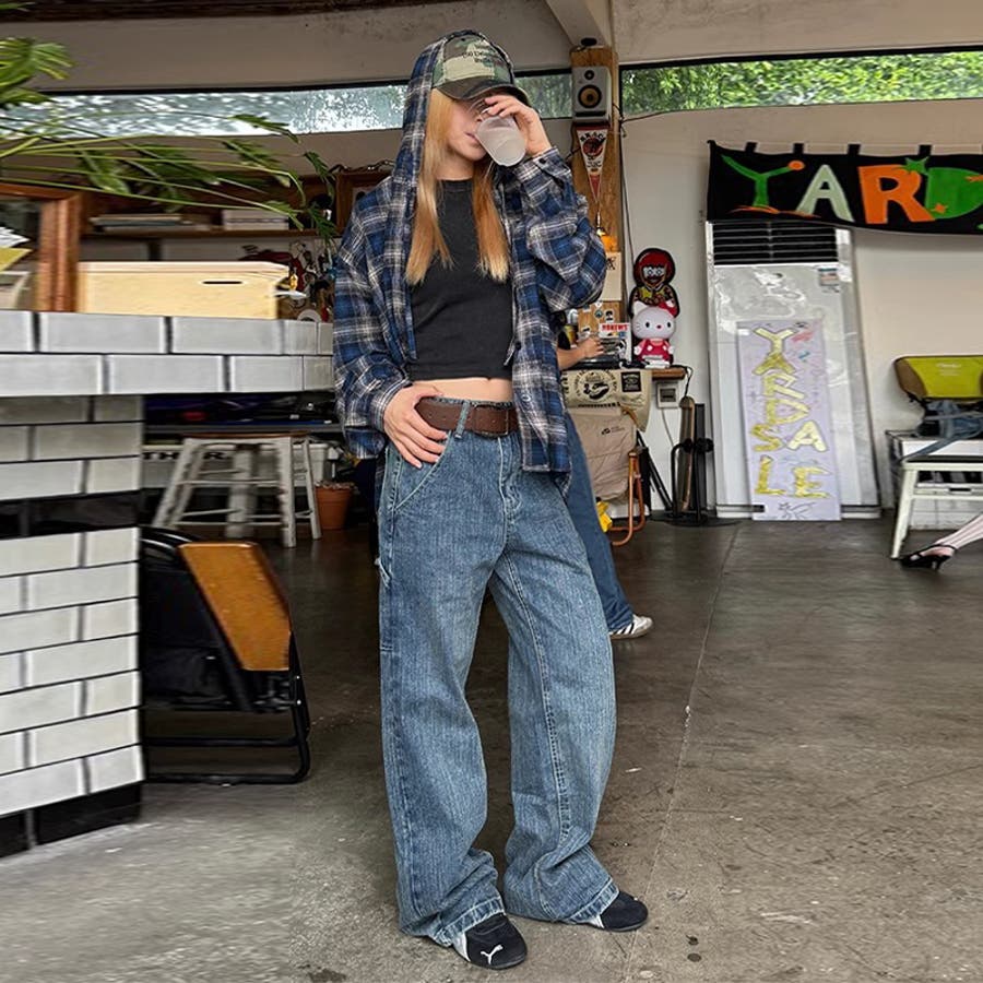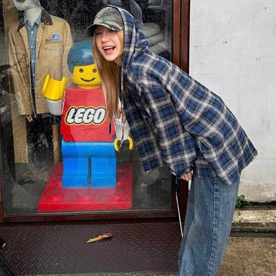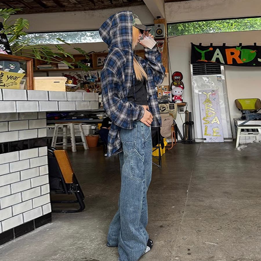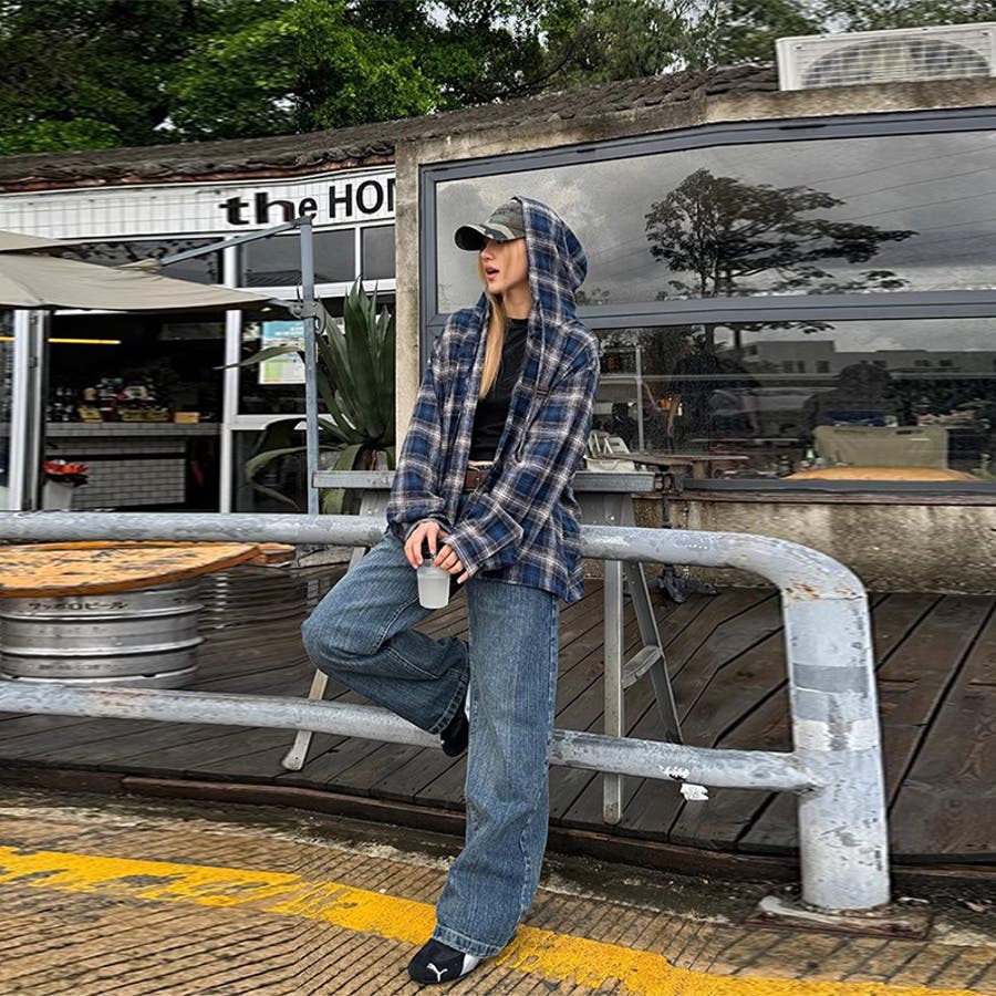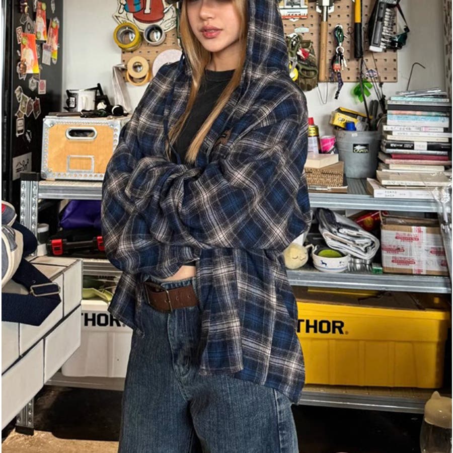 ゆるカワコーデ アメリカン配色チェック柄フード付きシャツ レトロストリート風