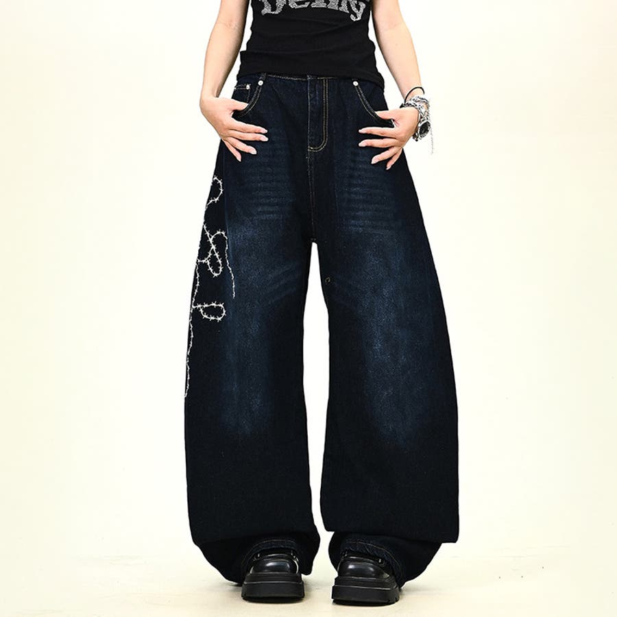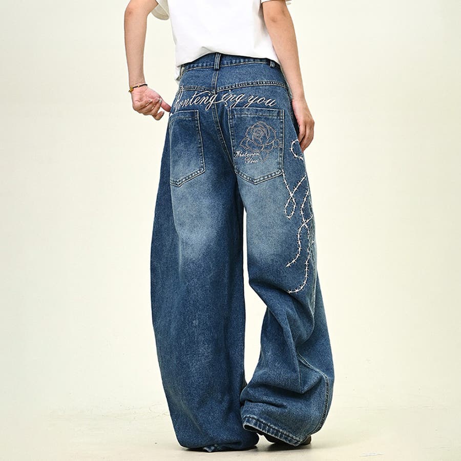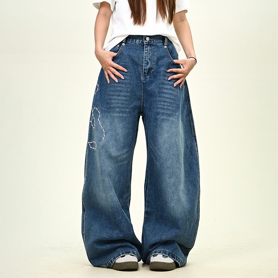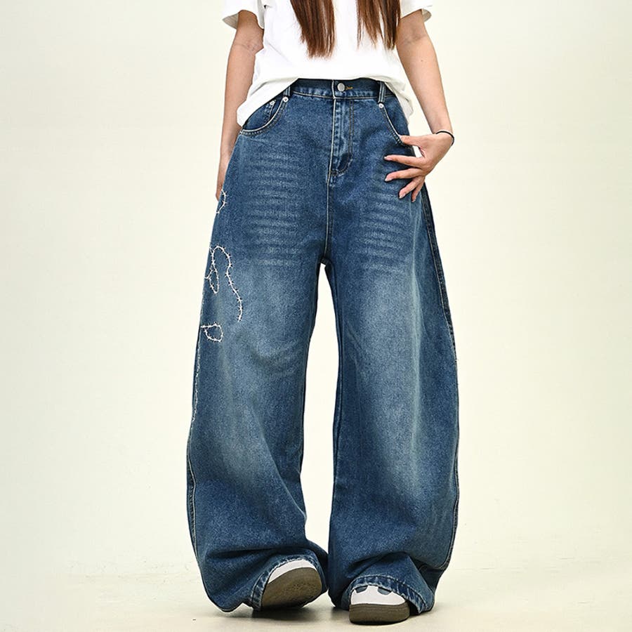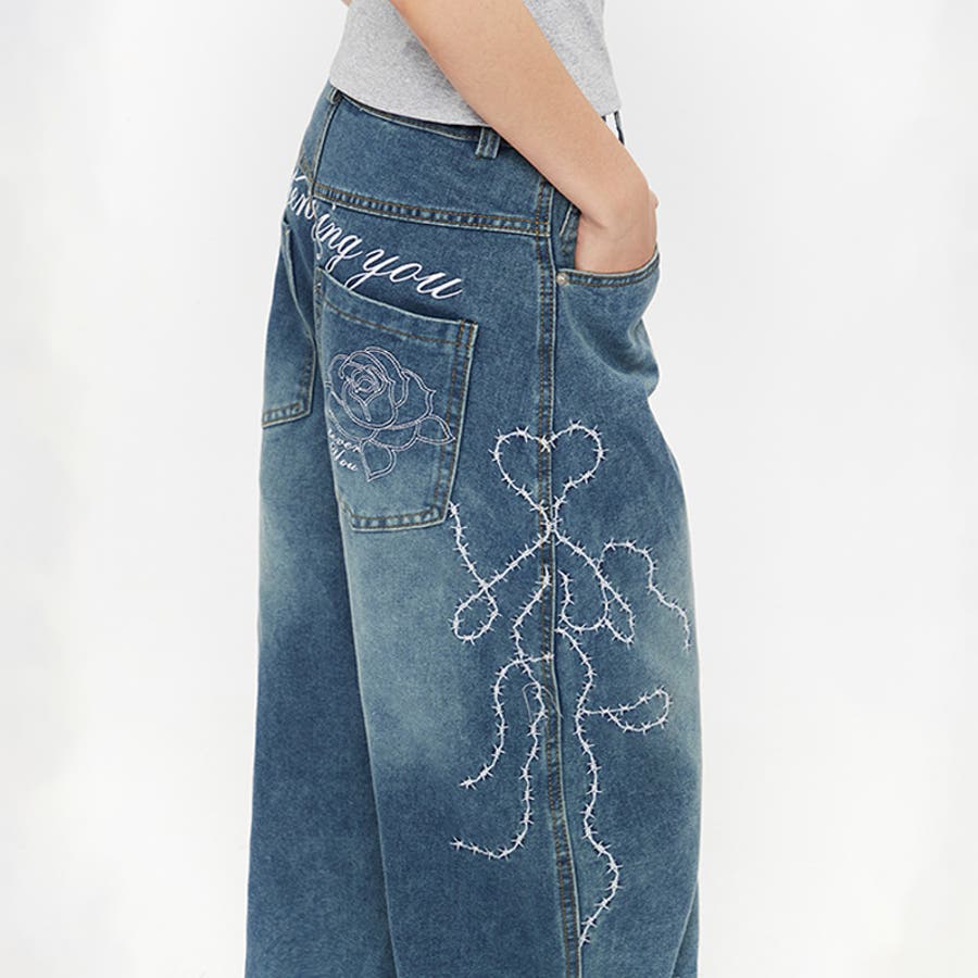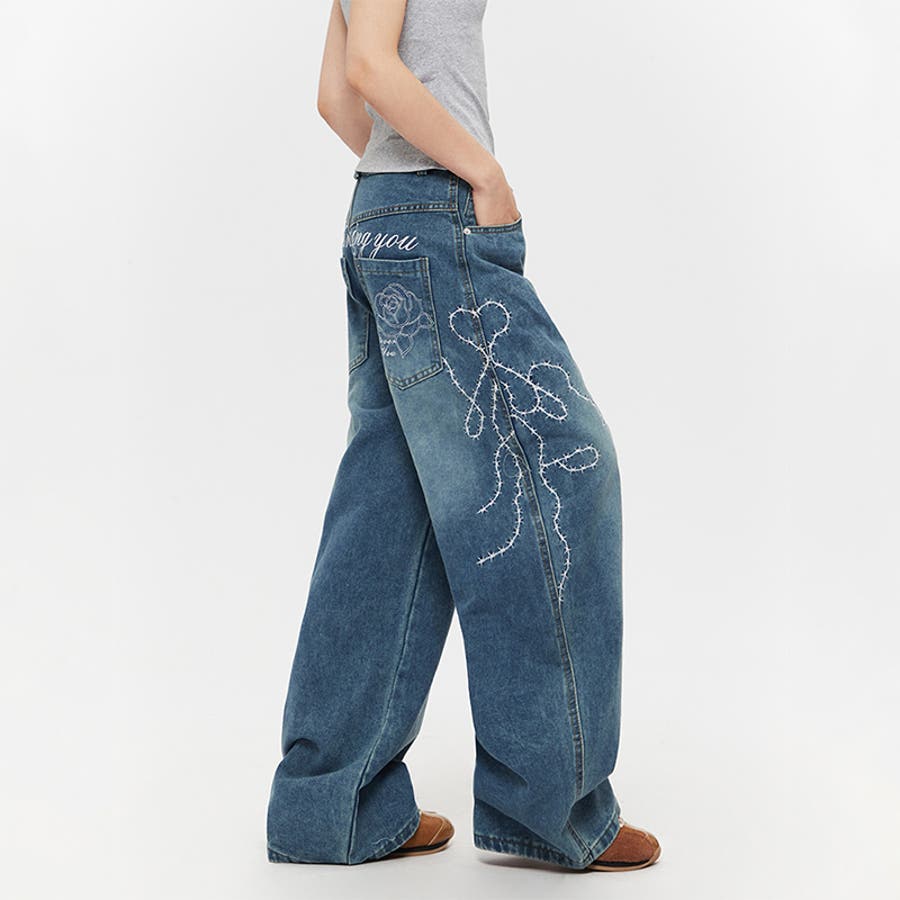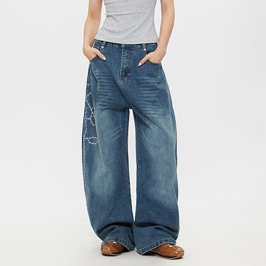 ゆるカワコーデ☆ウォッシュ加工 刺繍ワイドジーンズ