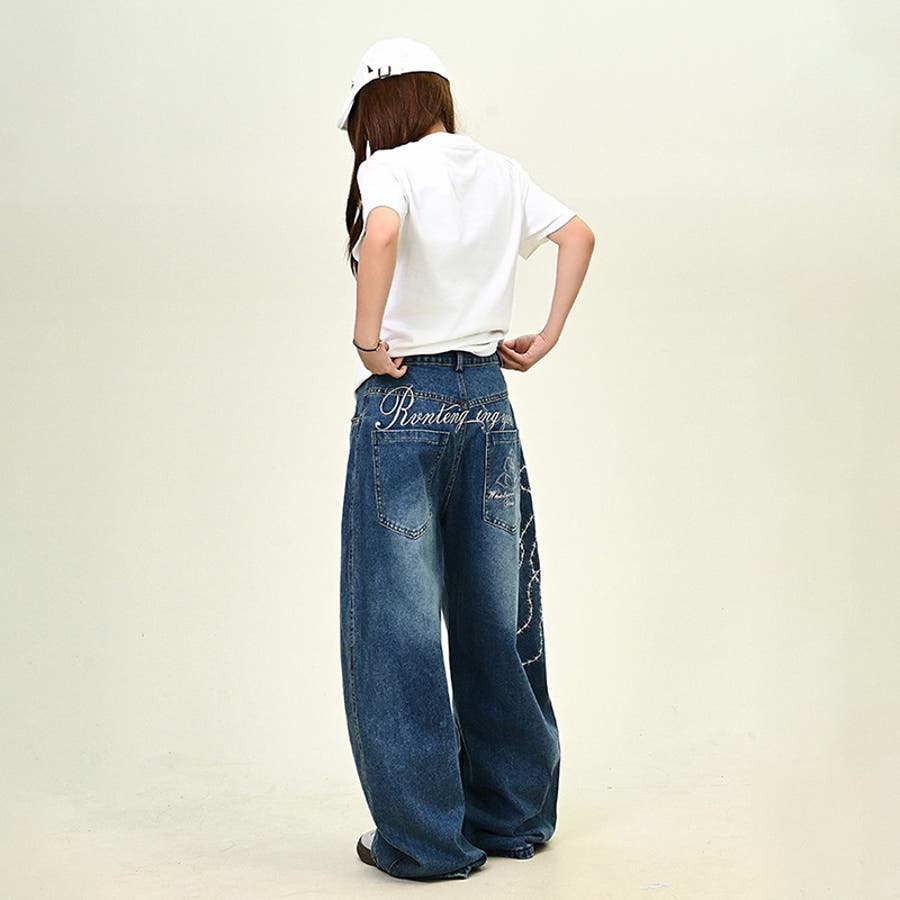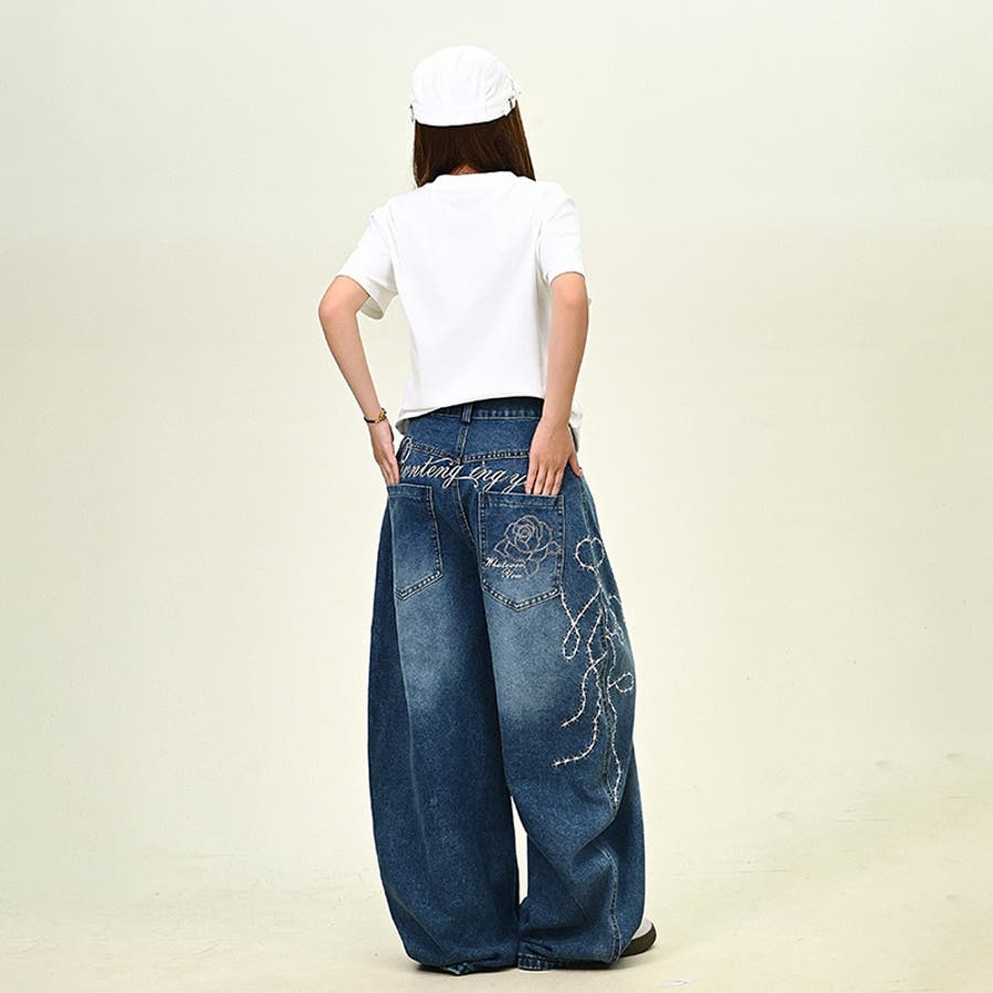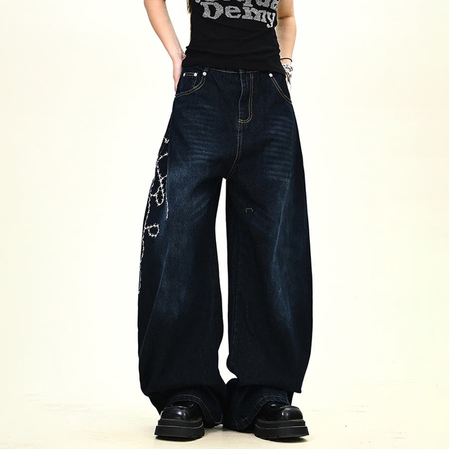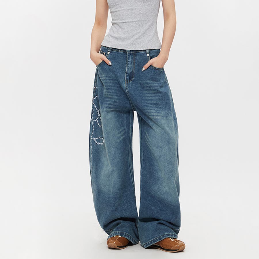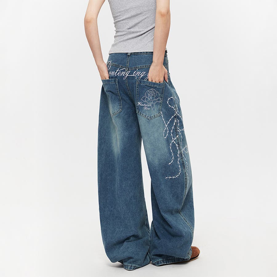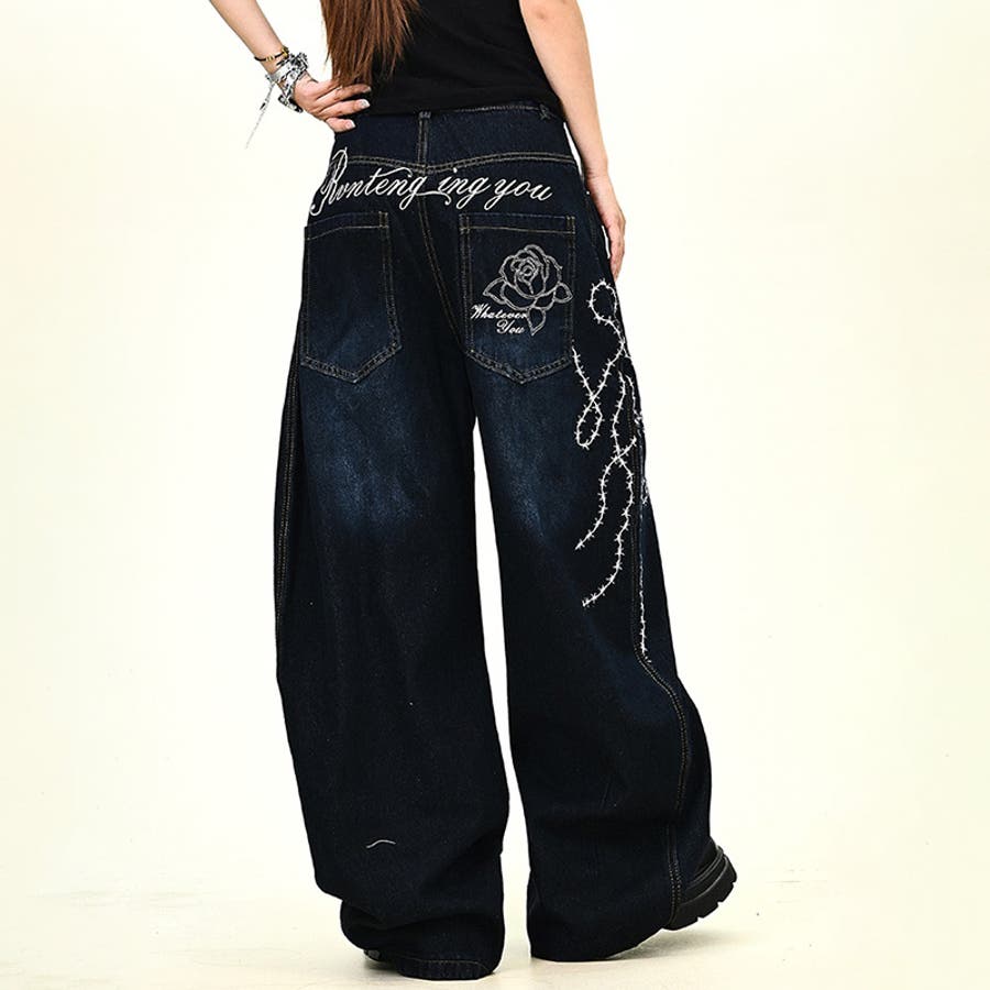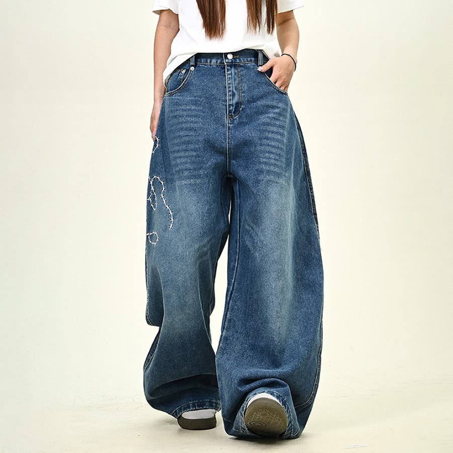 ゆるカワコーデ☆ウォッシュ加工 刺繍ワイドジーンズ