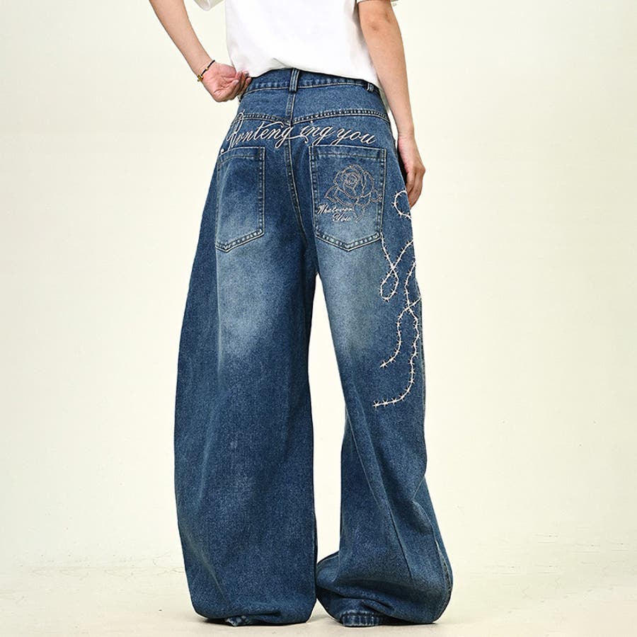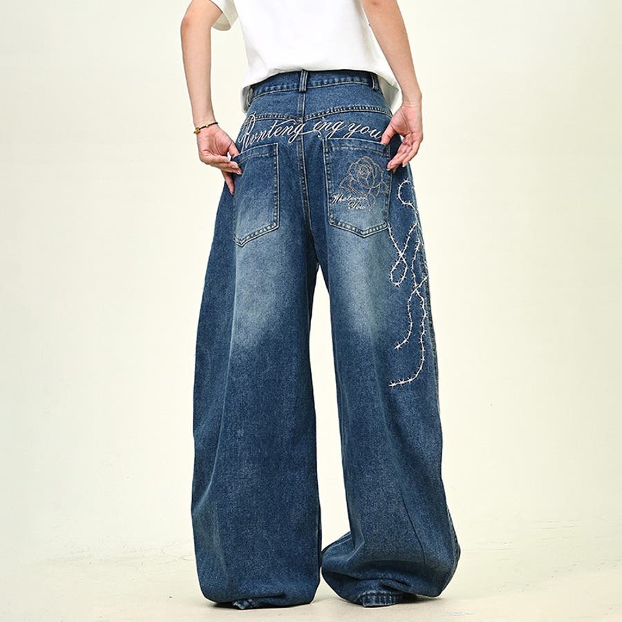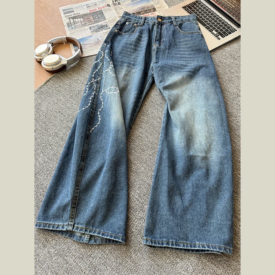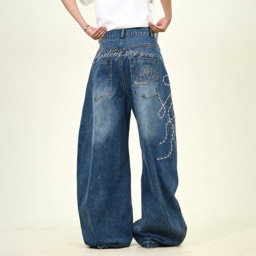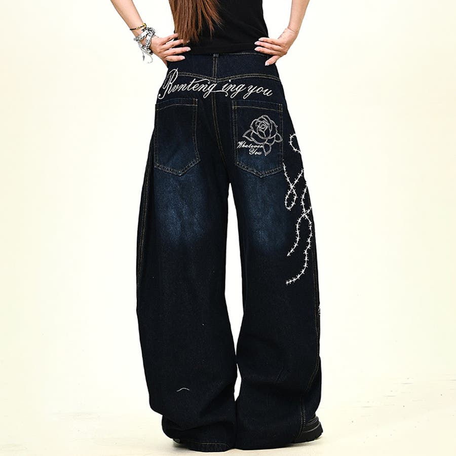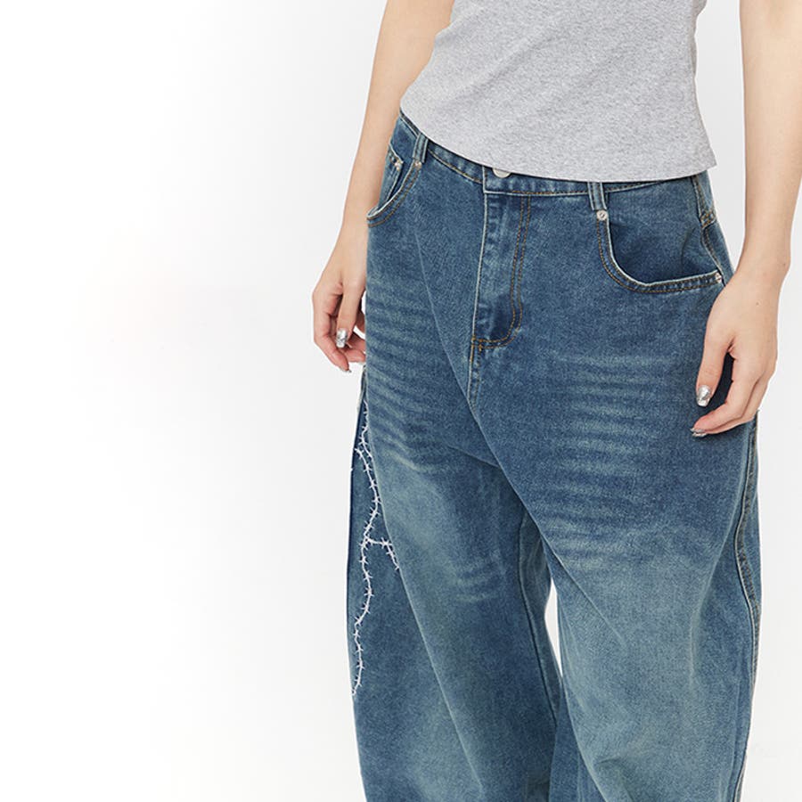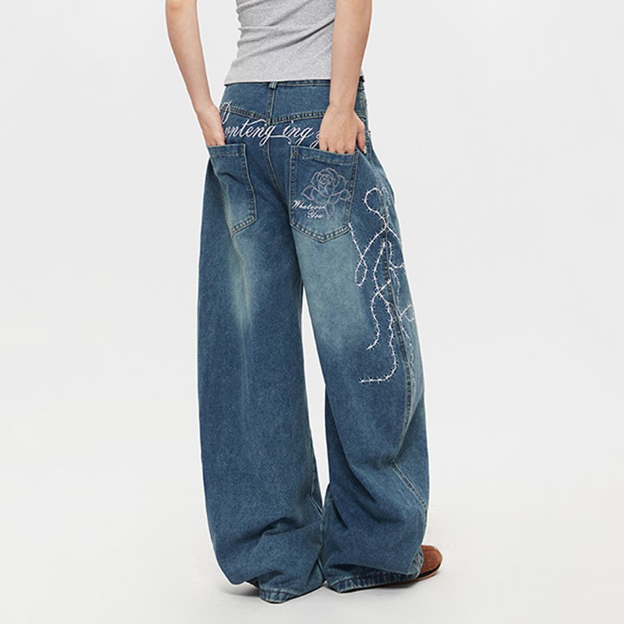 ゆるカワコーデ☆ウォッシュ加工 刺繍ワイドジーンズ