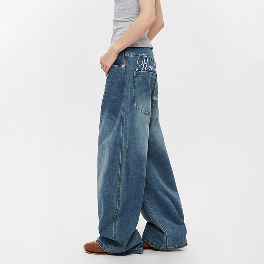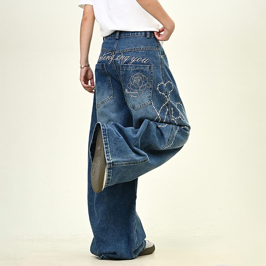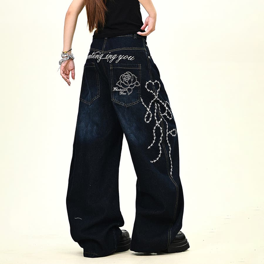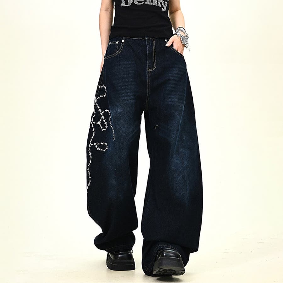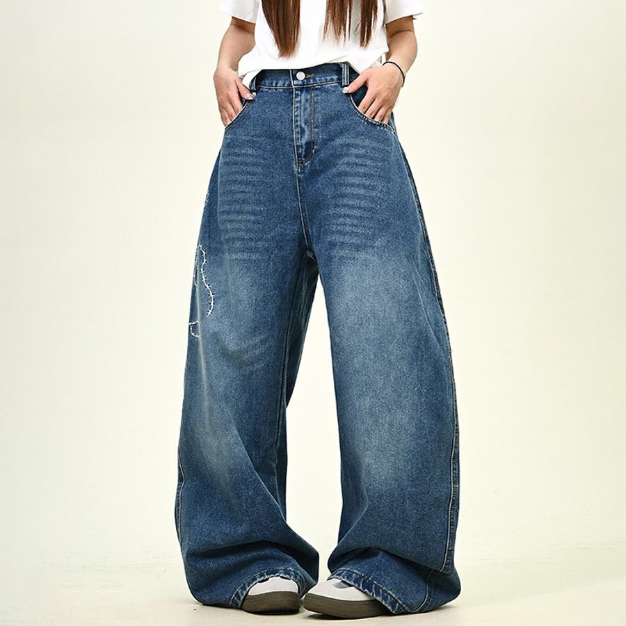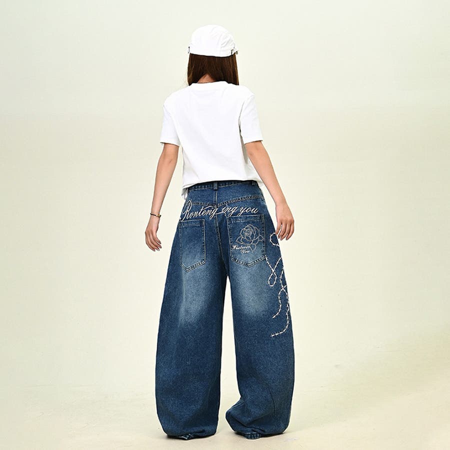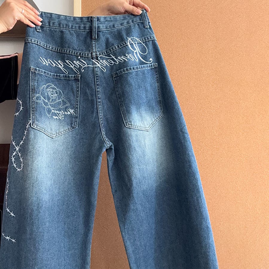 ゆるカワコーデ☆ウォッシュ加工 刺繍ワイドジーンズ