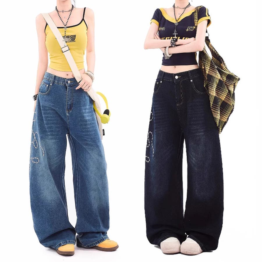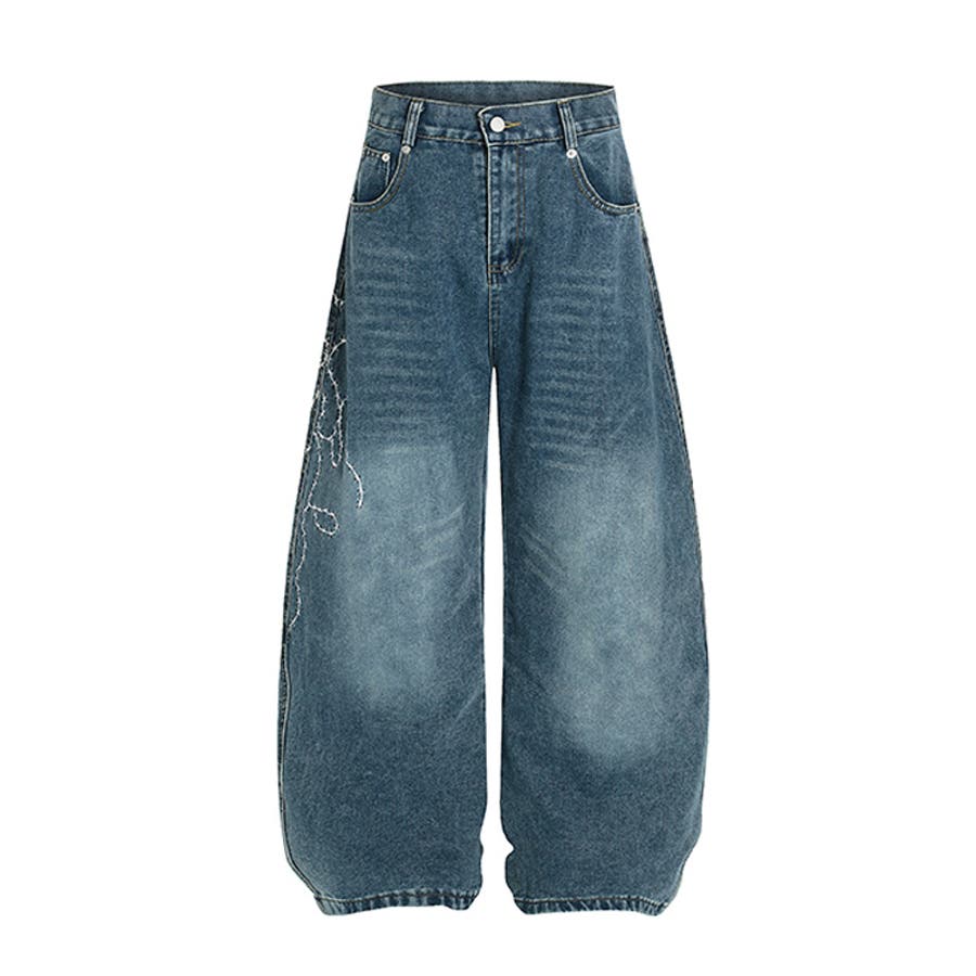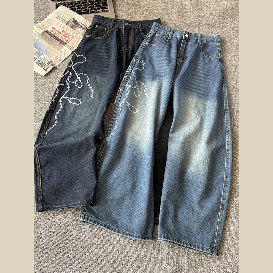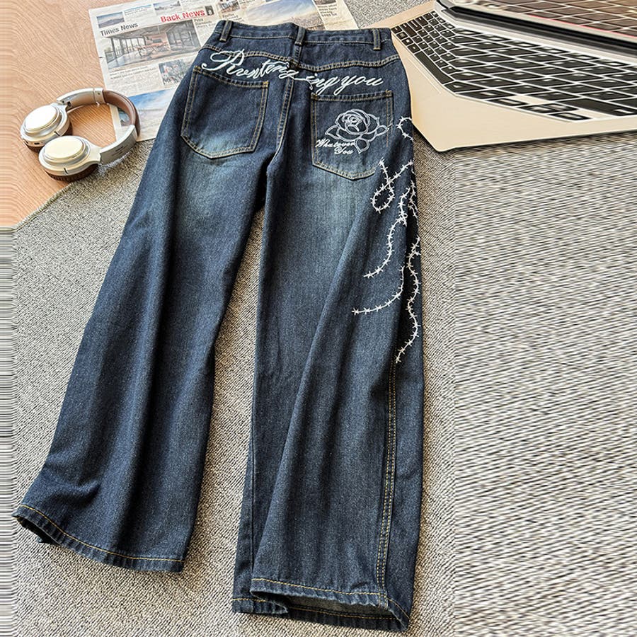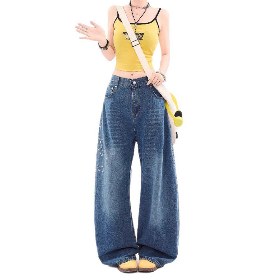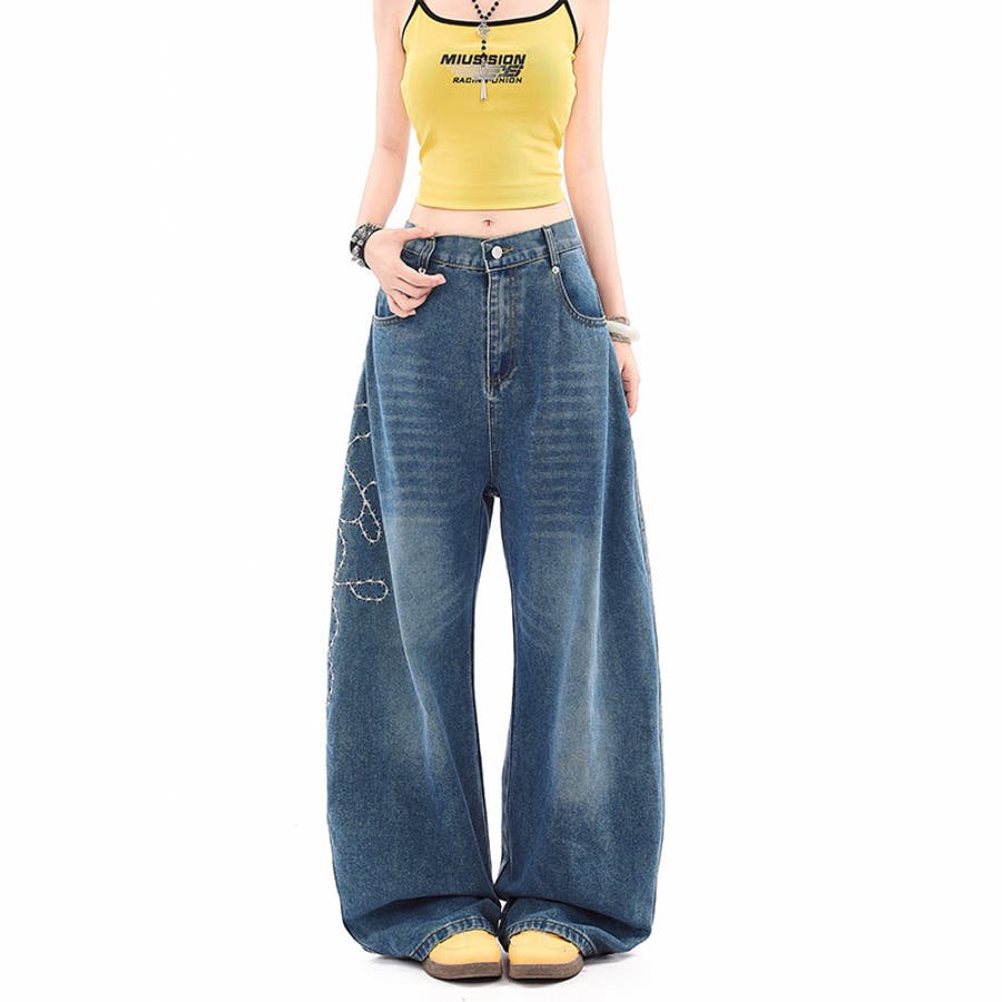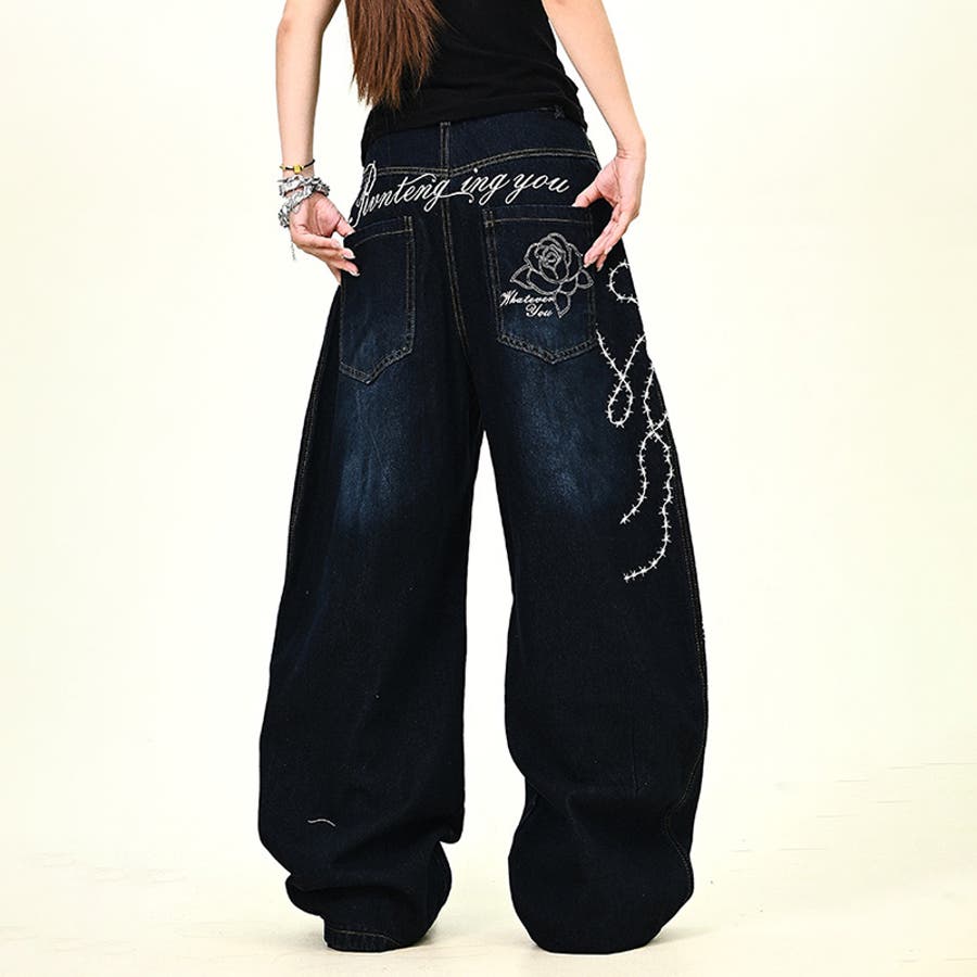 ゆるカワコーデ☆ウォッシュ加工 刺繍ワイドジーンズ