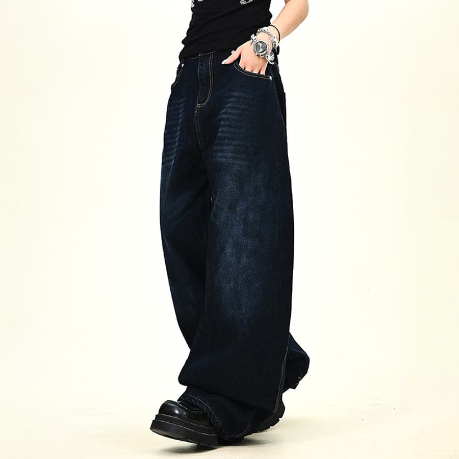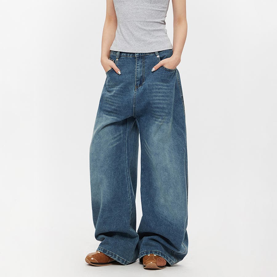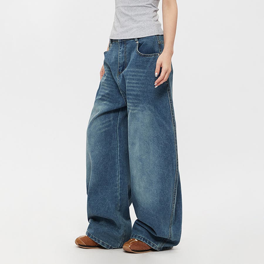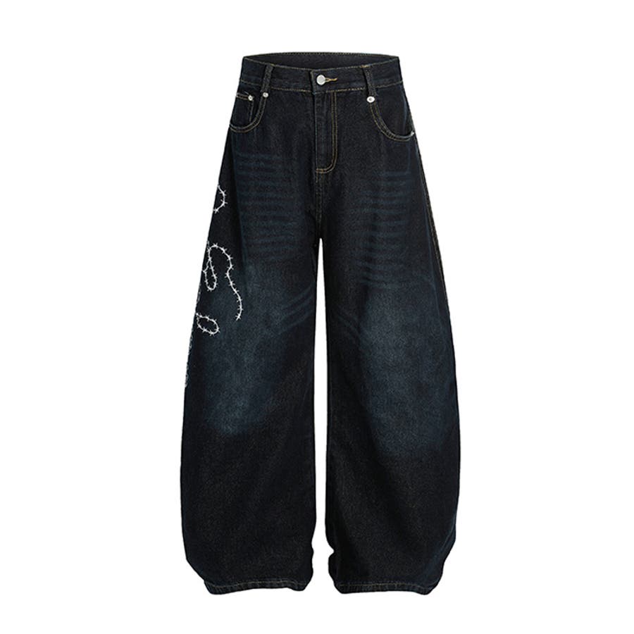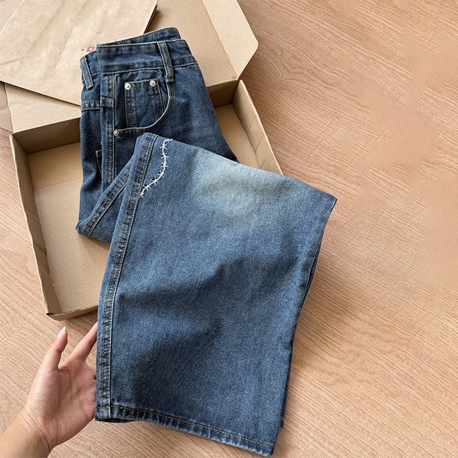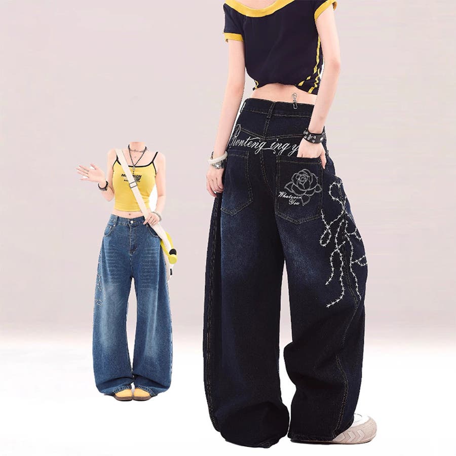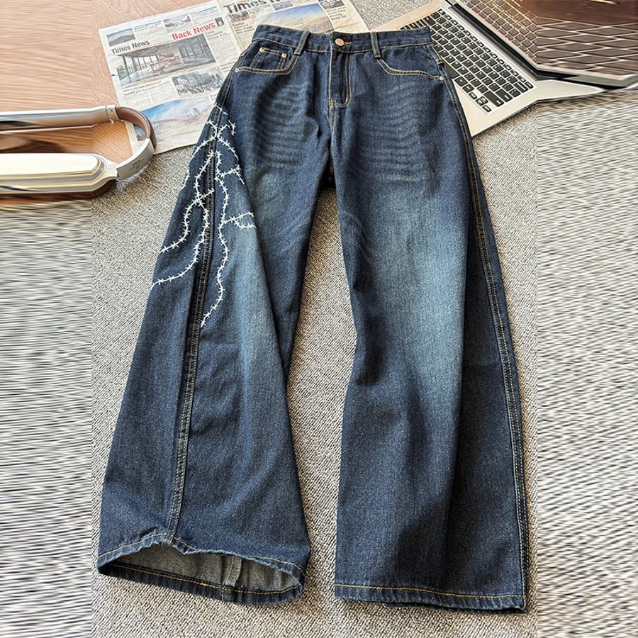 ゆるカワコーデ☆ウォッシュ加工 刺繍ワイドジーンズ