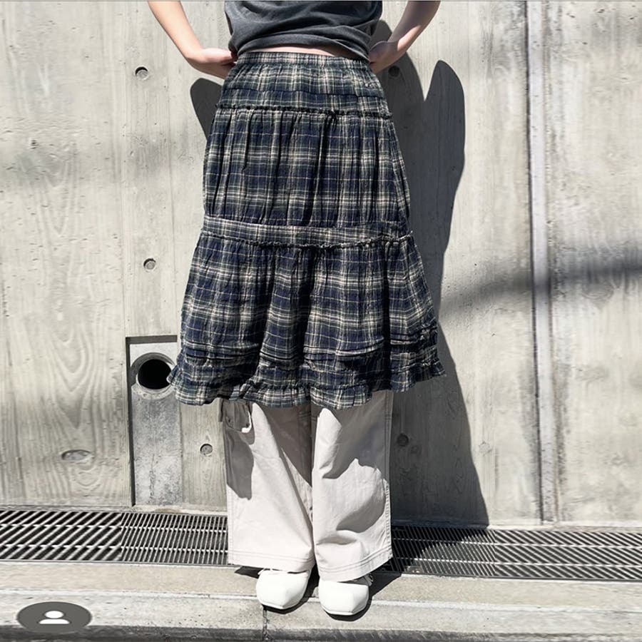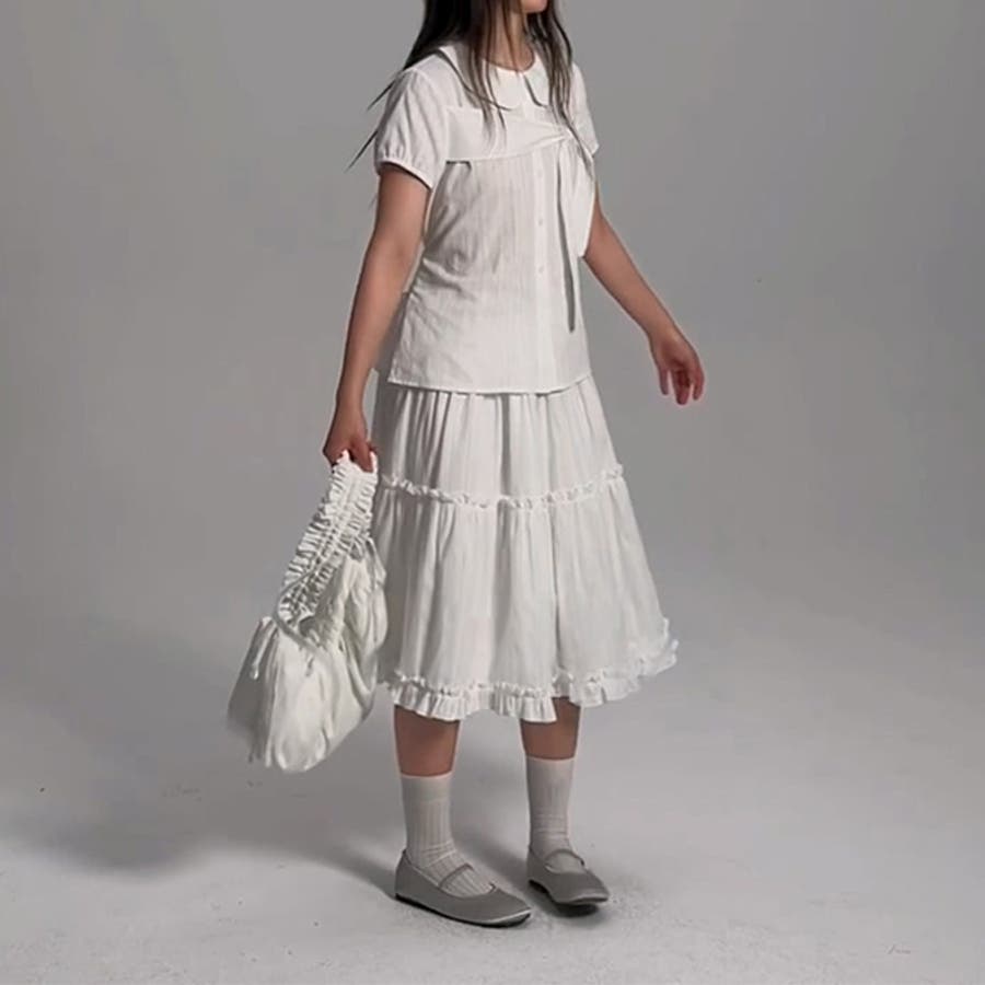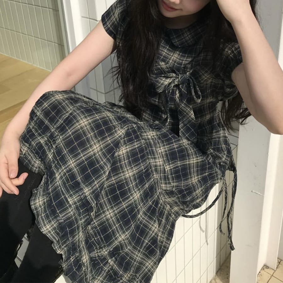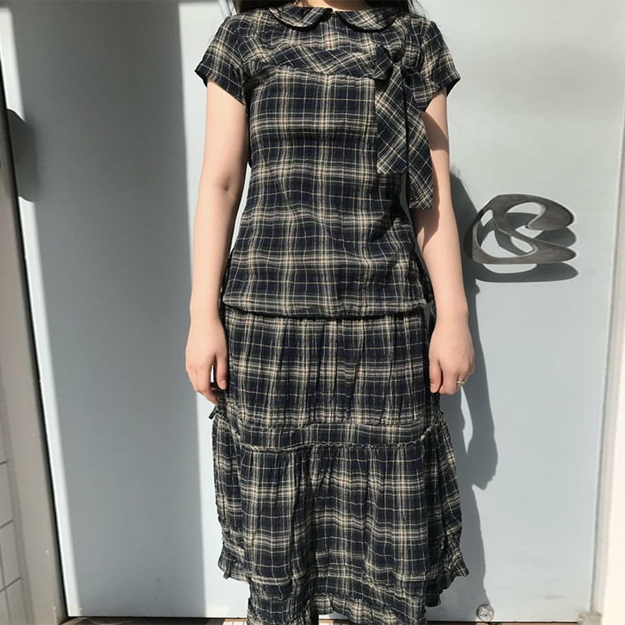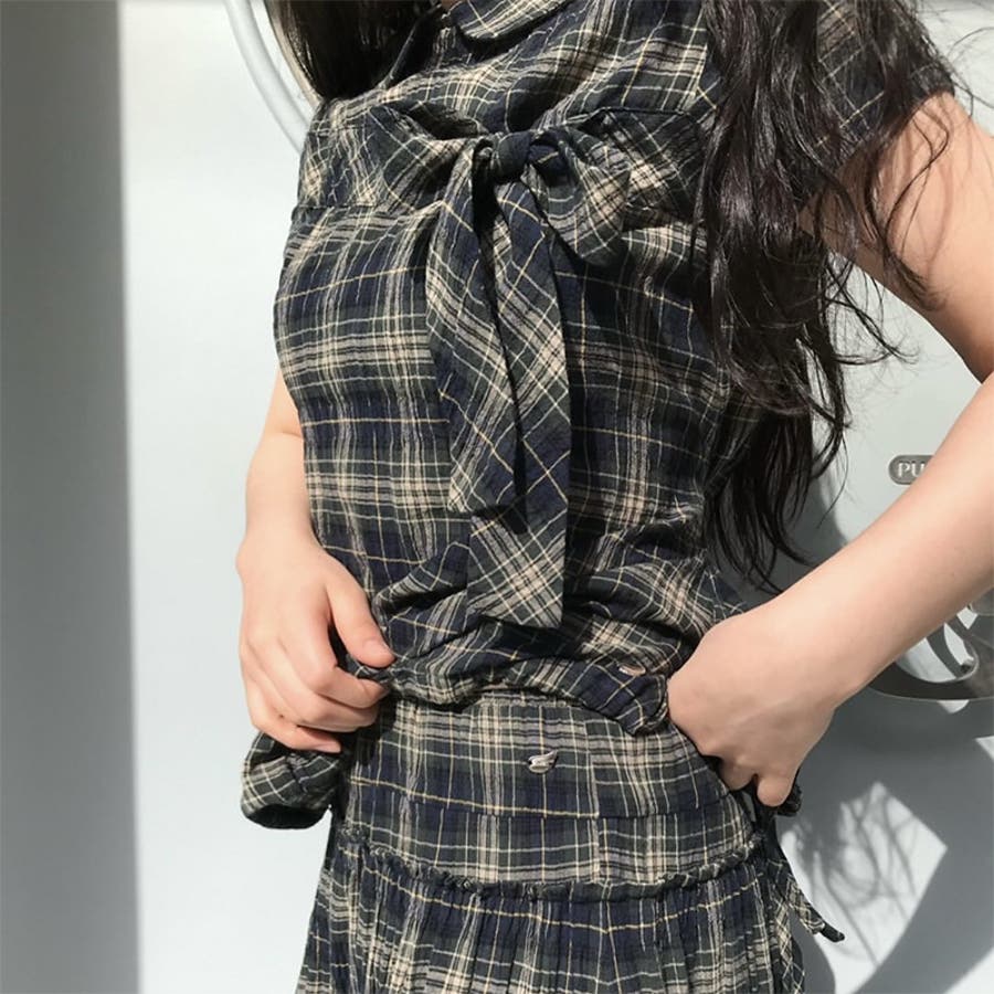 ゆるカワコーデ チェック柄リボン付きワンピース風ブラウス+ミディ丈スカートセット