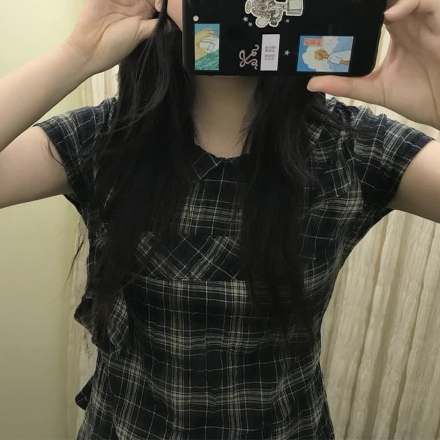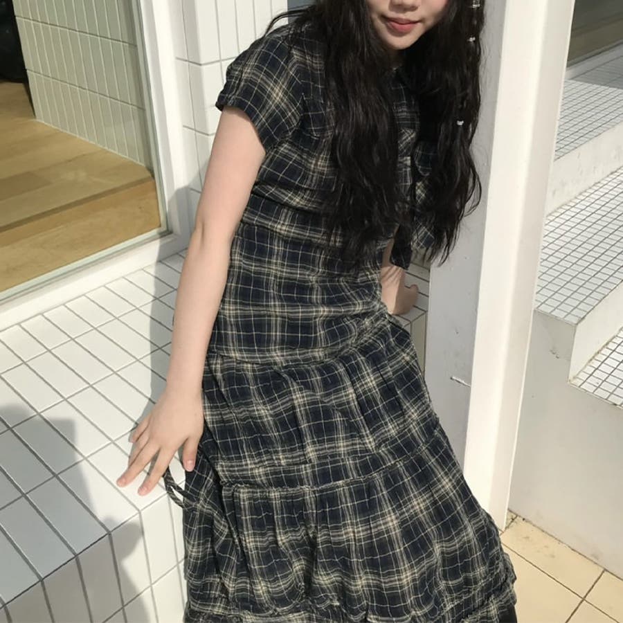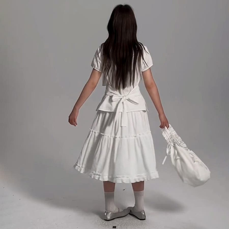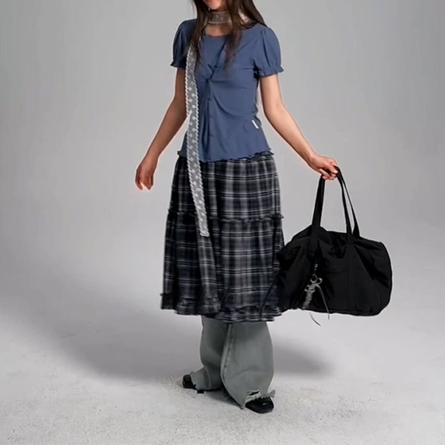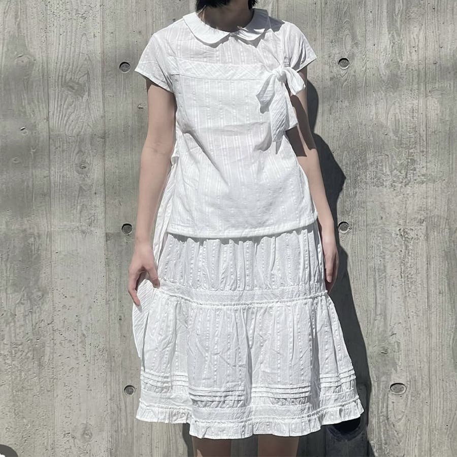 ゆるカワコーデ チェック柄リボン付きワンピース風ブラウス+ミディ丈スカートセット