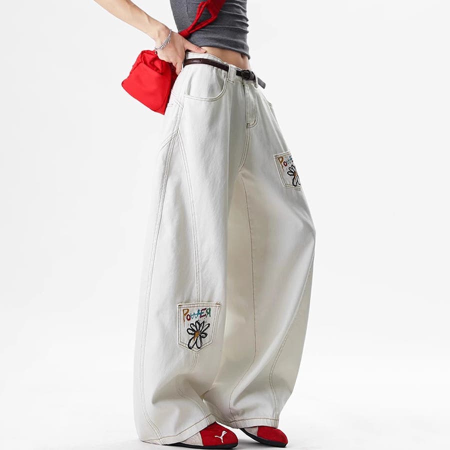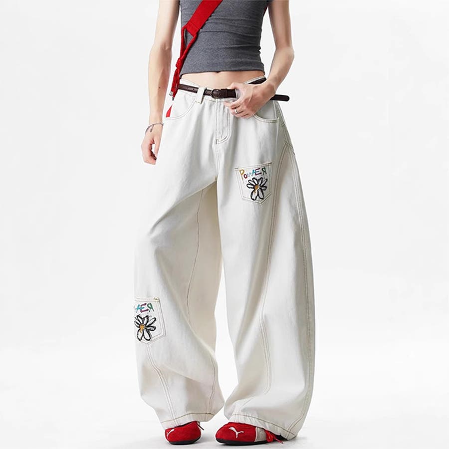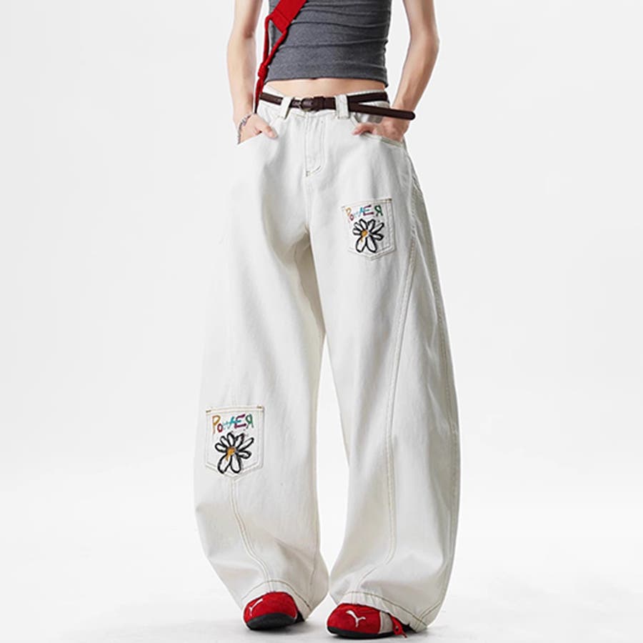 ゆるカワコーデ デニムパンツ フラワー刺繍