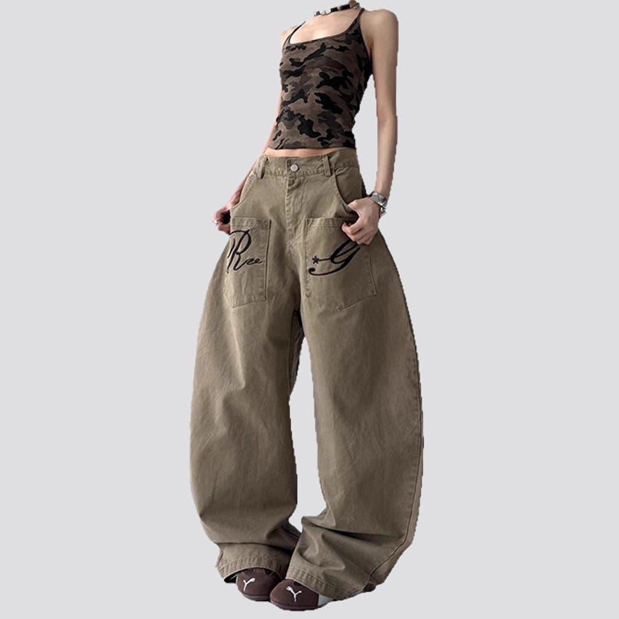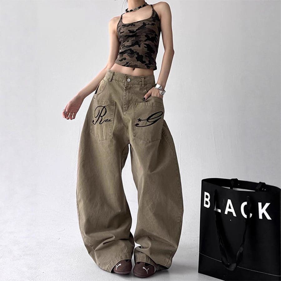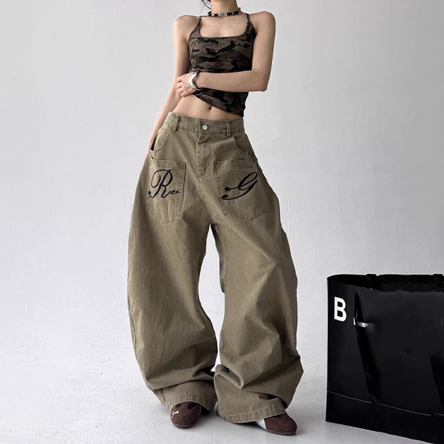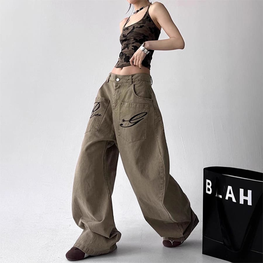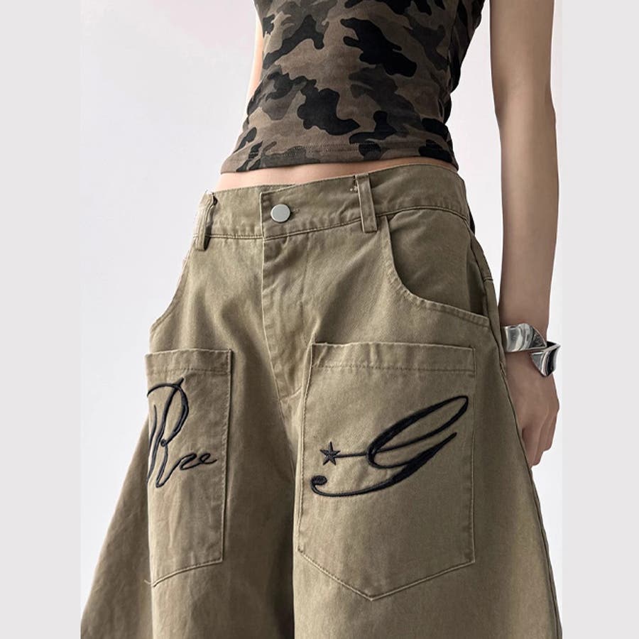 ゆるカワコーデ☆デニムパンツ ロゴ刺繍入り カーブデザイン ワイドカーゴタイプ