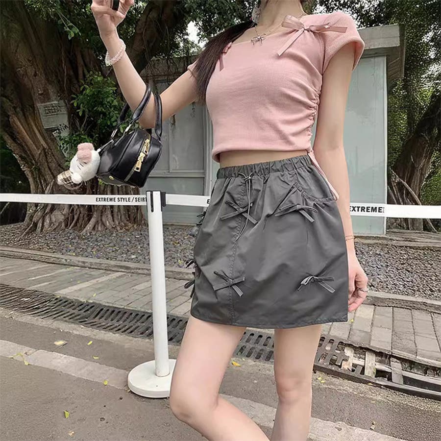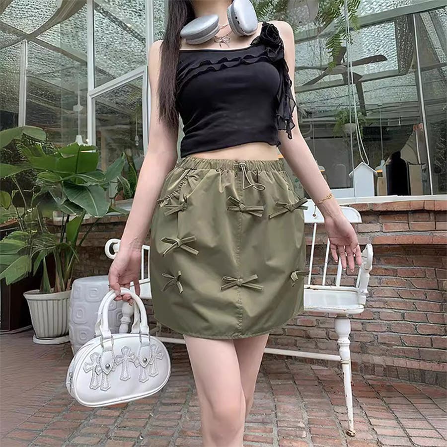 ゆるカワコーデ☆カーゴミニスカート リボン付き バルーンシルエット Aライン