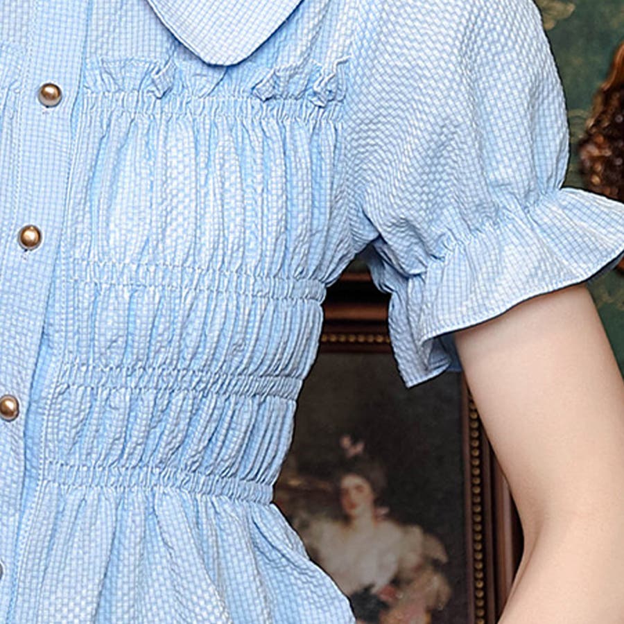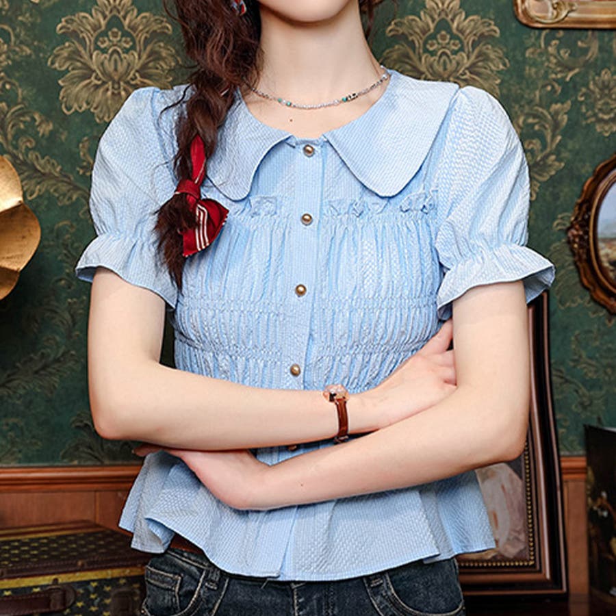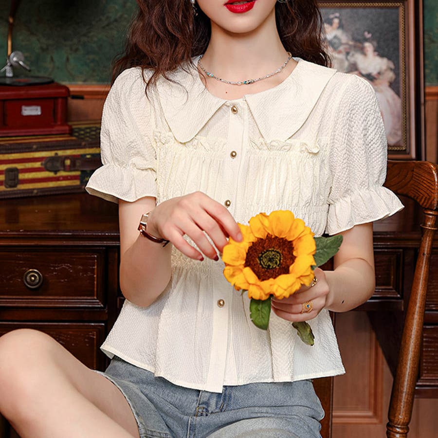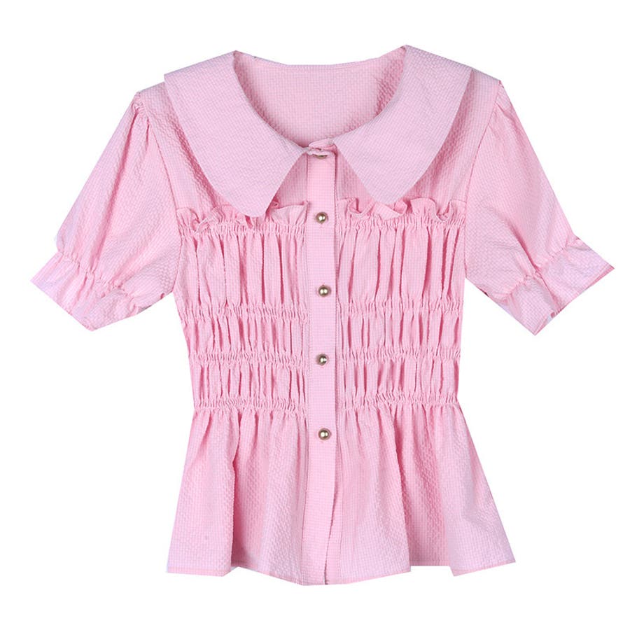 ゆるカワコーデ☆シャーリング入り フリルカラー 半袖ブラウス