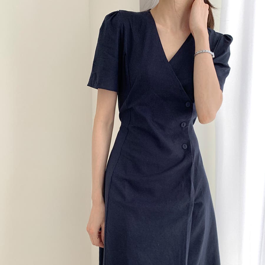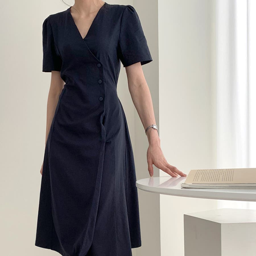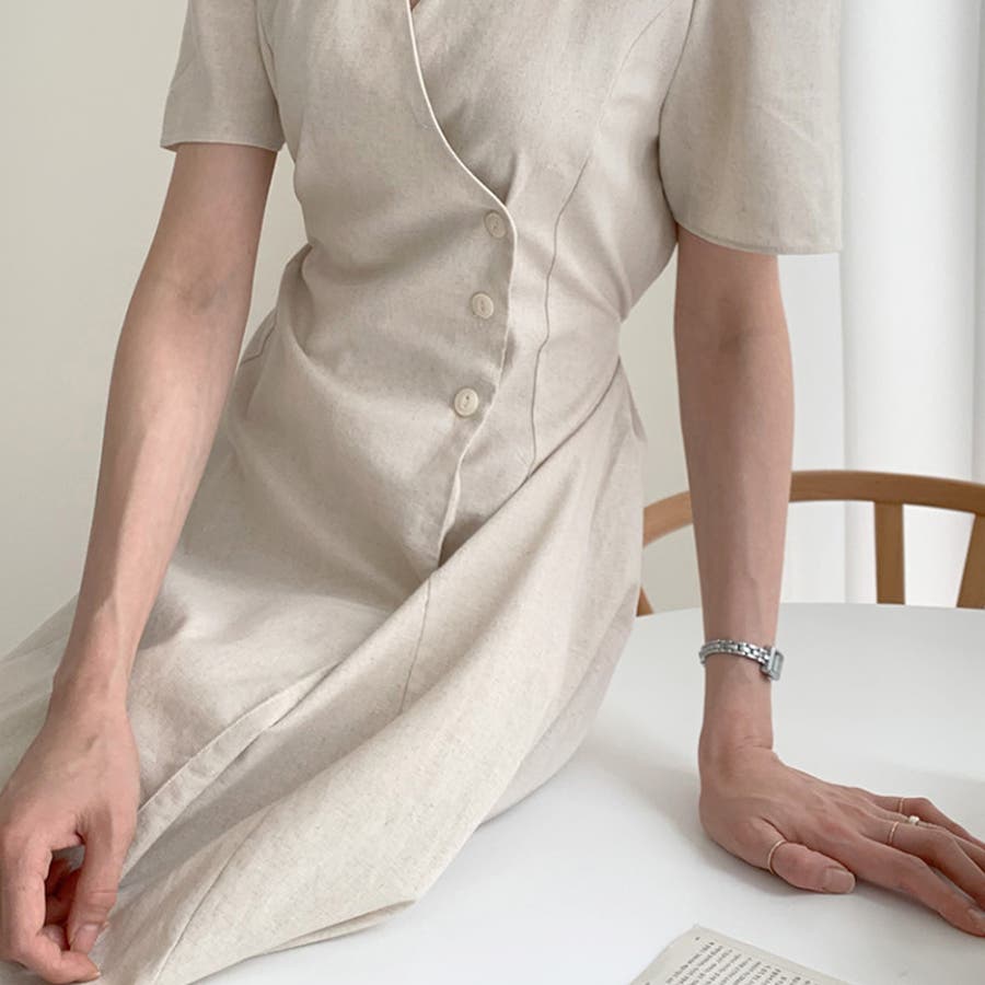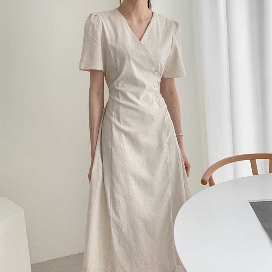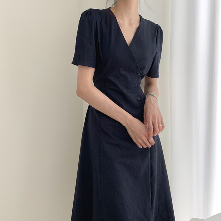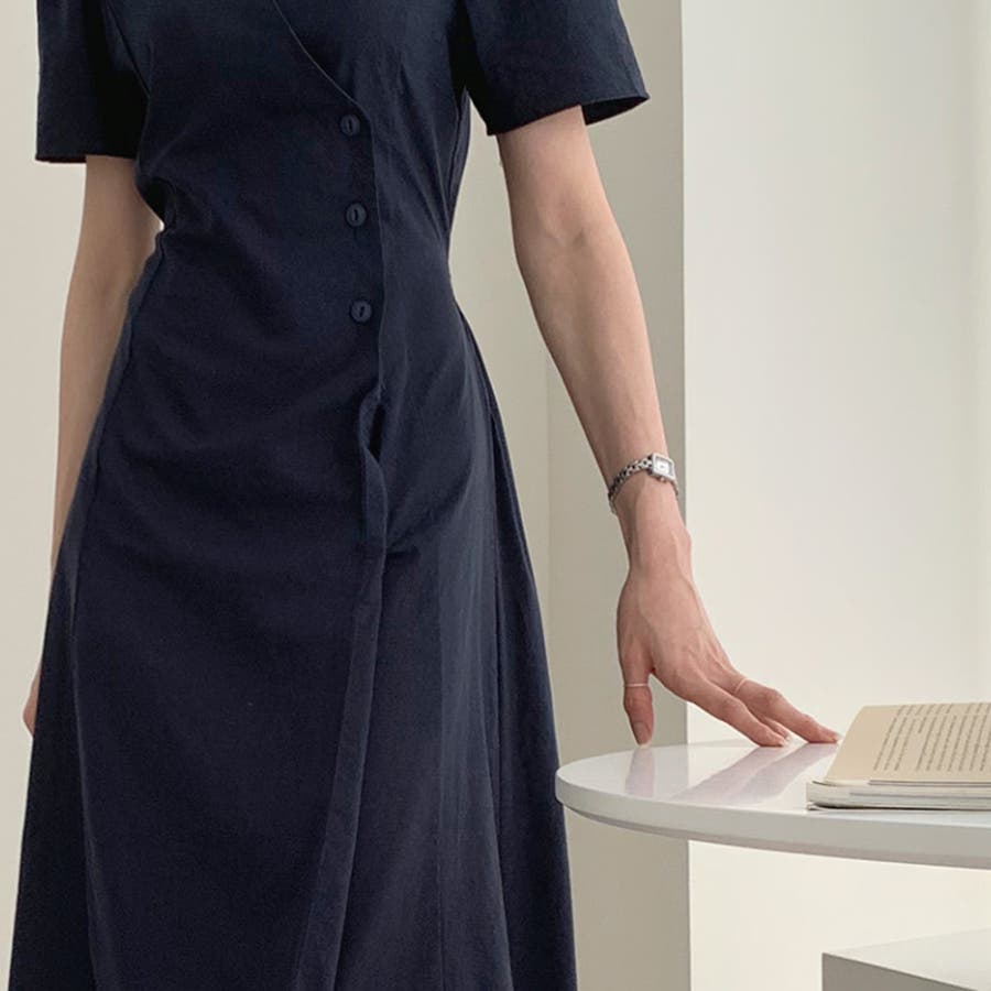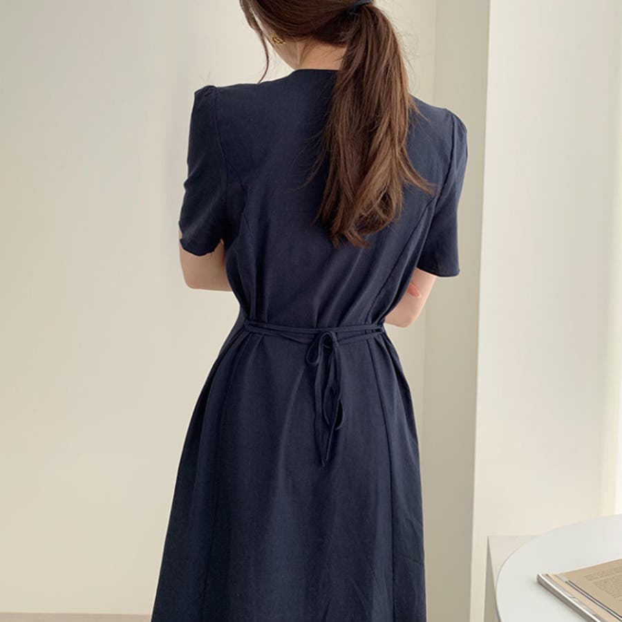 上品さフレンチ風ミニマリズムウェストボタンデザインワンピース