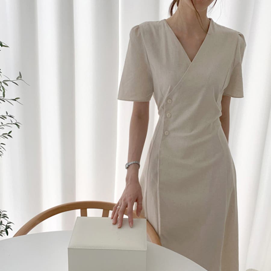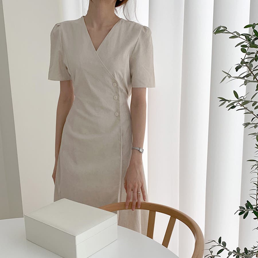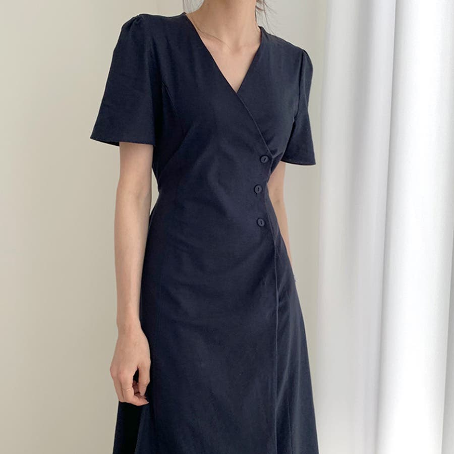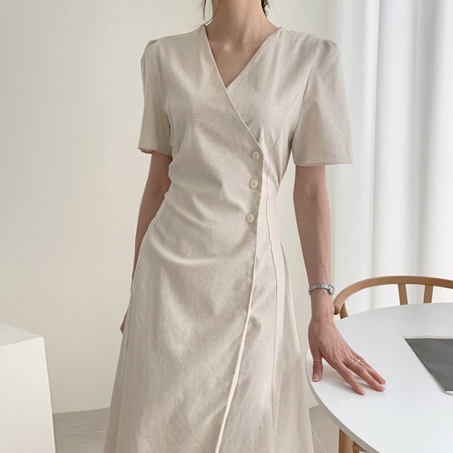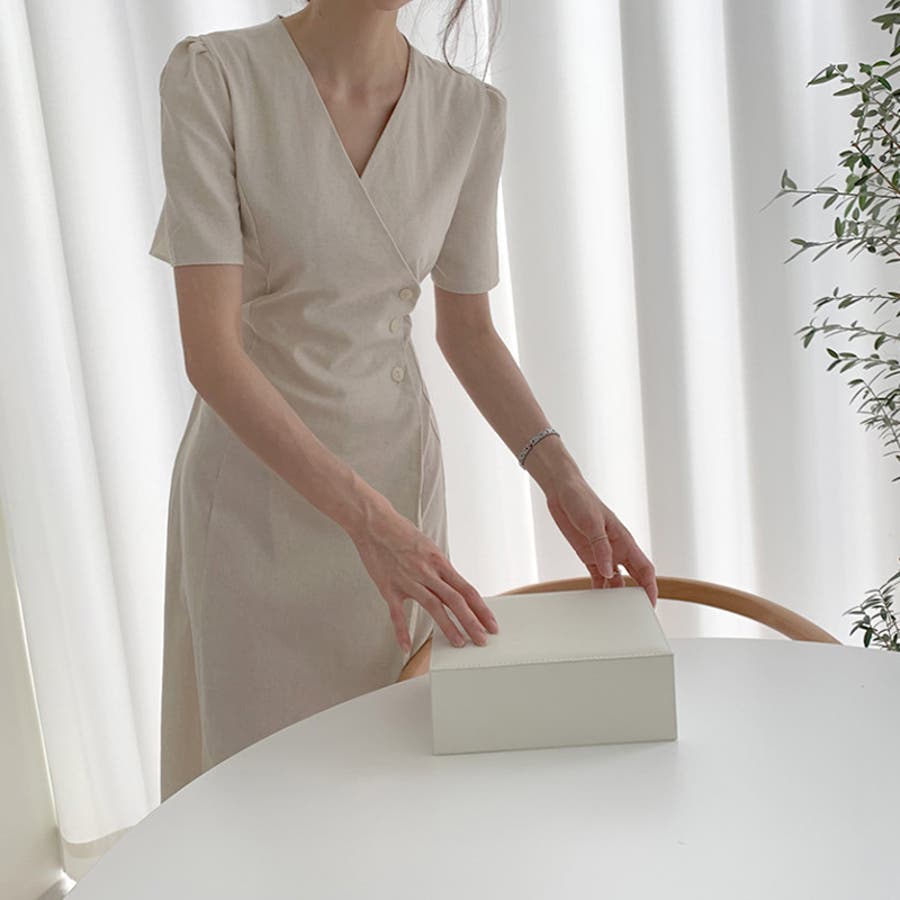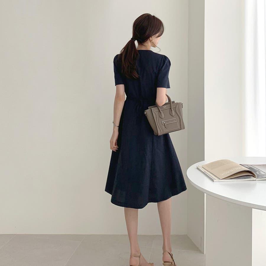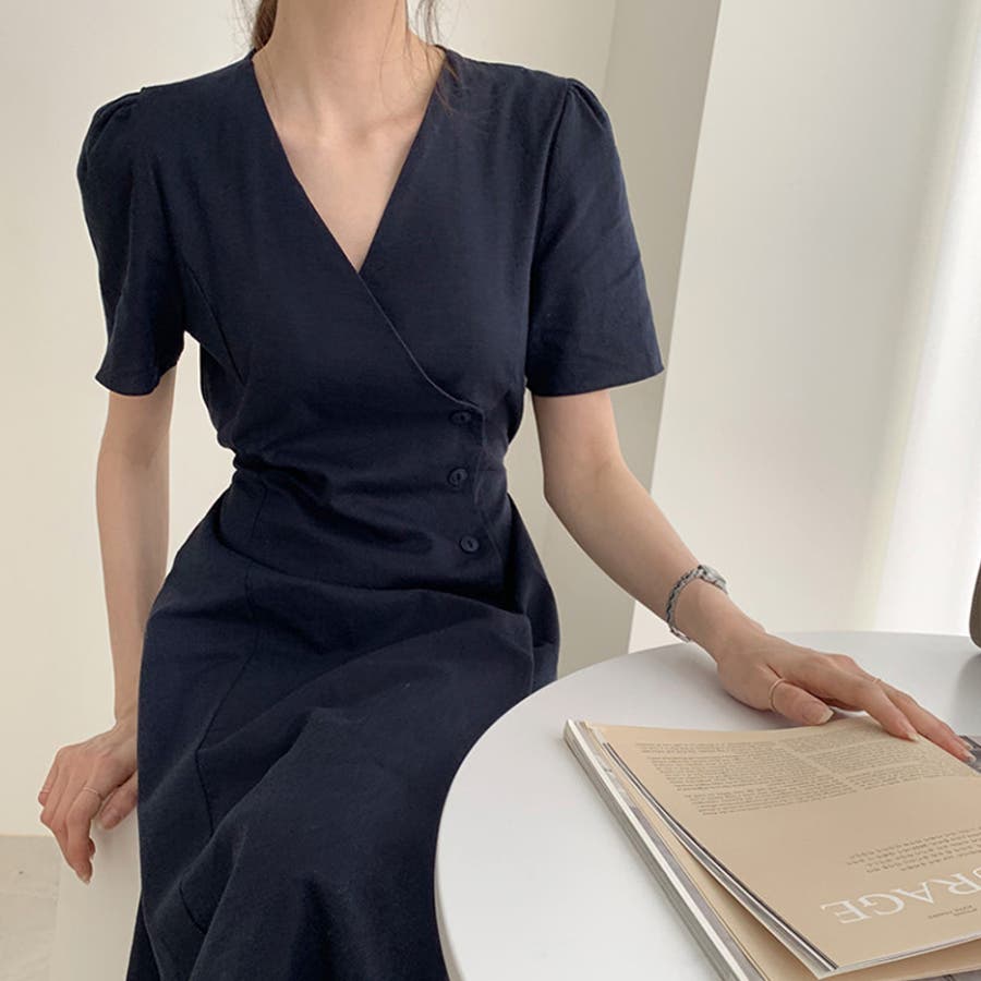 上品さフレンチ風ミニマリズムウェストボタンデザインワンピース