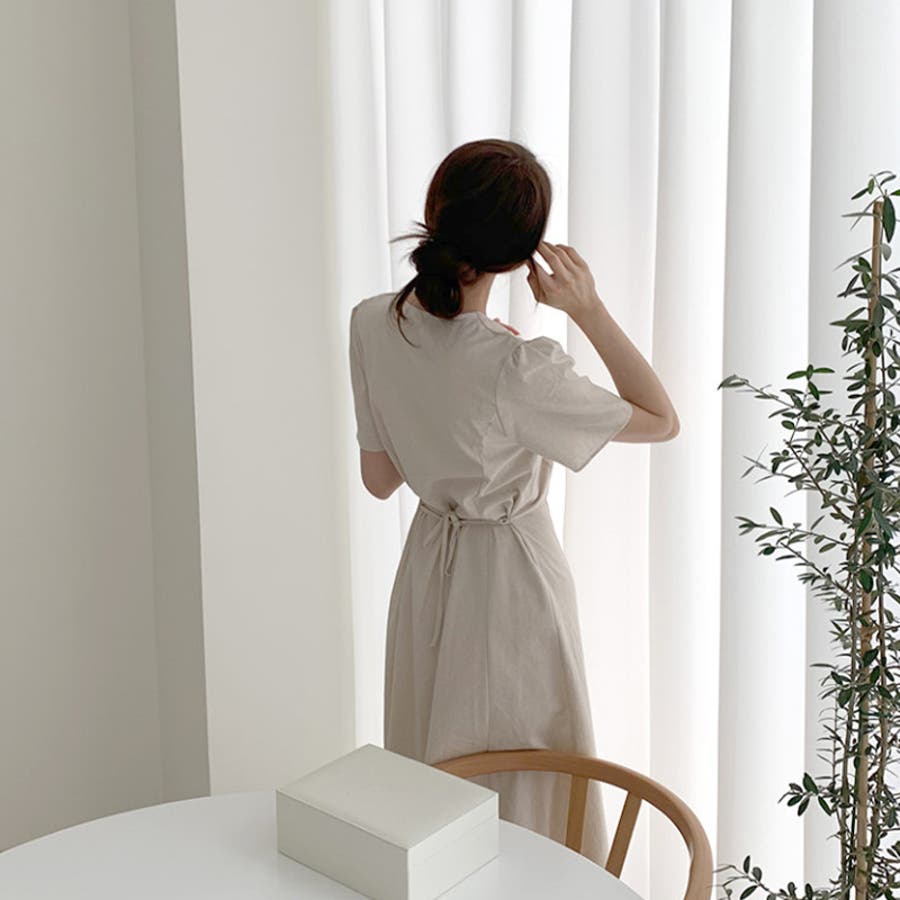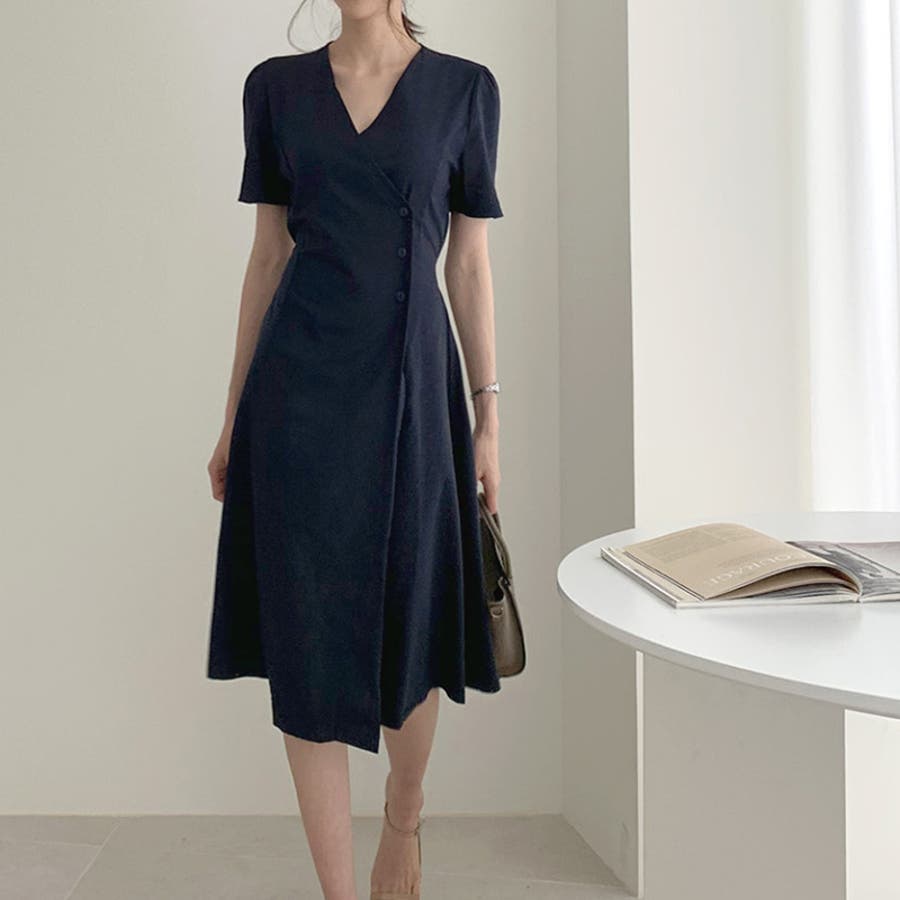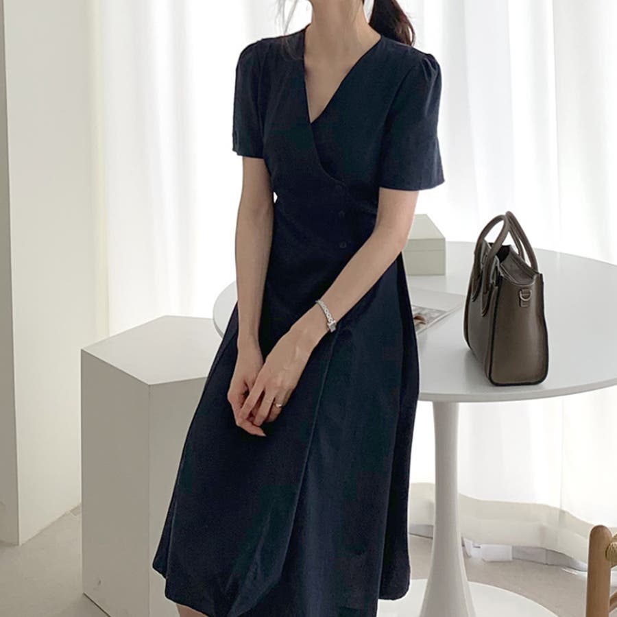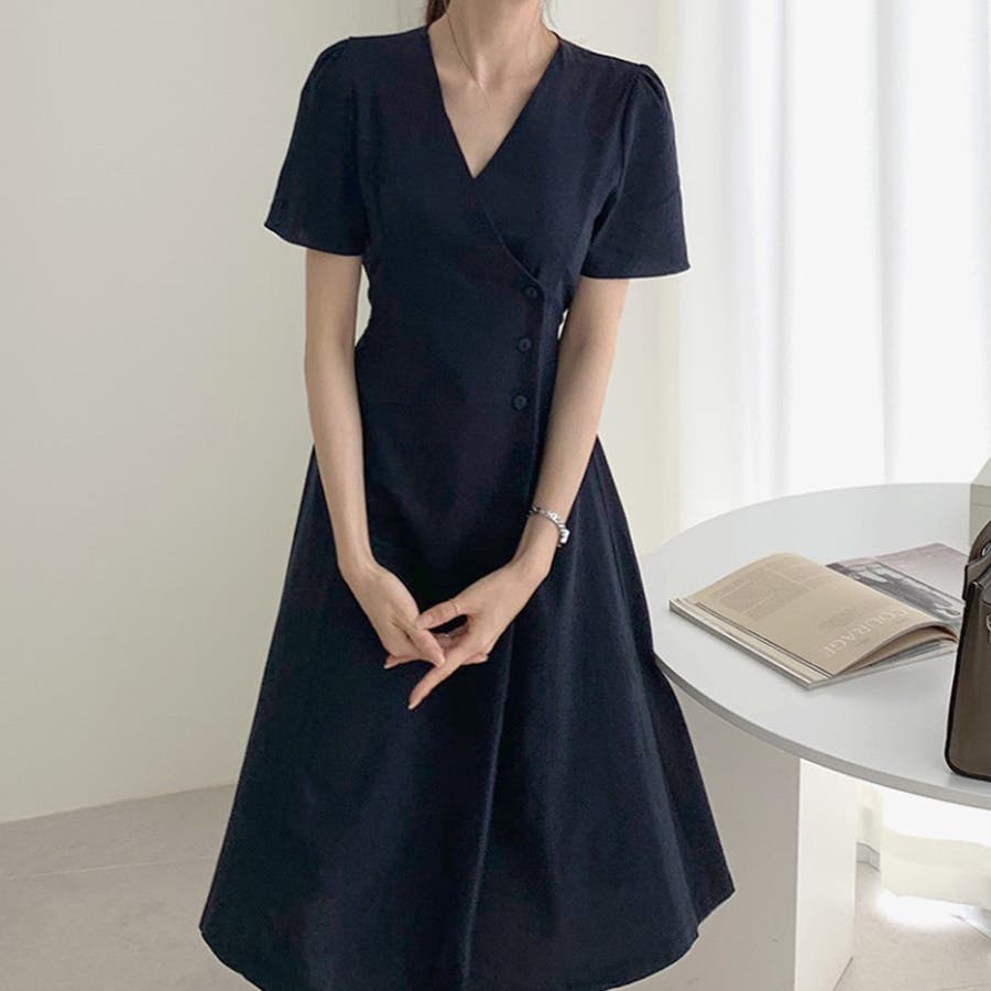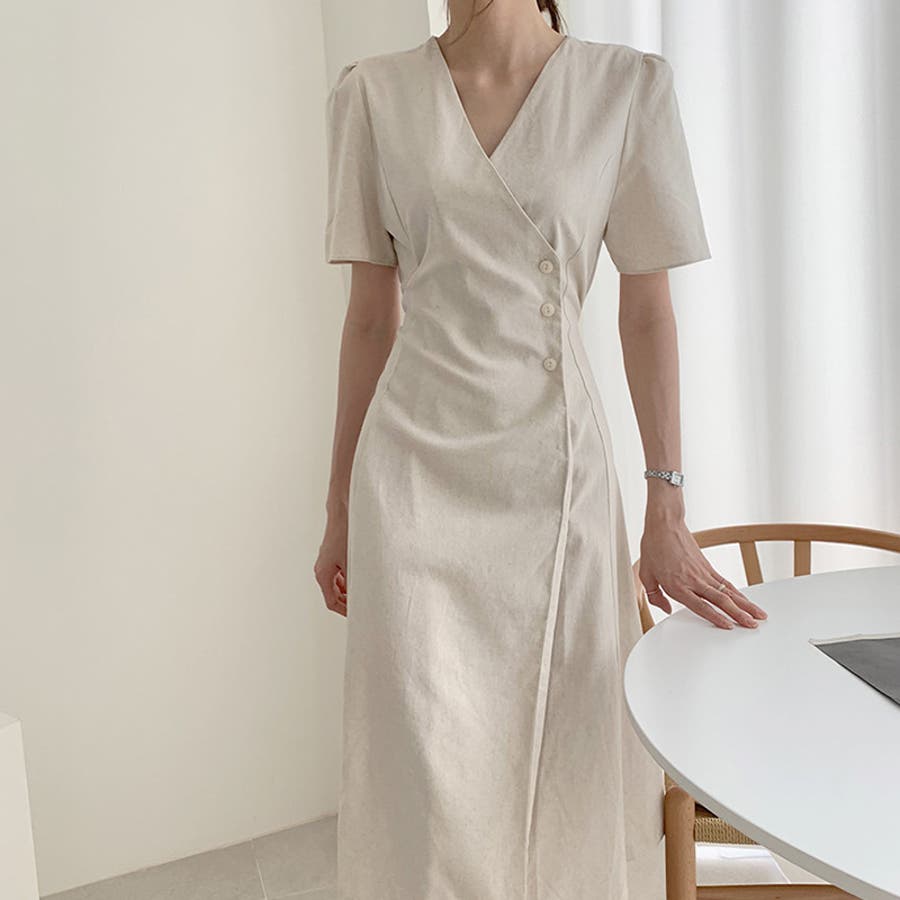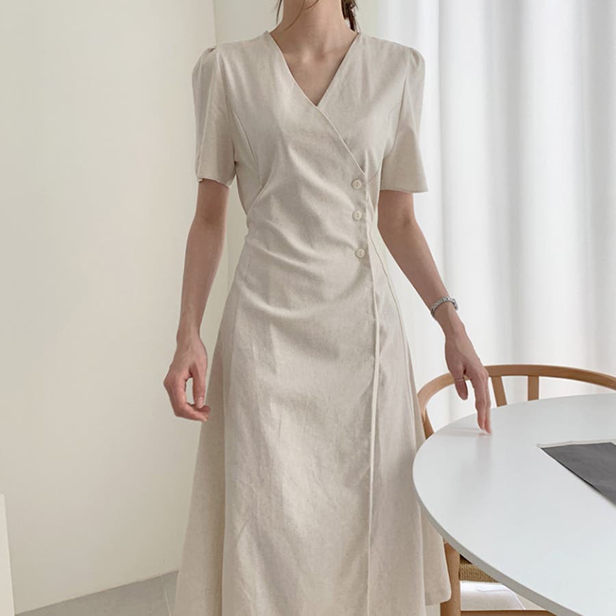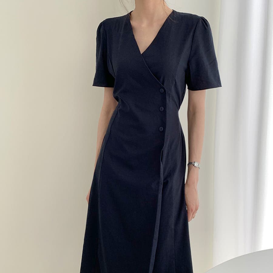 上品さフレンチ風ミニマリズムウェストボタンデザインワンピース