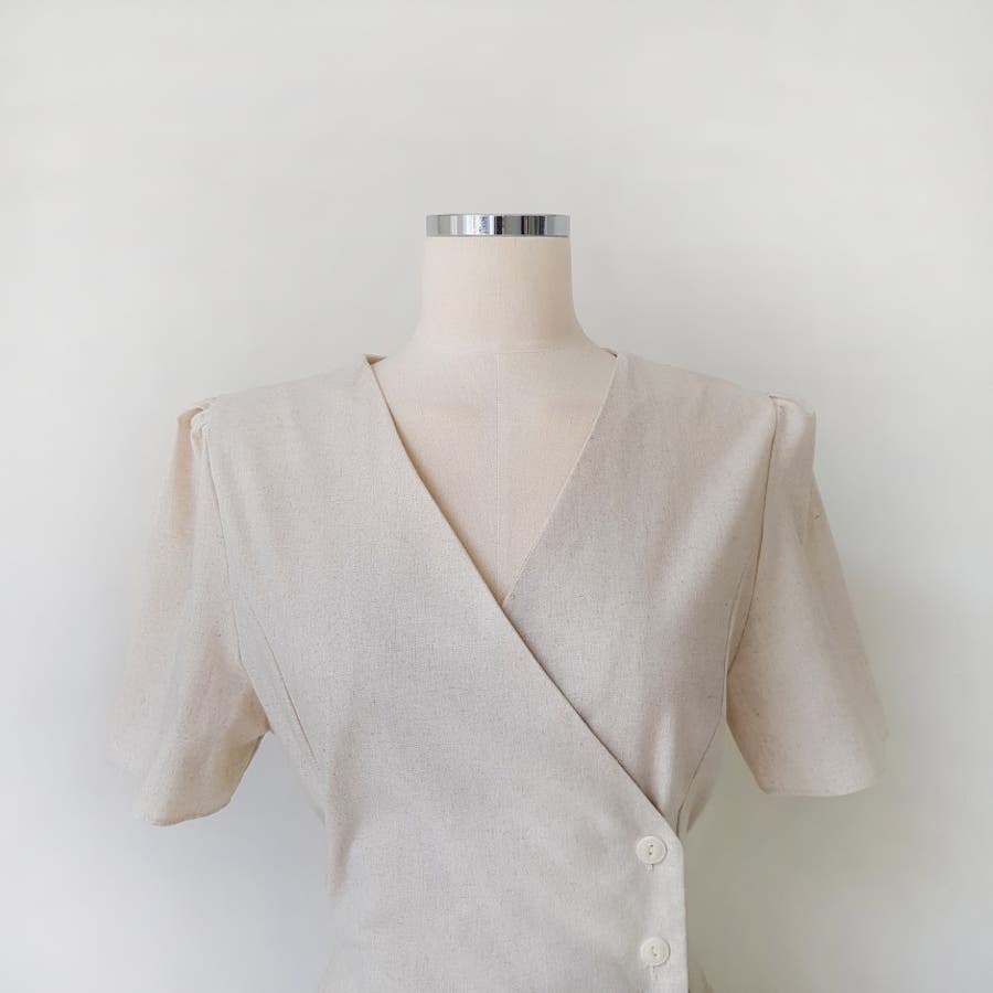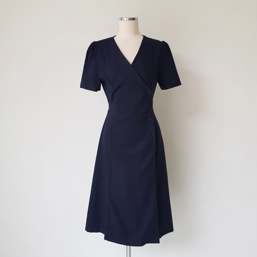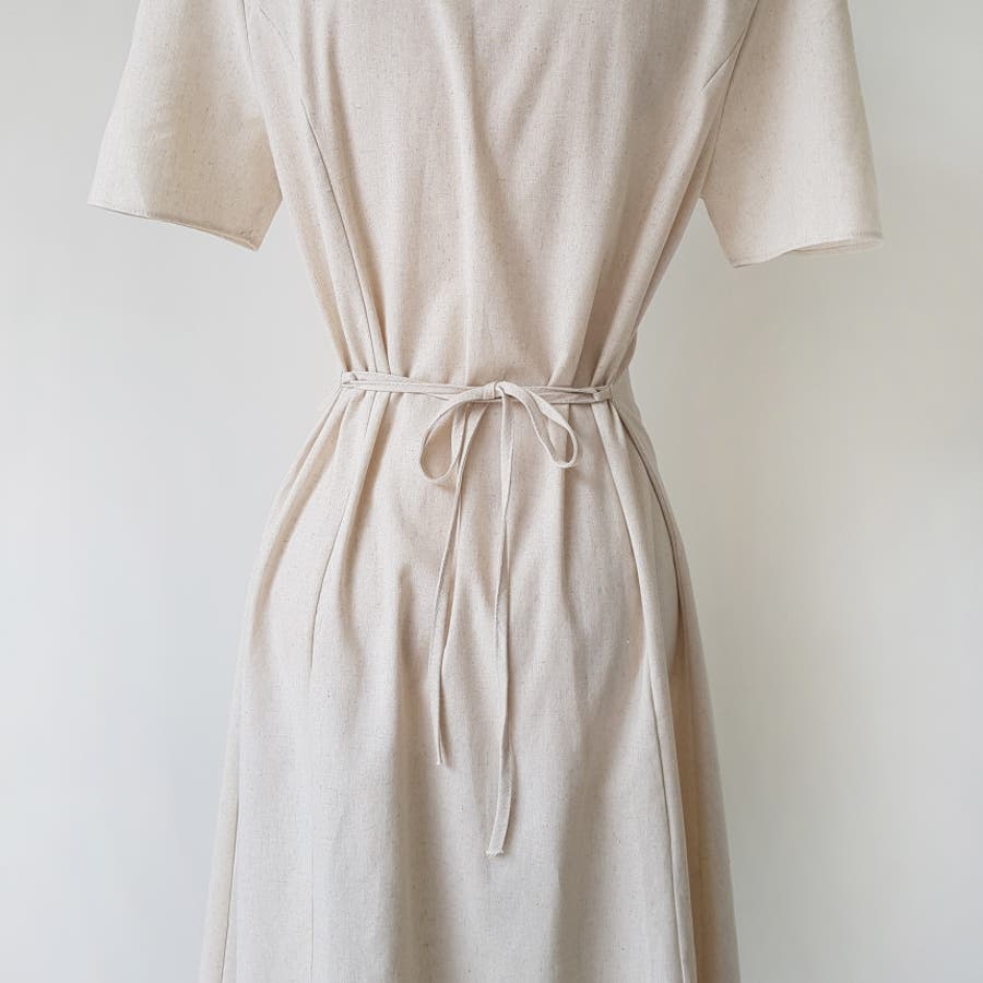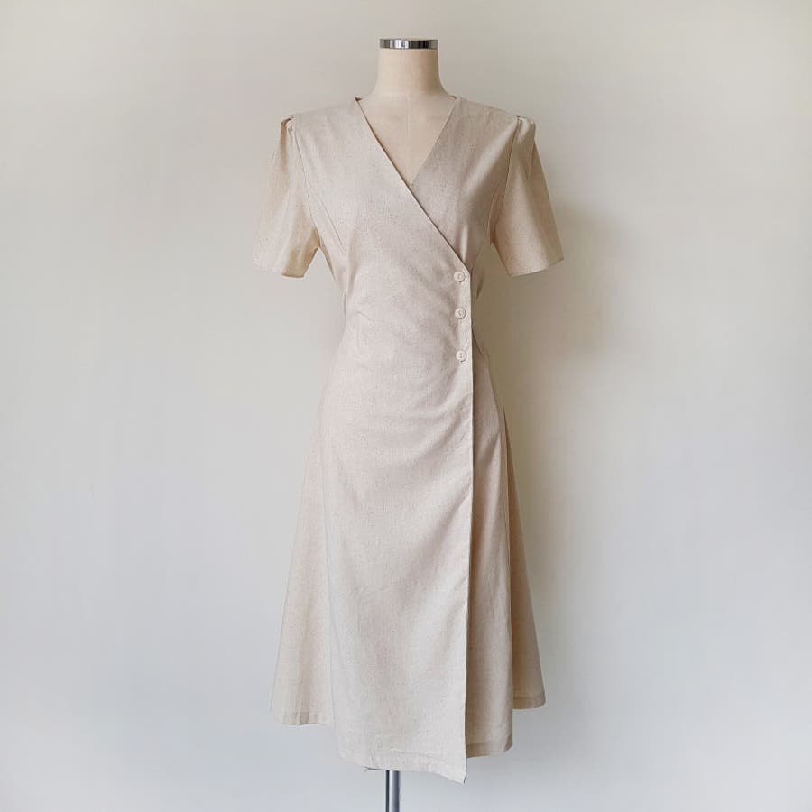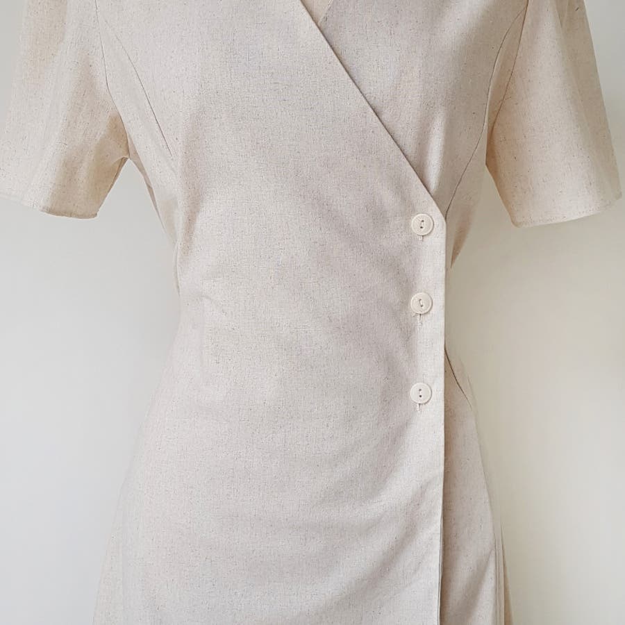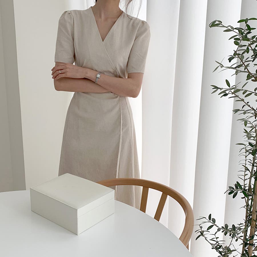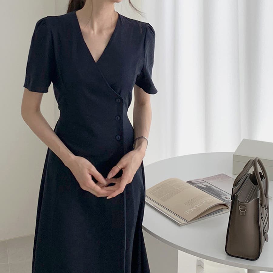 上品さフレンチ風ミニマリズムウェストボタンデザインワンピース