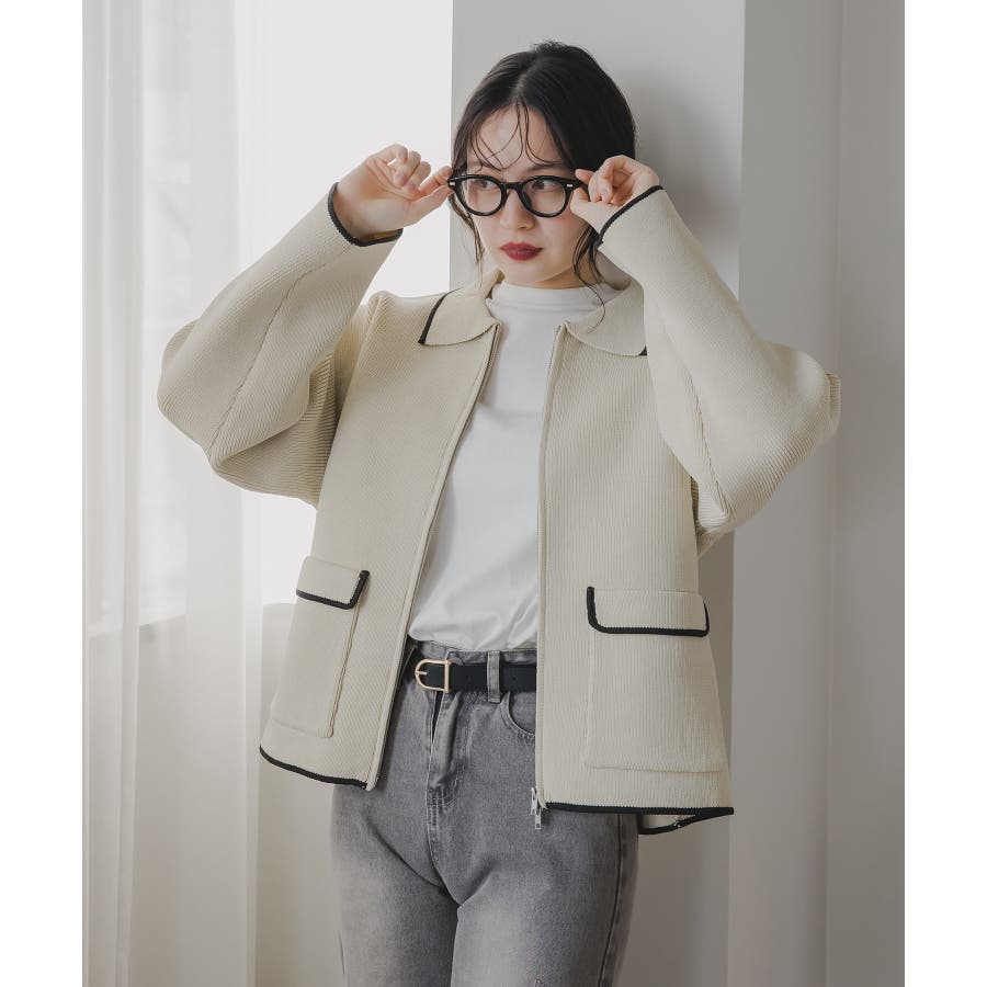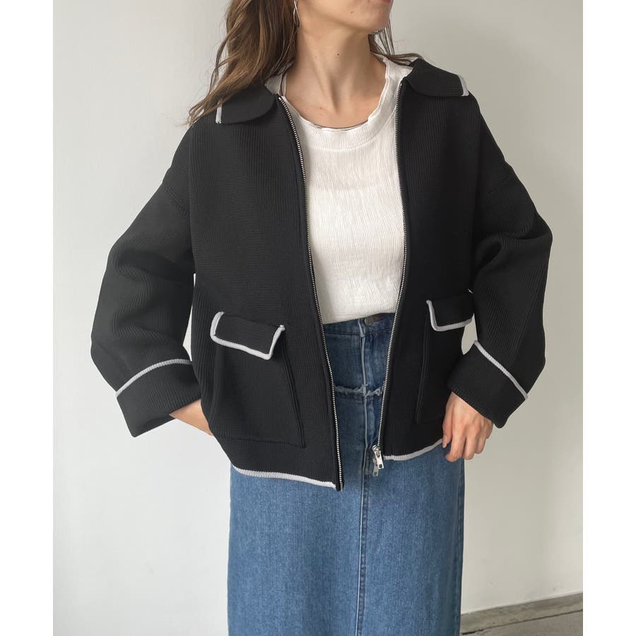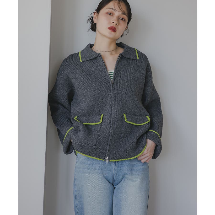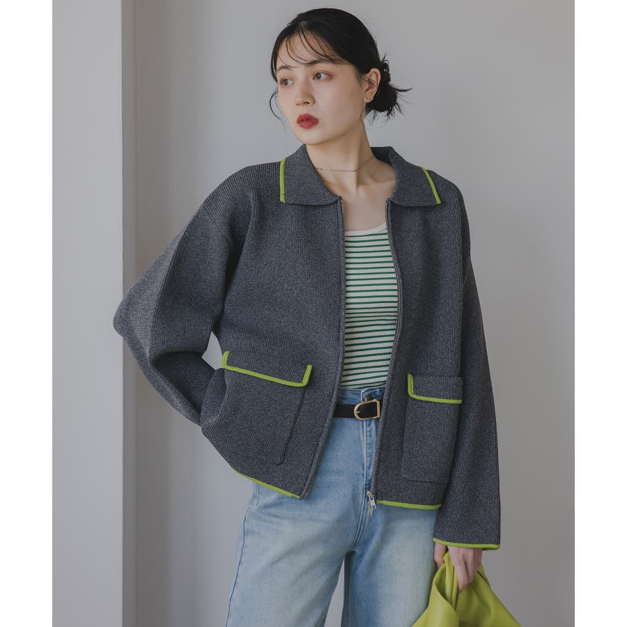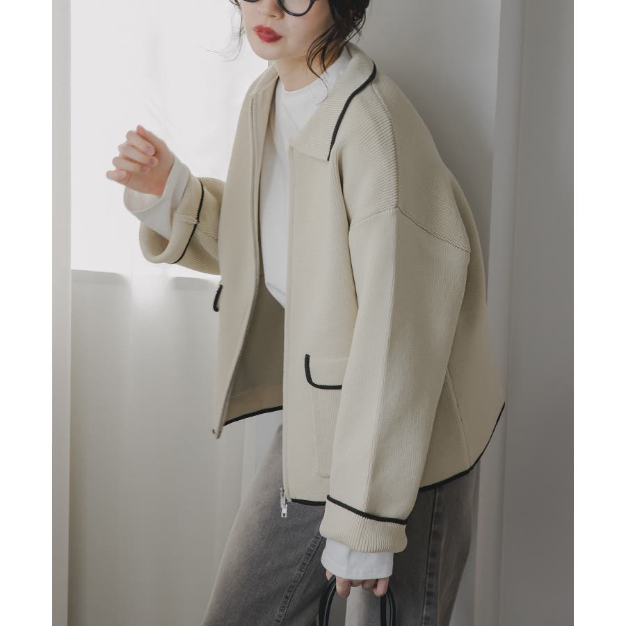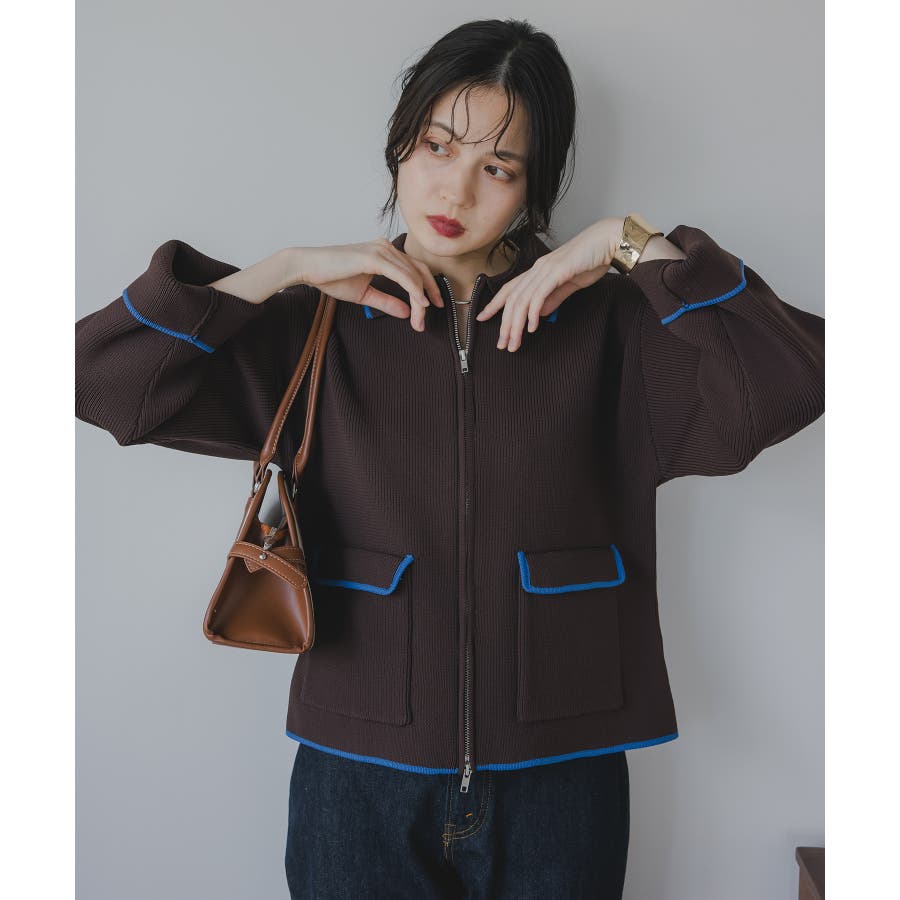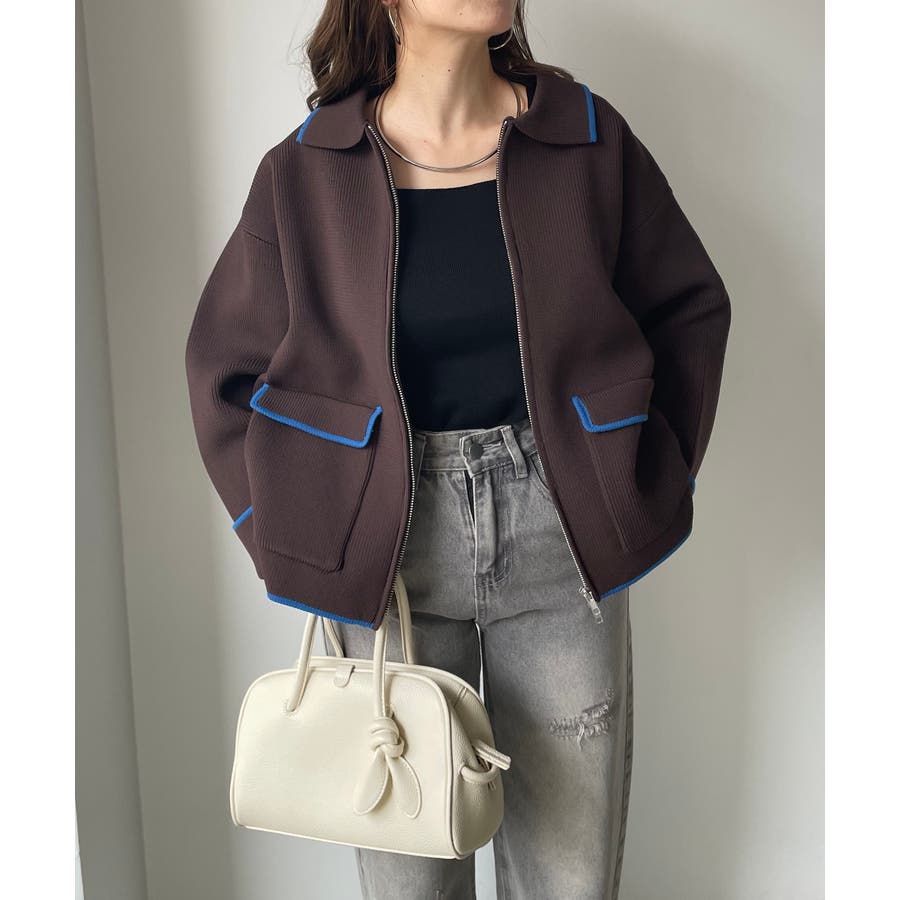 ・トレンド感のある襟付きのデザインと配色使いがポイントのニットブルゾン。