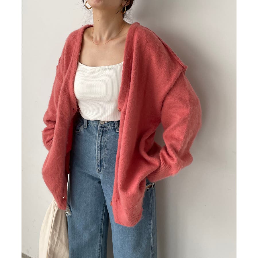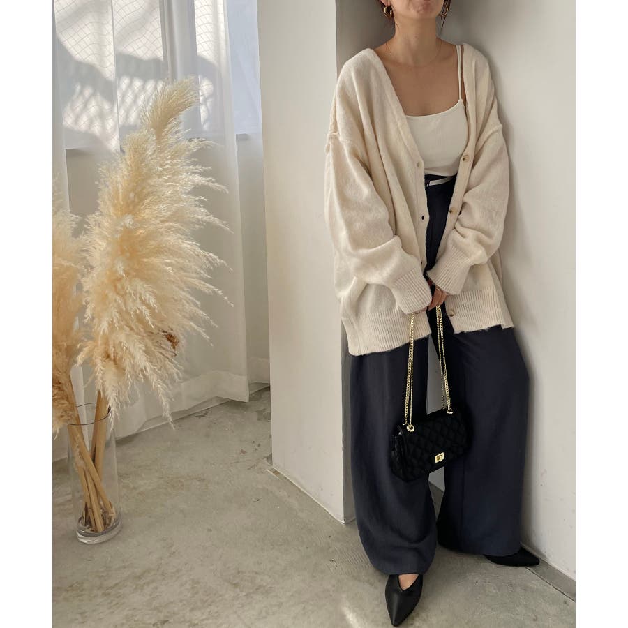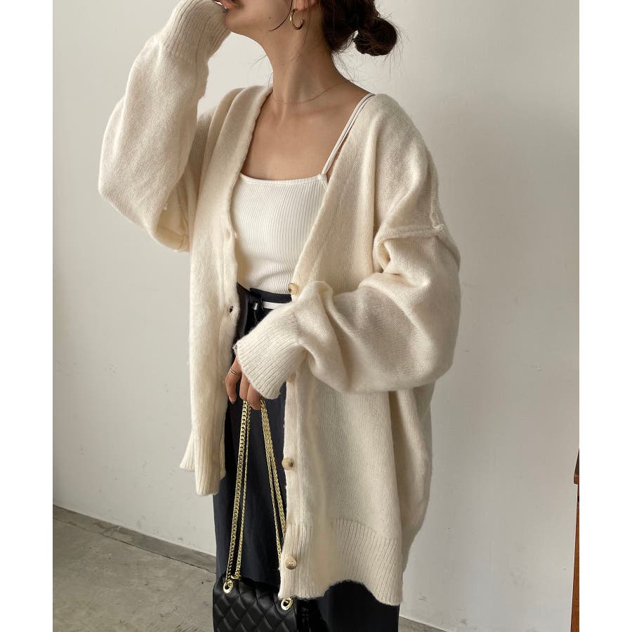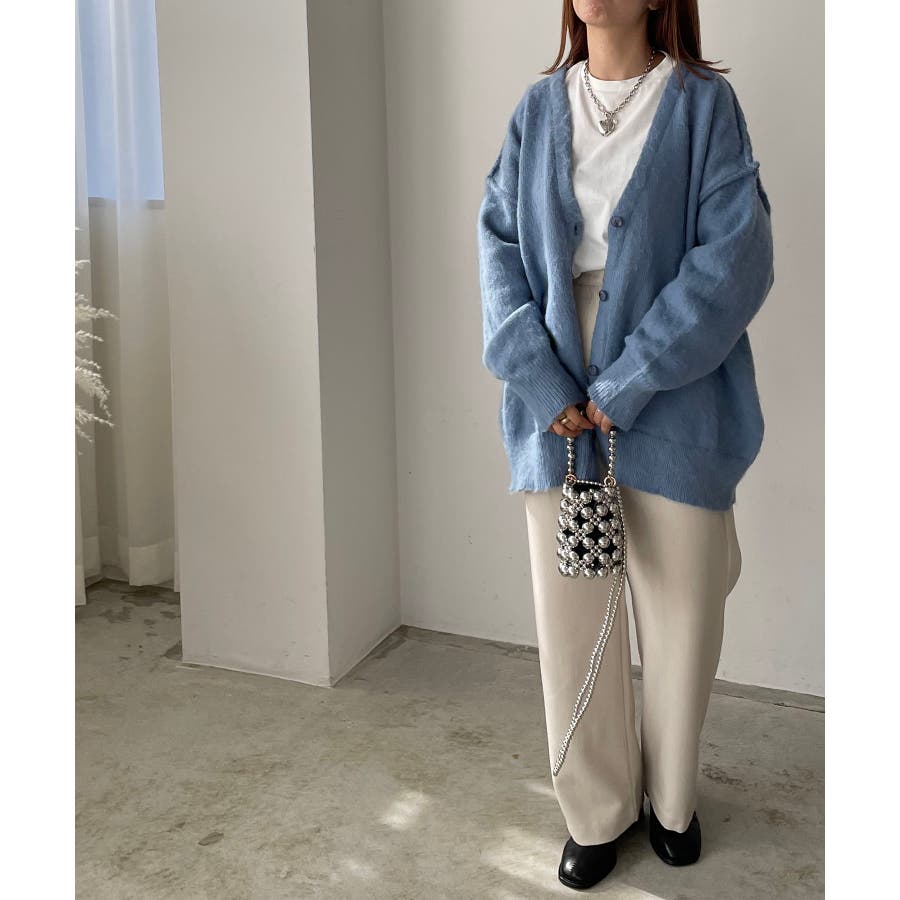1枚で可愛らしい印象になるカーディガンなので、レザーブーツなど少しハードなアイテムと合わせてバランスをとったスタイリングもおすすめです。
