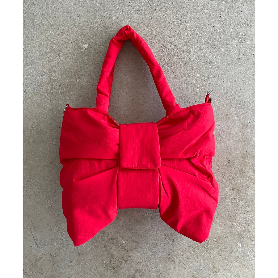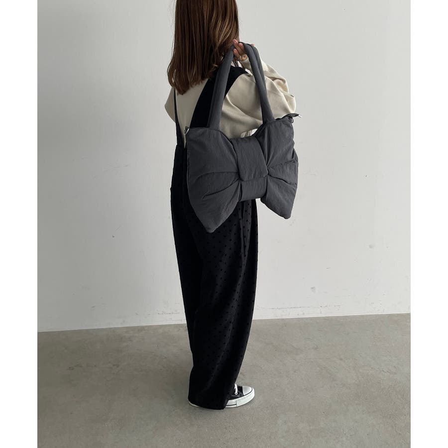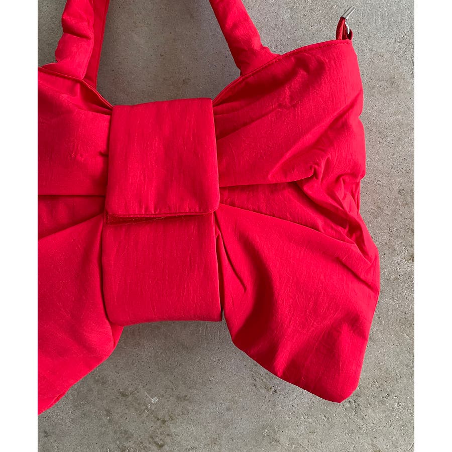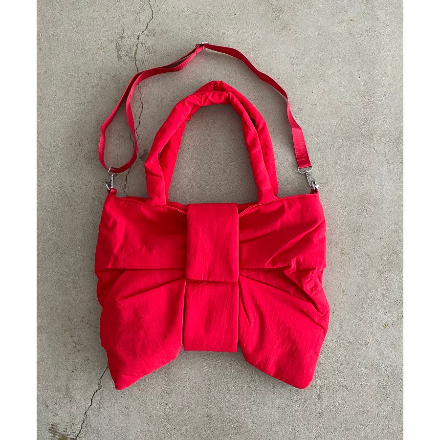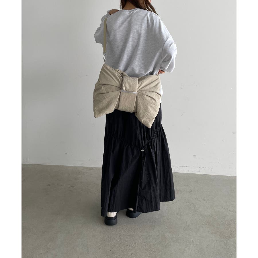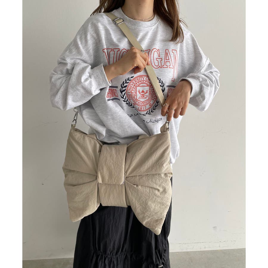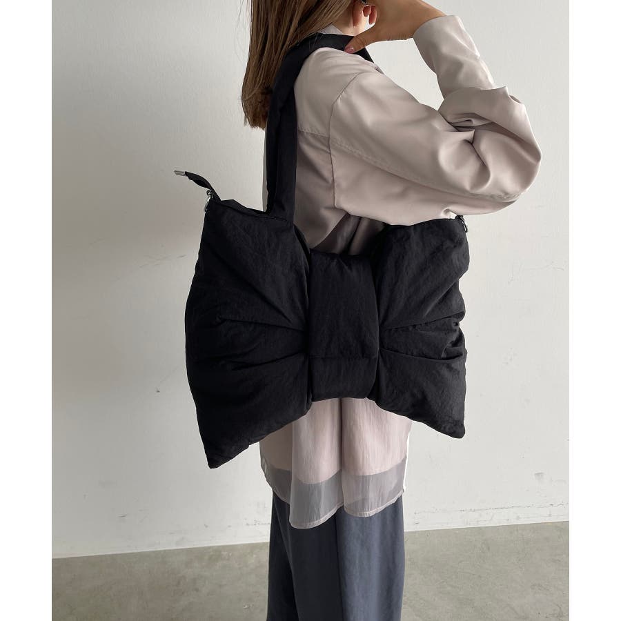 【リボンの形が目を惹くナイロン素材のショルダーバッグ】