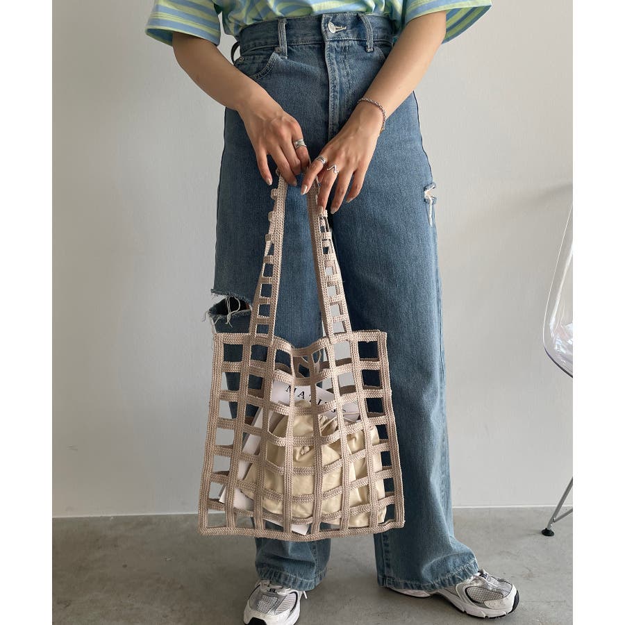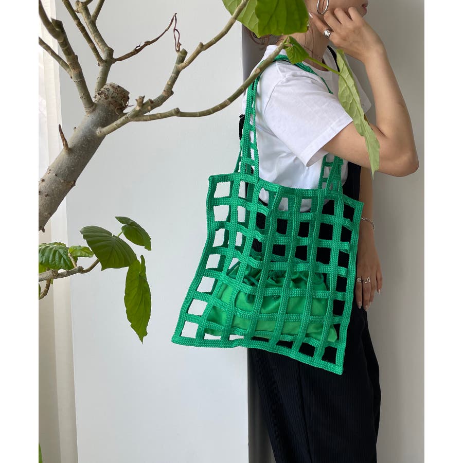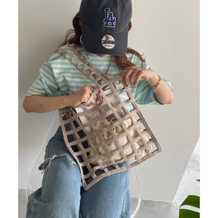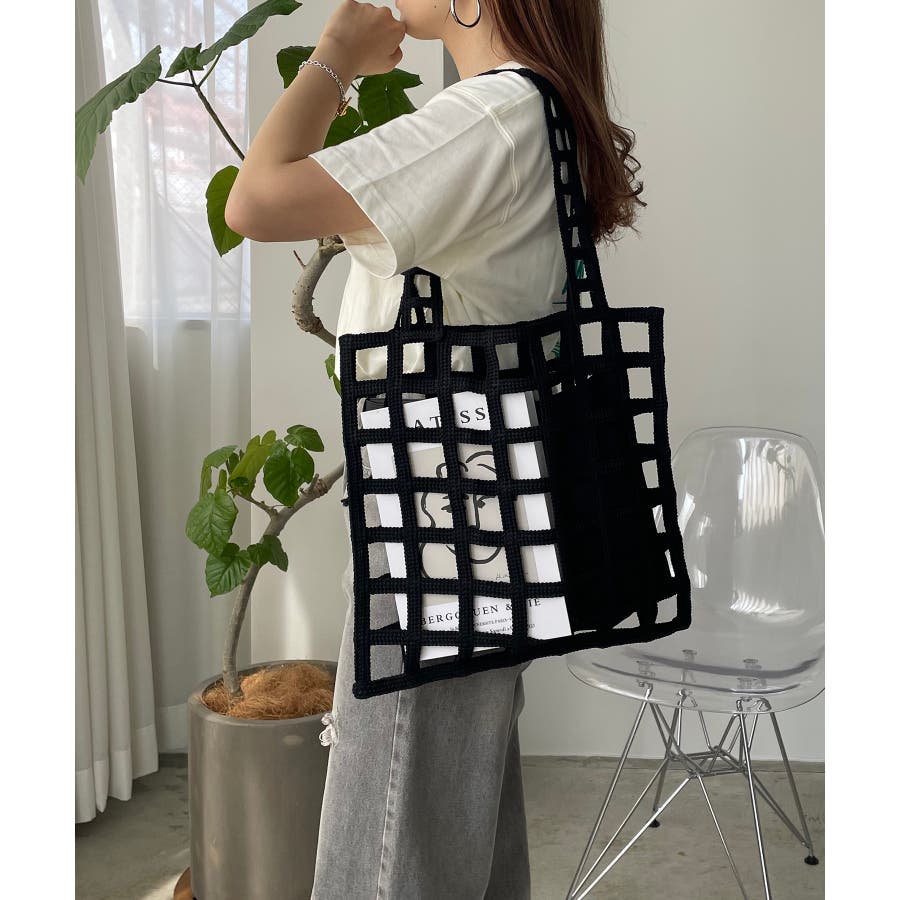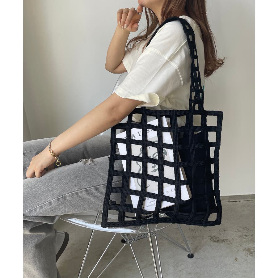 メッシュ編みの抜け感のあるテクスチャーがスタイリングにカジュアルなアクセントを加えてくれるニットトートバッグ。