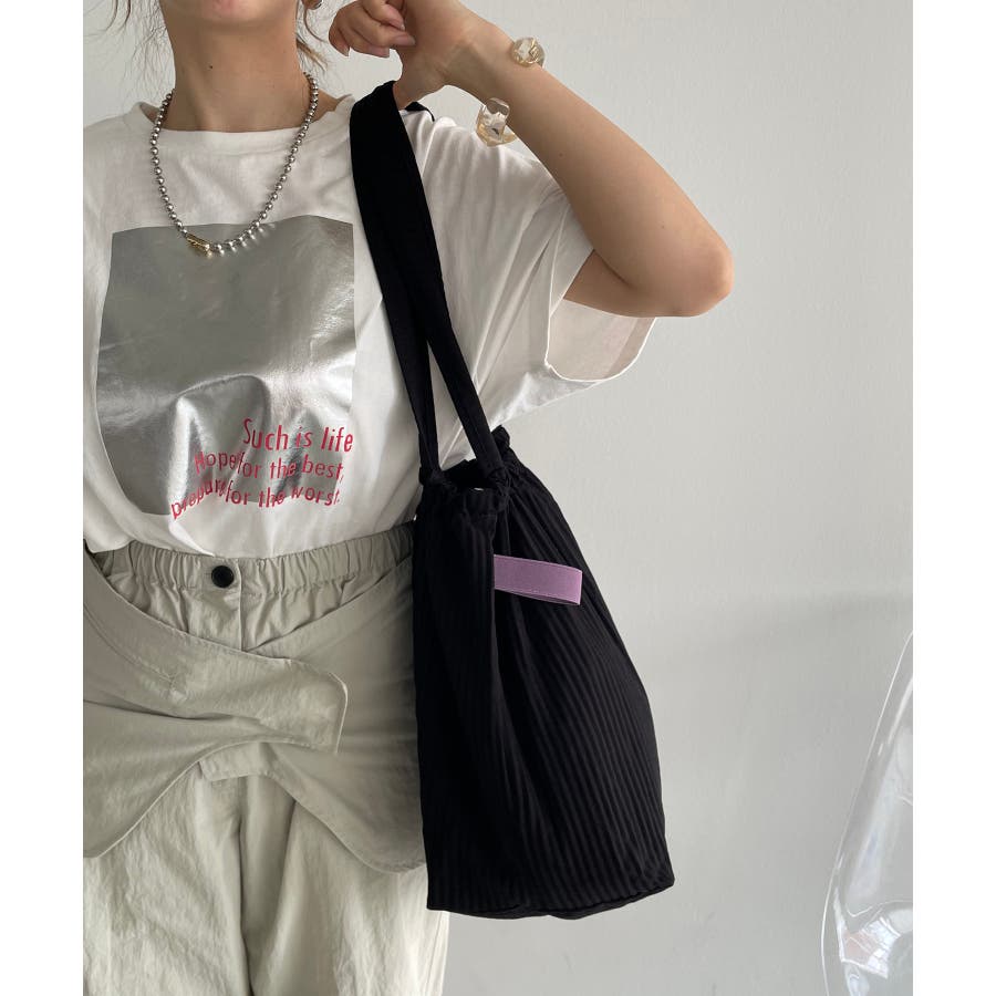 刺繍ロゴが目をひく、A4サイズがすっぽり入るプリーツトートバッグ。生地はポリエステル素材のさらっとした落ち感のある素材です。