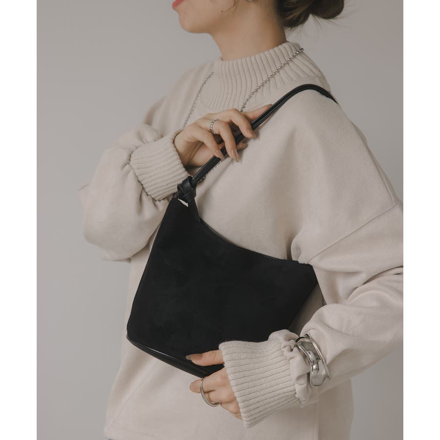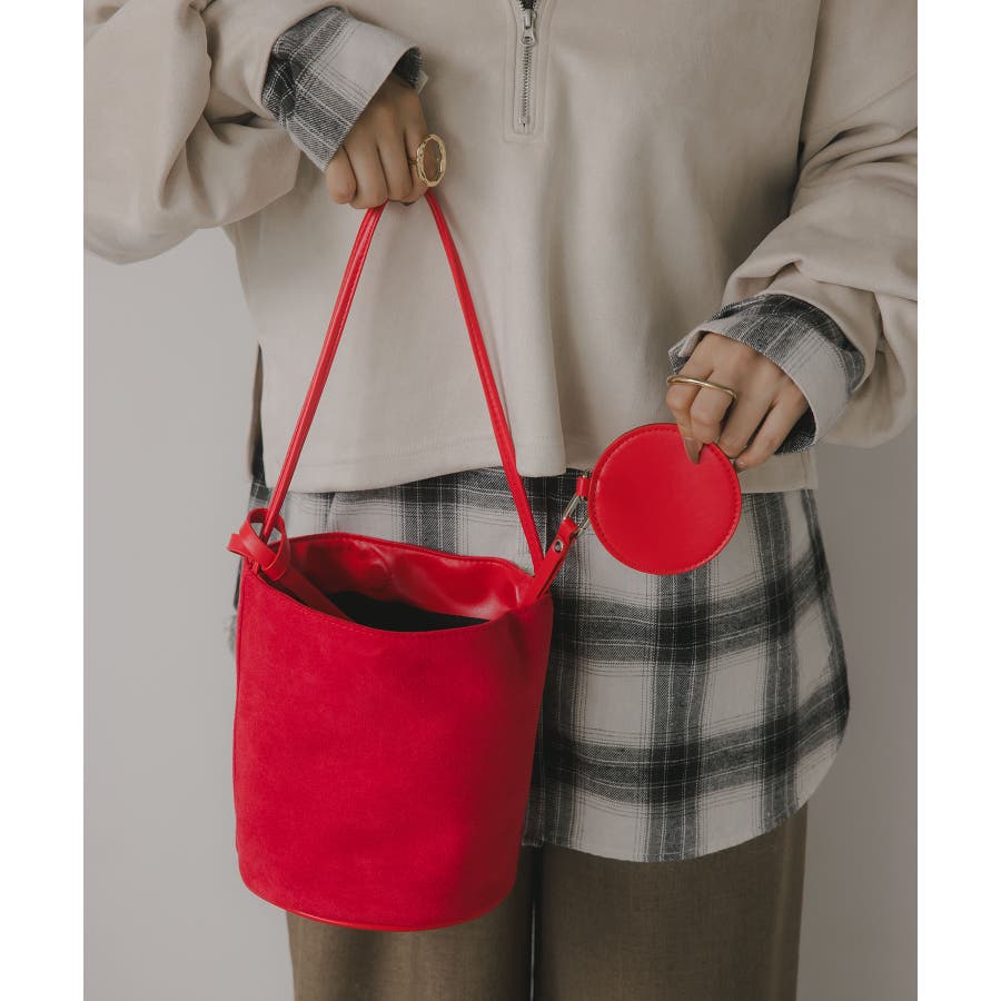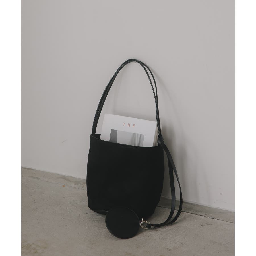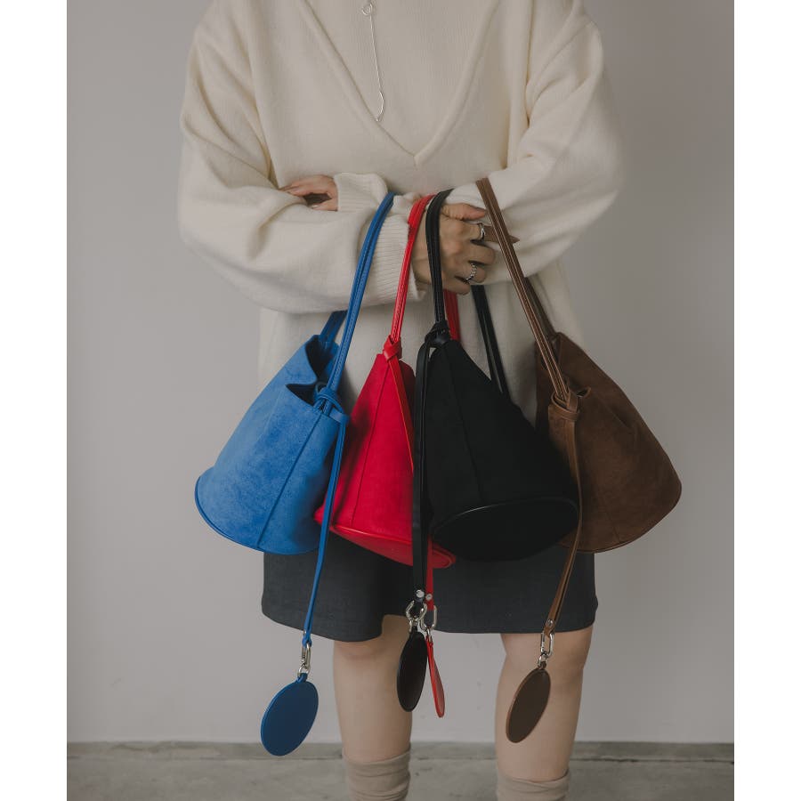 トレンド素材のスエードの風合いと丸いレザーチャームがシーズンライクなバッグ。