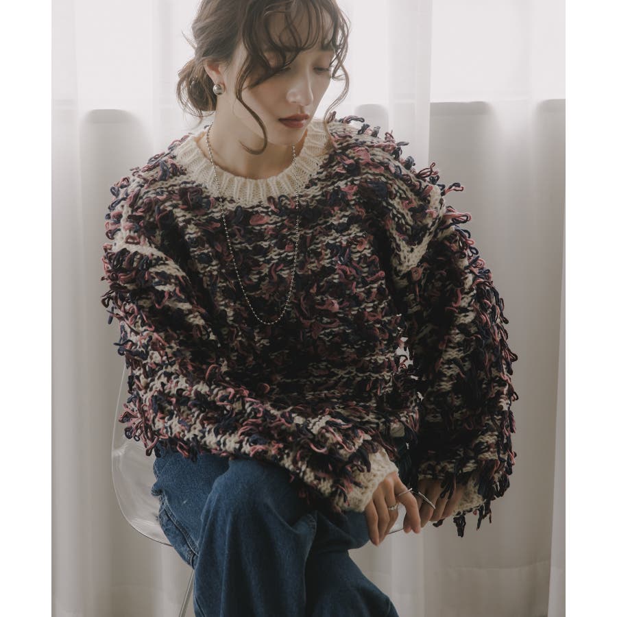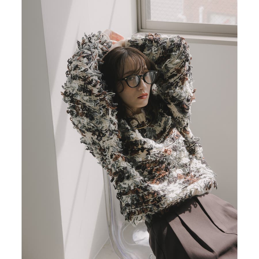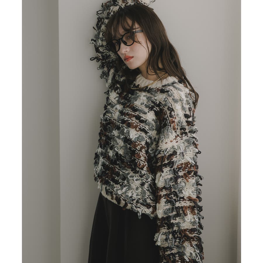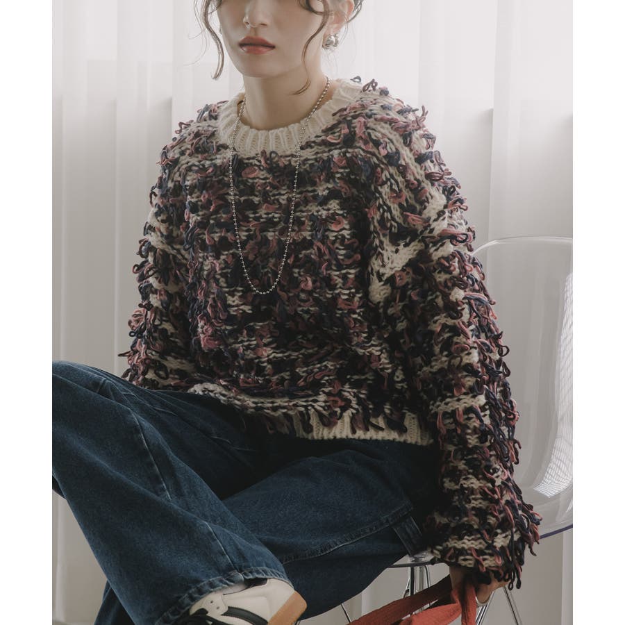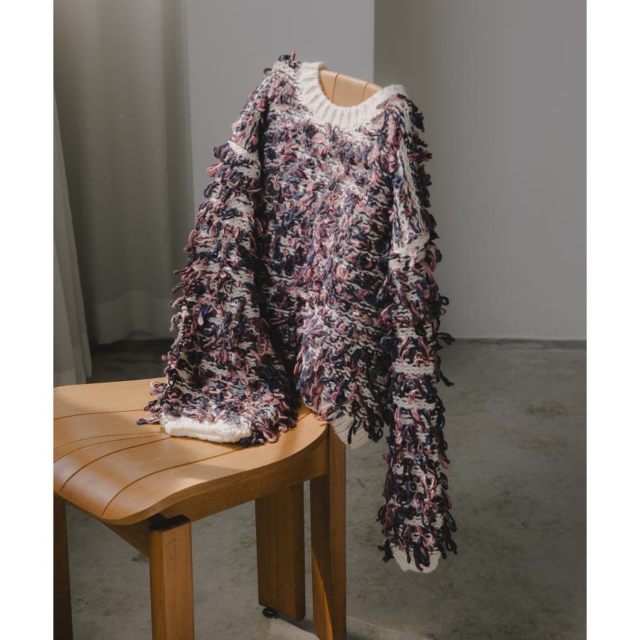 【カールのあるループヤーンにカラー配色で編まれたデザインニット】