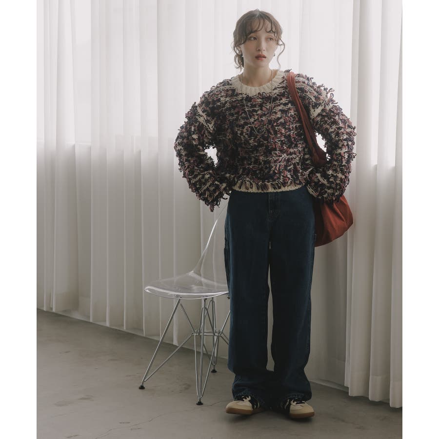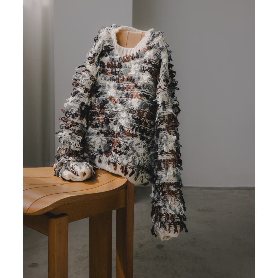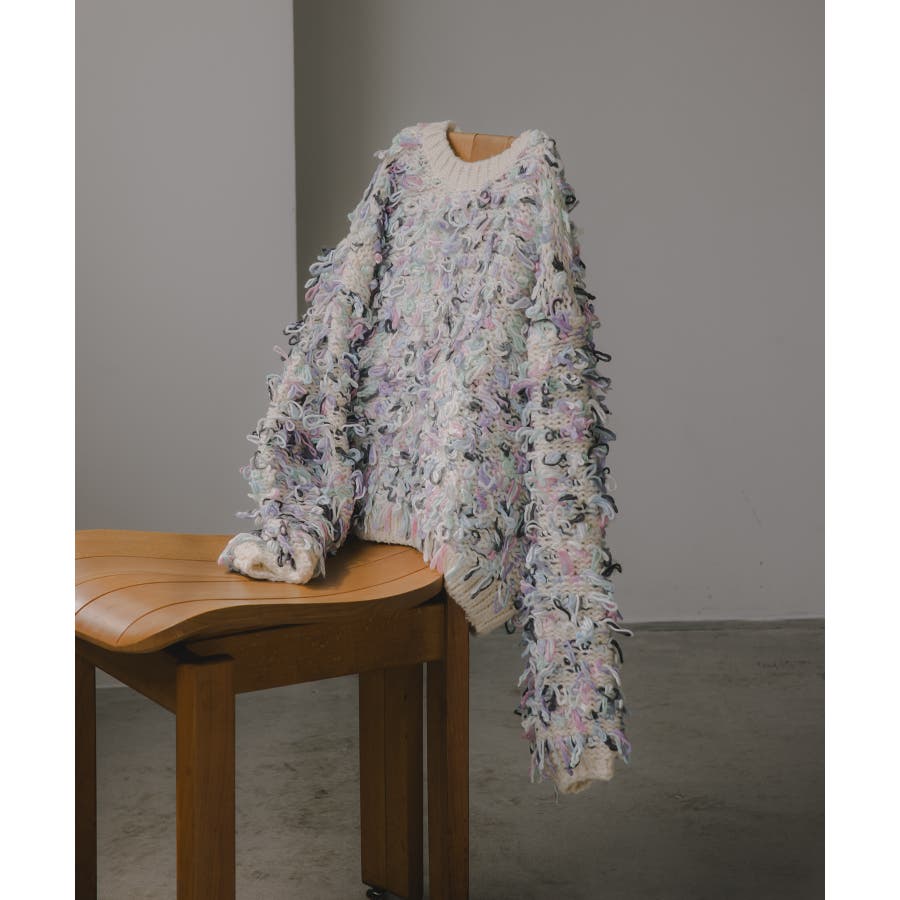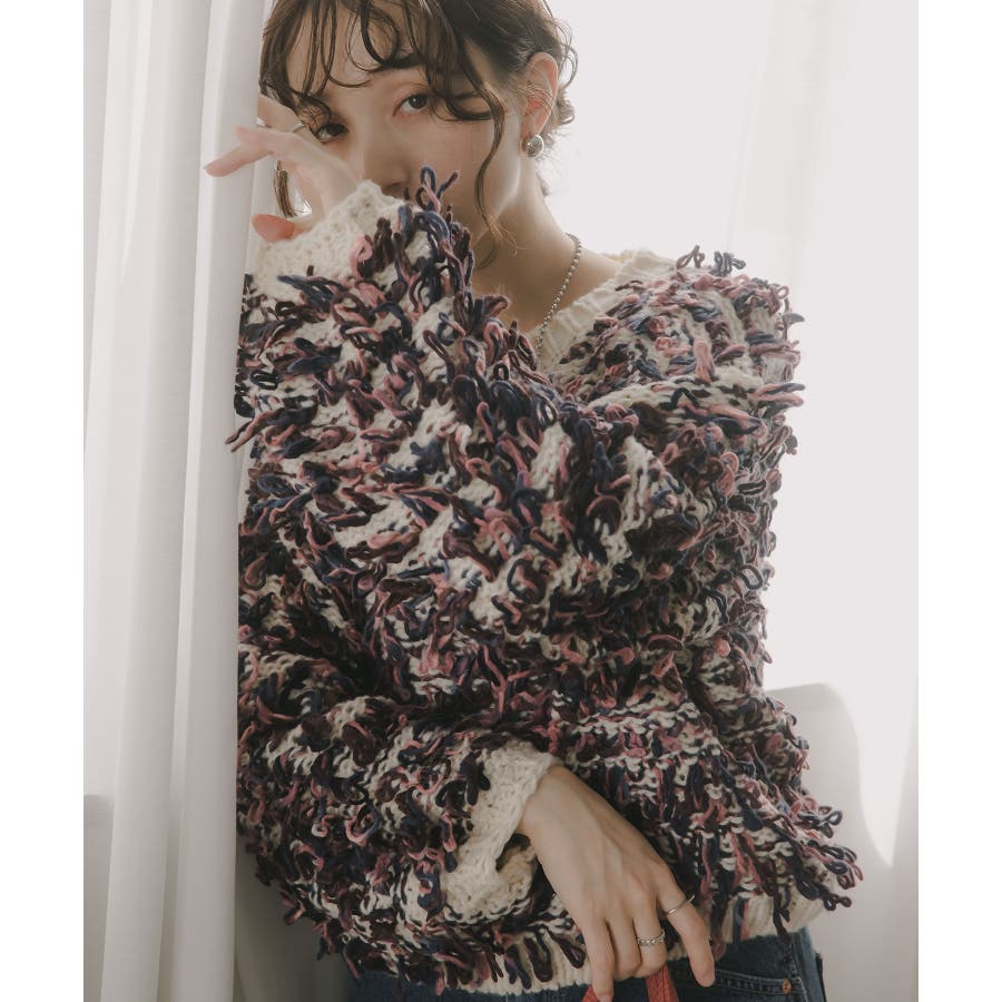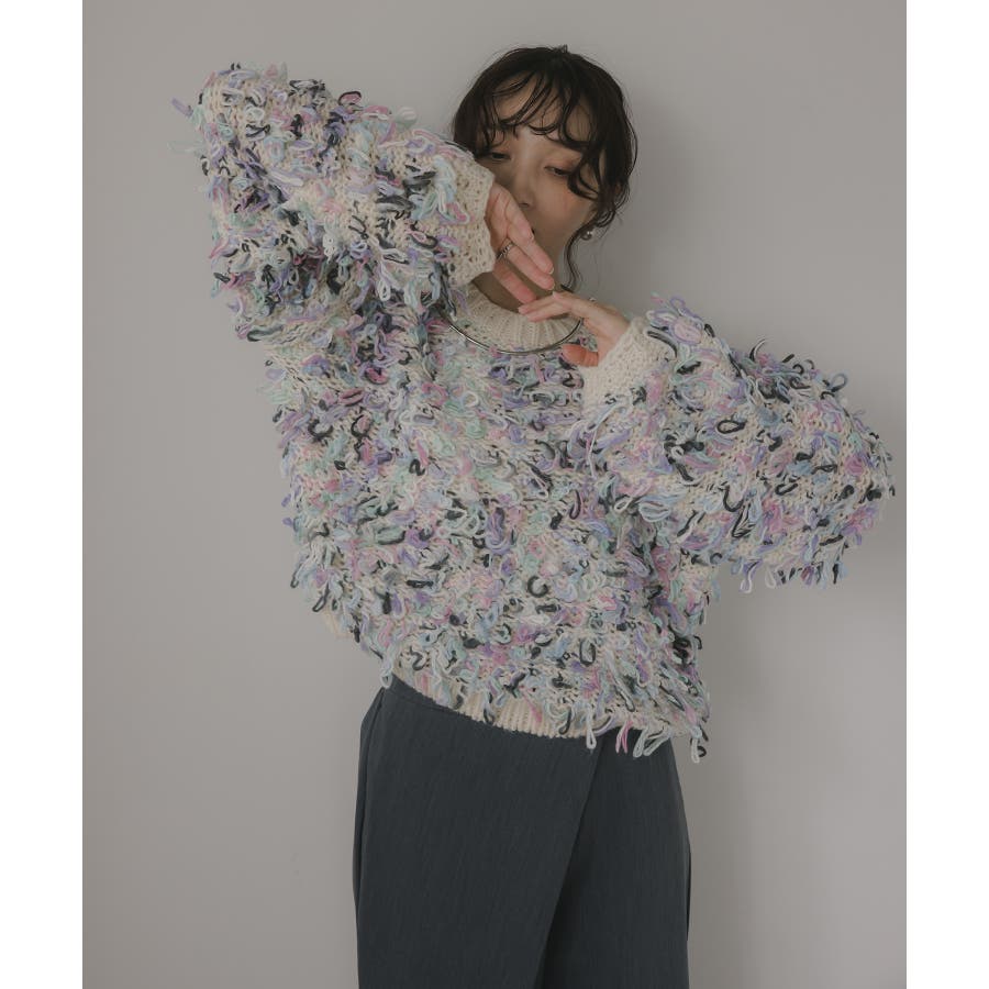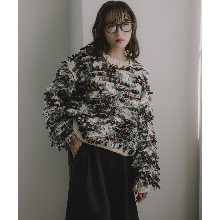 【カールのあるループヤーンにカラー配色で編まれたデザインニット】