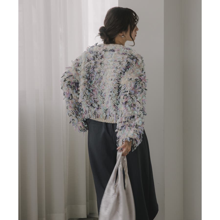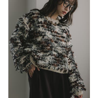 カーリーなループヤーンの編地がかわいいデザインニット。