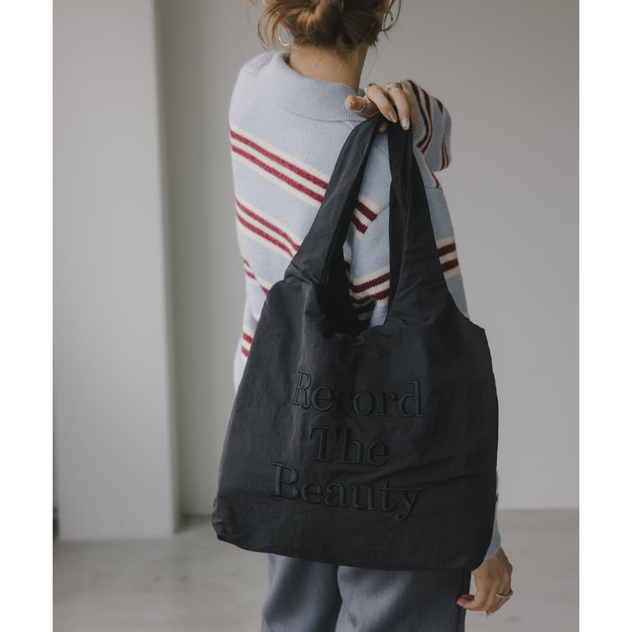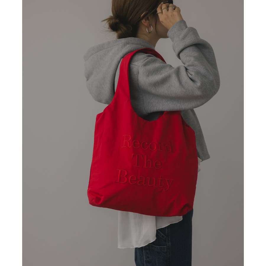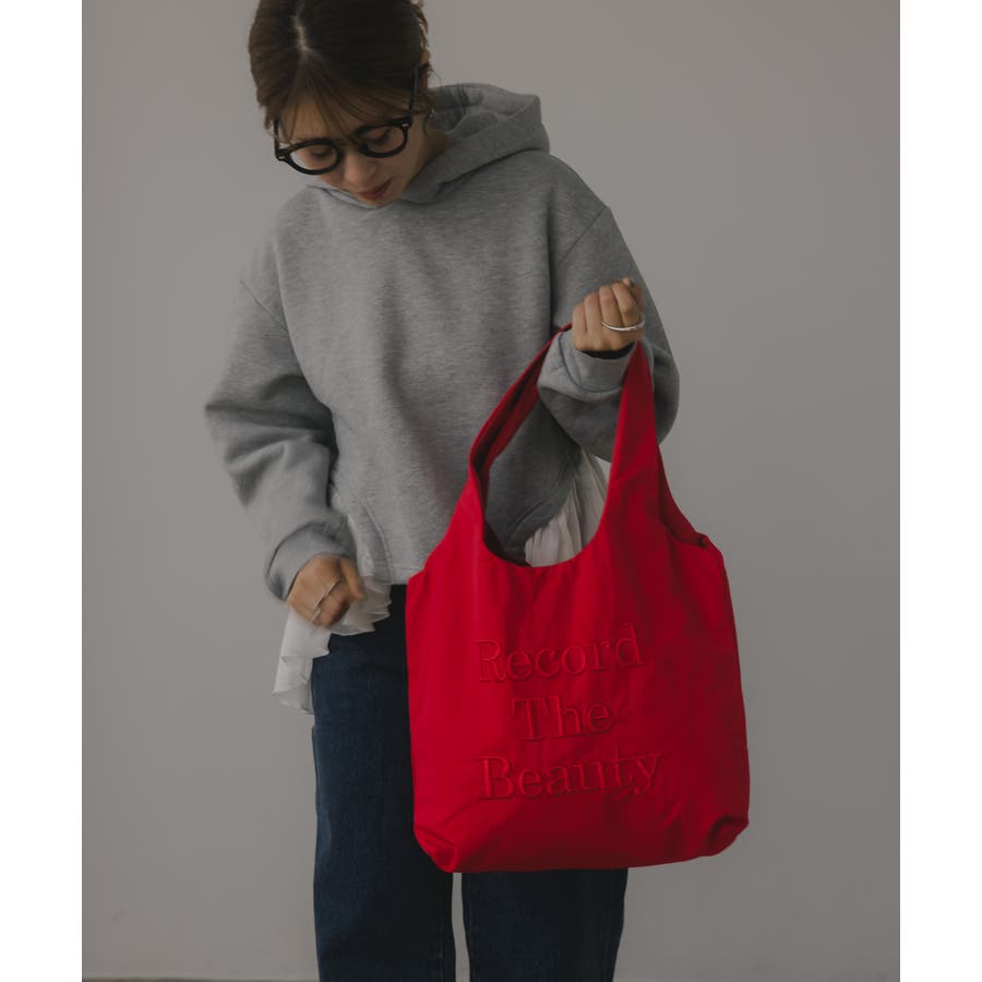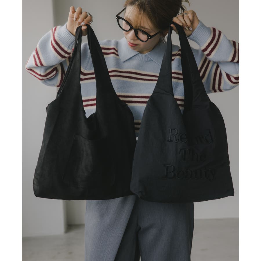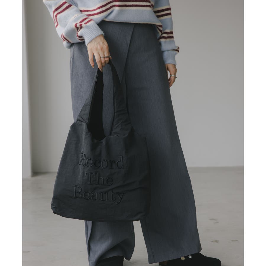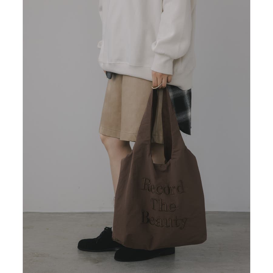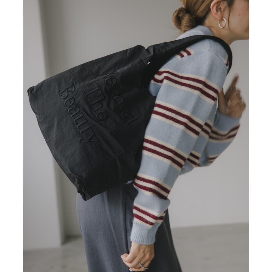 BIGロゴ刺繍が目をひく、A4サイズがすっぽり入るナイロントートバッグ。