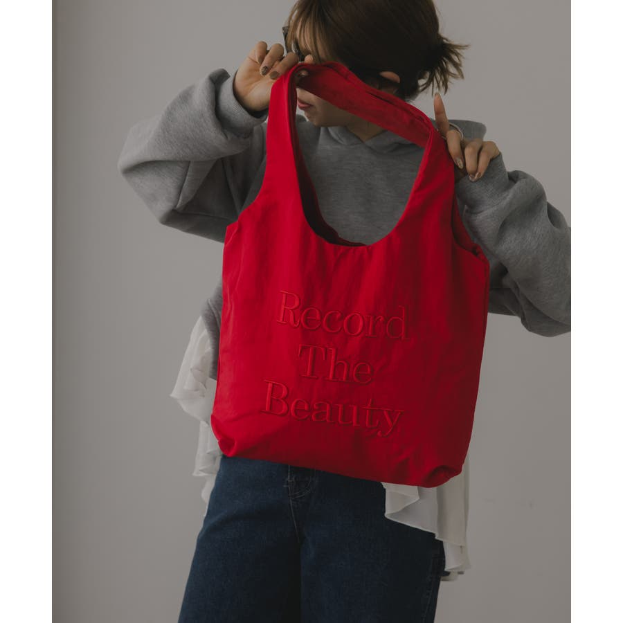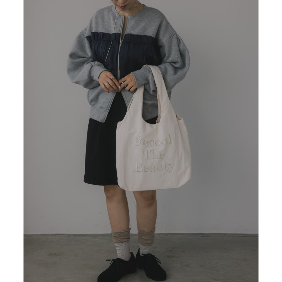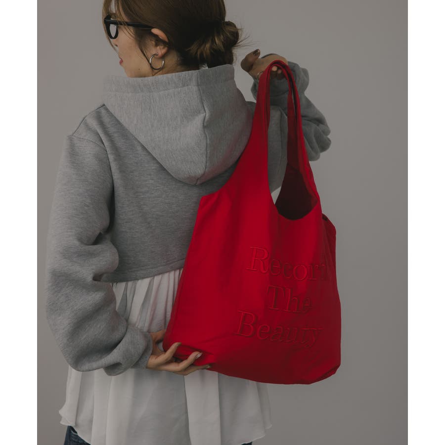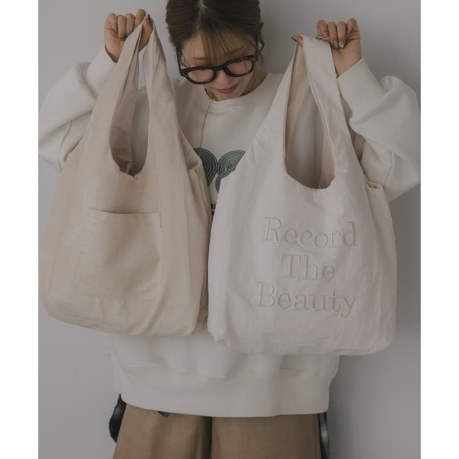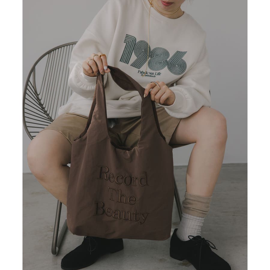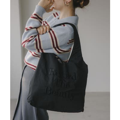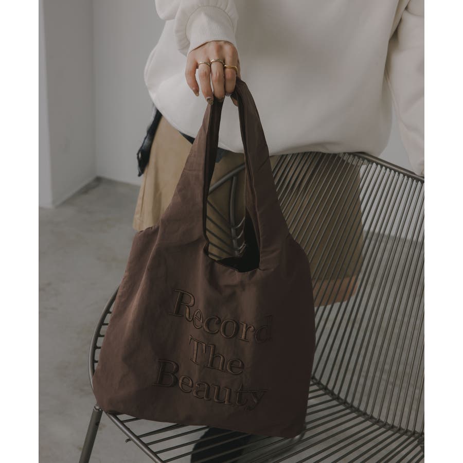BIGロゴ刺繍が目をひく、A4サイズがすっぽり入るナイロントートバッグ。