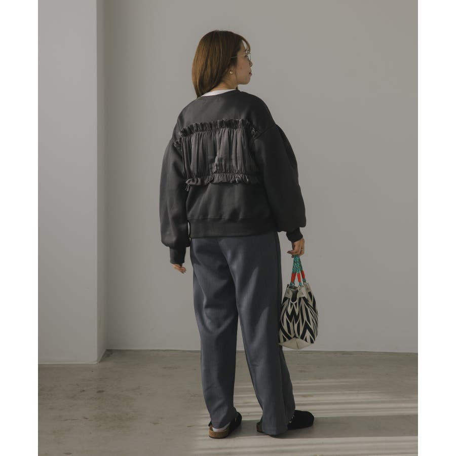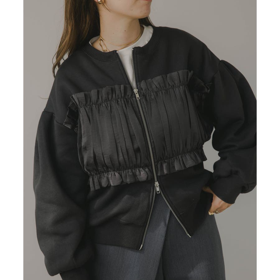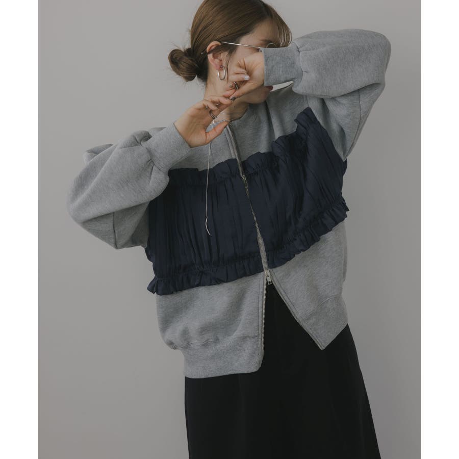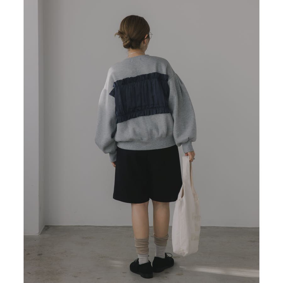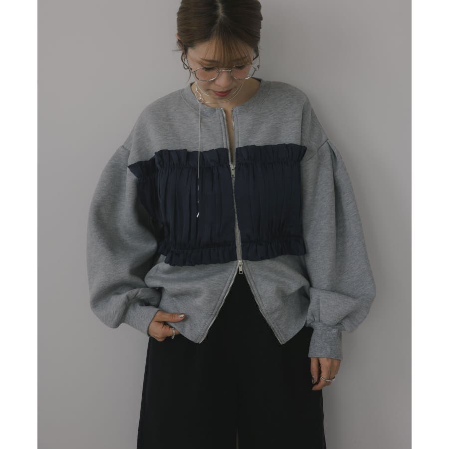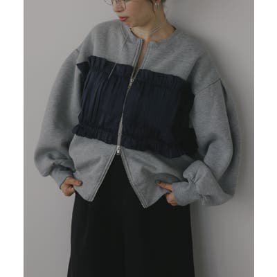 身頃は裏起毛素材、ドッキング部分はギャザー加工を施したシフォン素材。