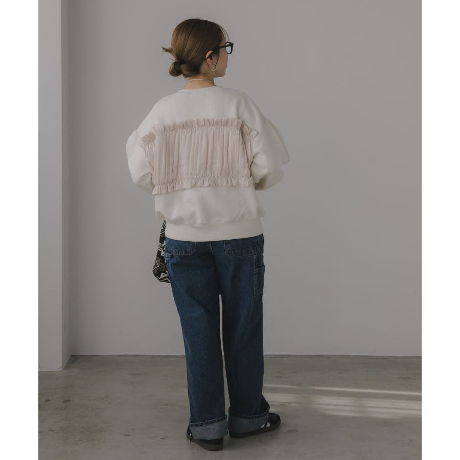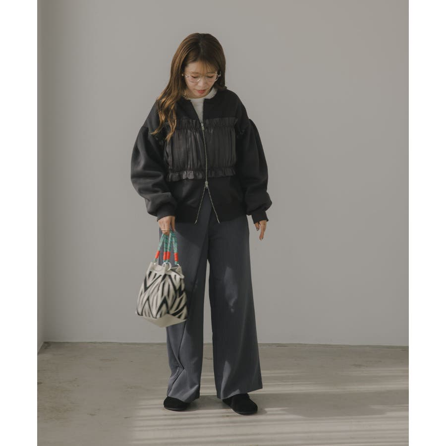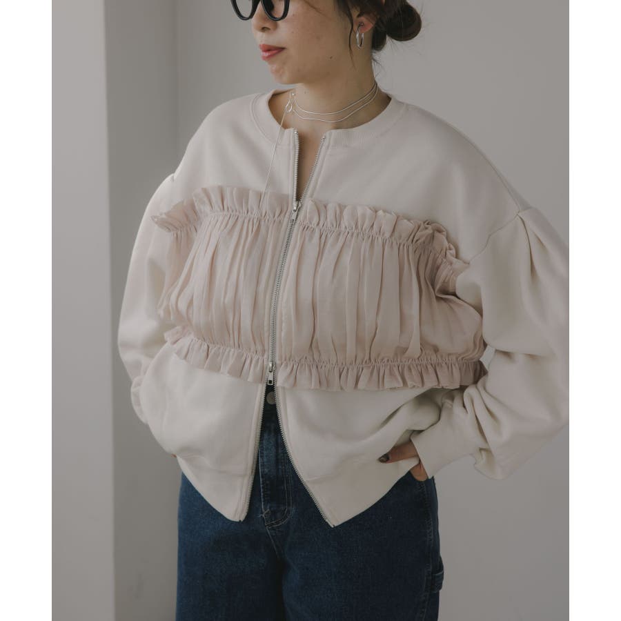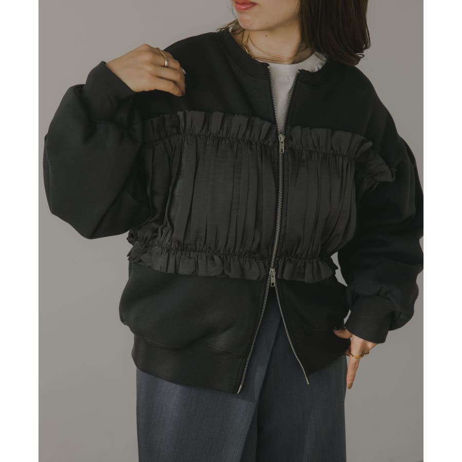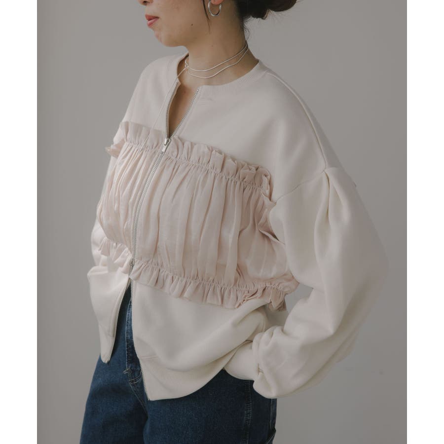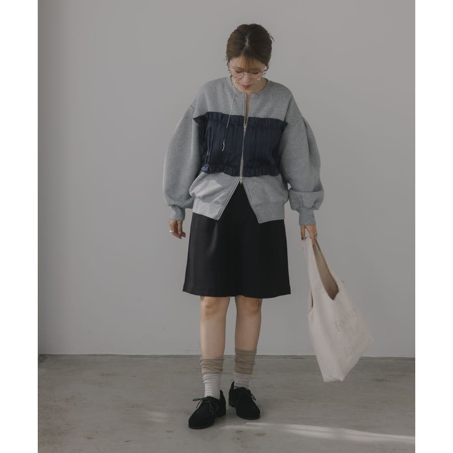 身頃は裏起毛素材、ドッキング部分はギャザー加工を施したシフォン素材。