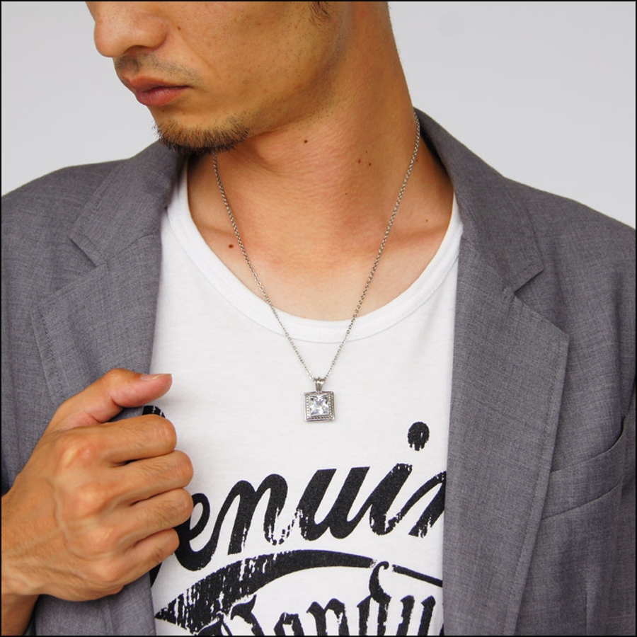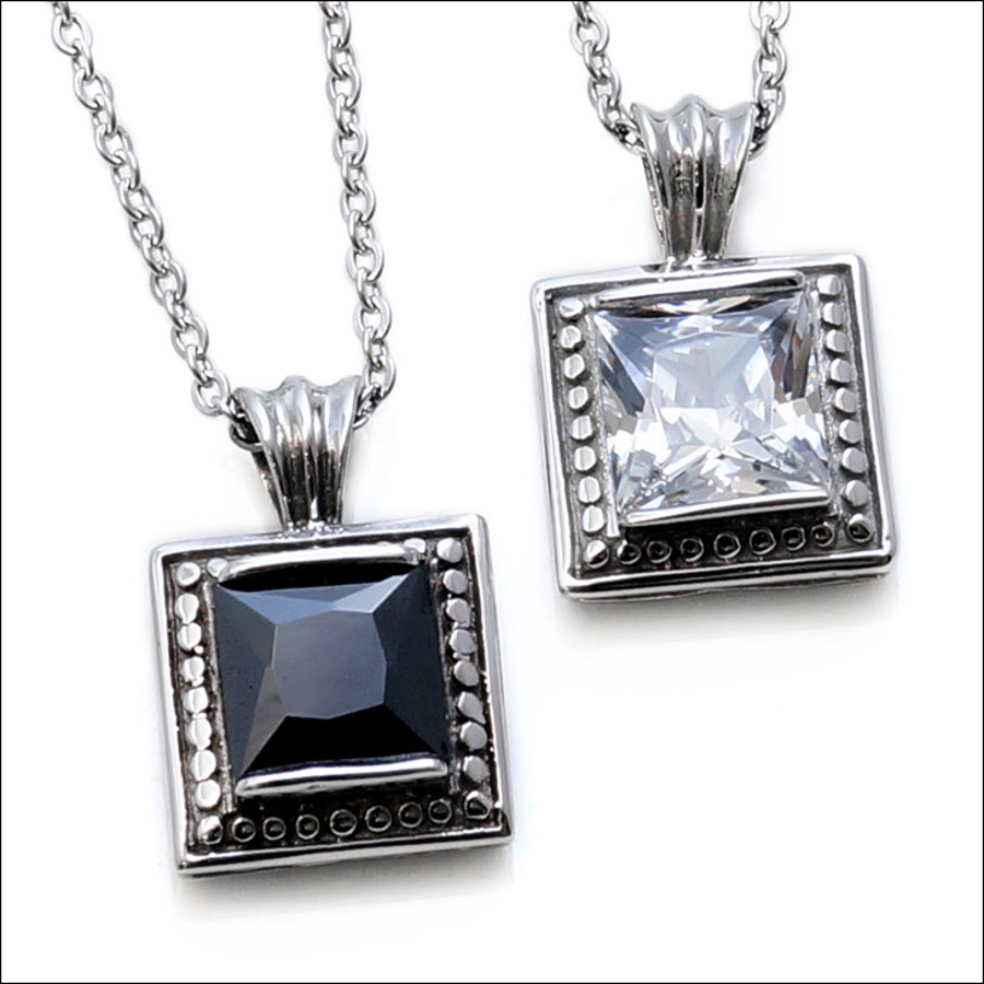 スクエア型のジルコニアを縁取るサイドにもこだわりのデザインのペアペンダント!ラインが綺麗に仕上がったステンレス製ペアネックレス!