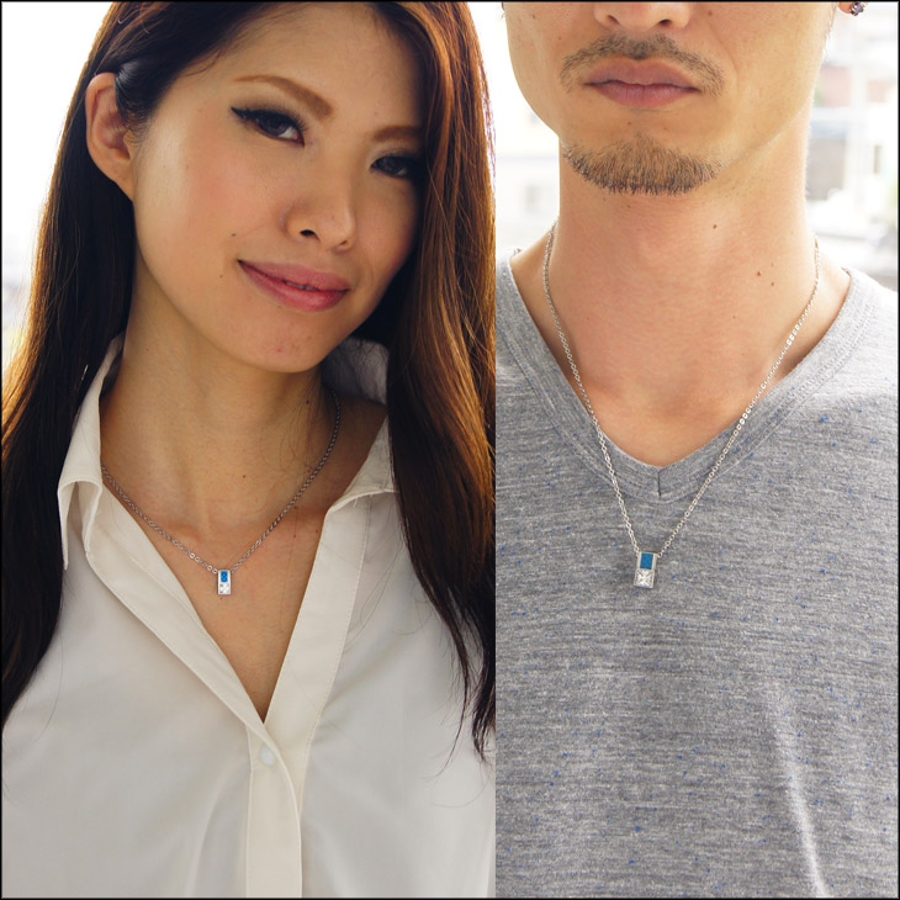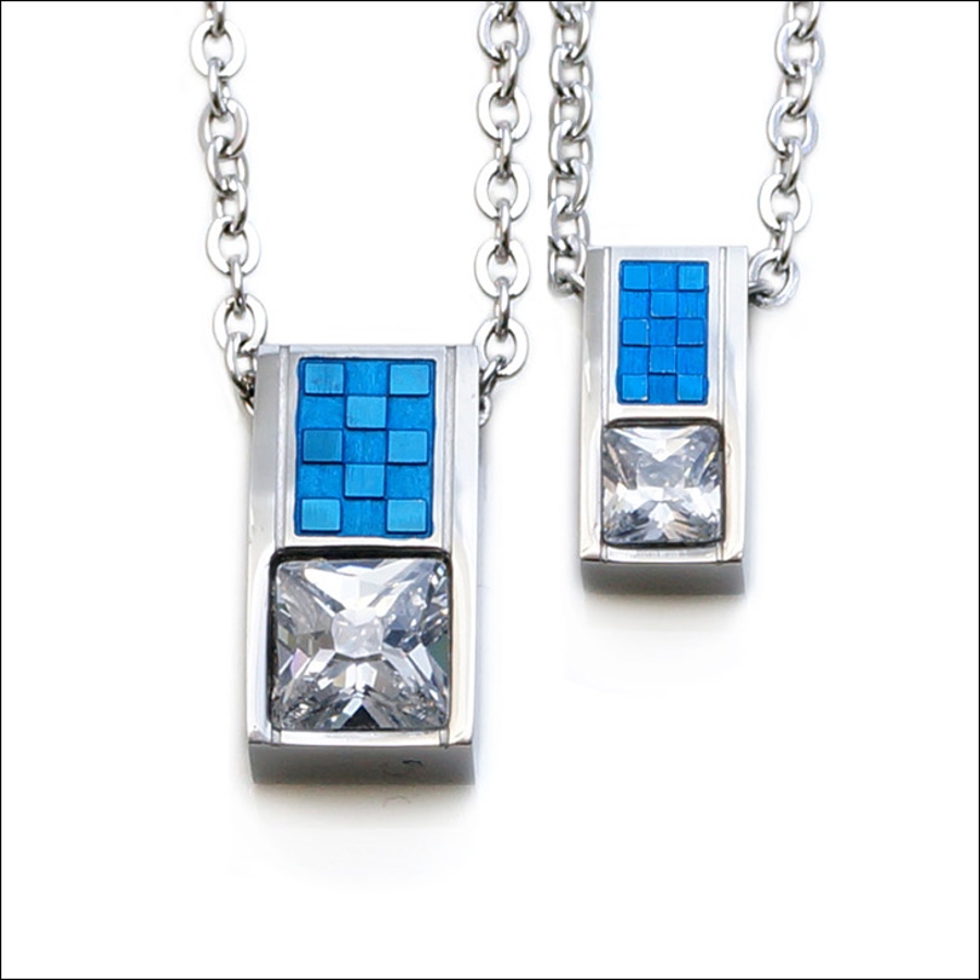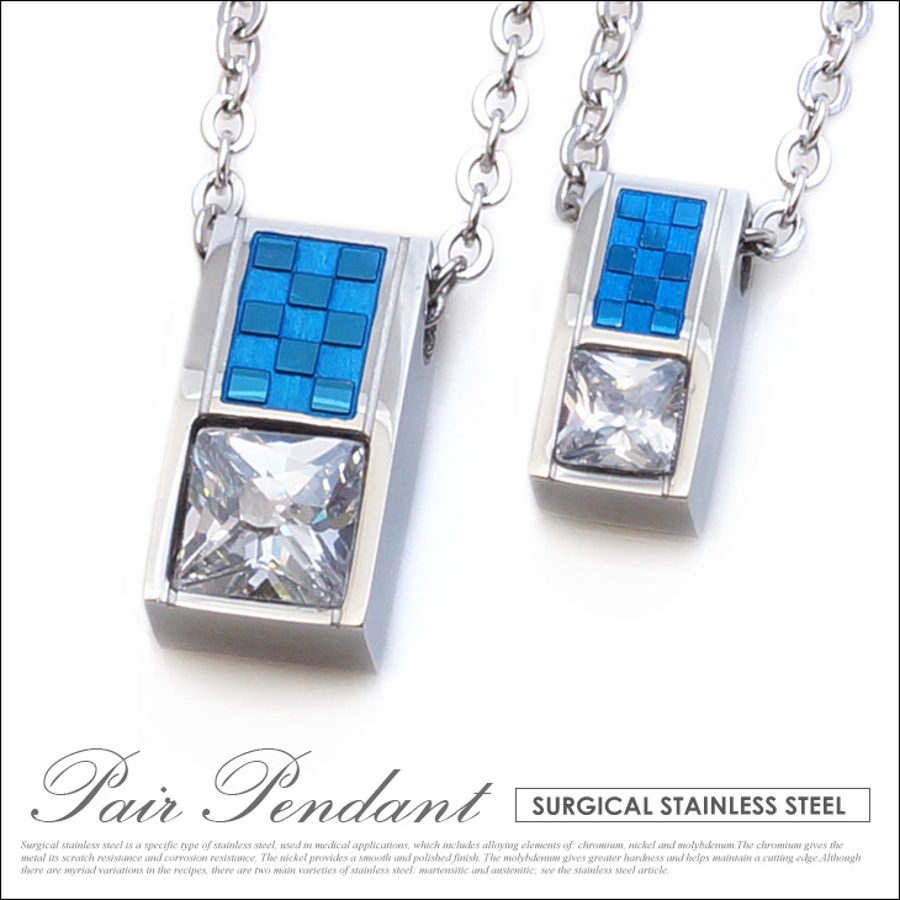 シルバー色にブルーコーティングがジルコニアを目立たせるネックレス!CZのダイヤカットが美しいステンレス製ペアペンダント!
