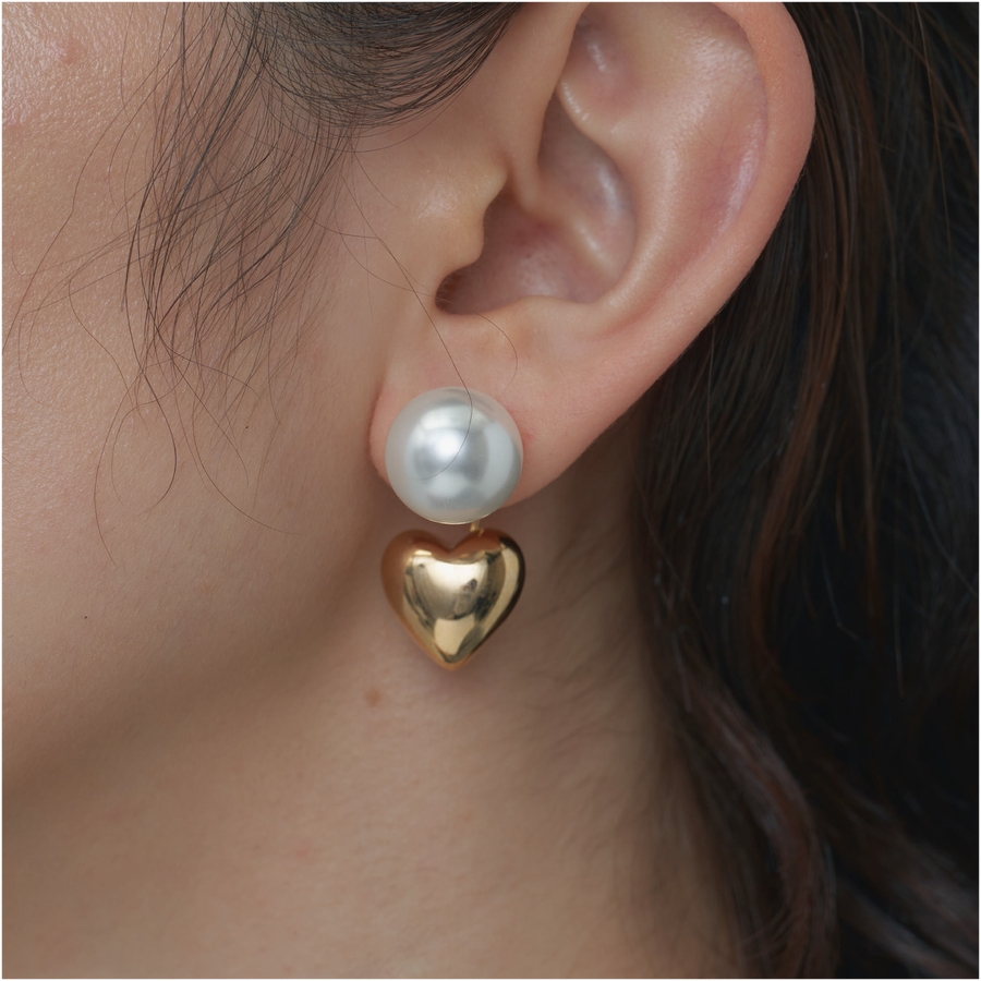 ぷっくりとした大ぶりハートと大粒パールを組み合わせた存在感抜群のピアス。視線を惹きつける主役級アイテムです。