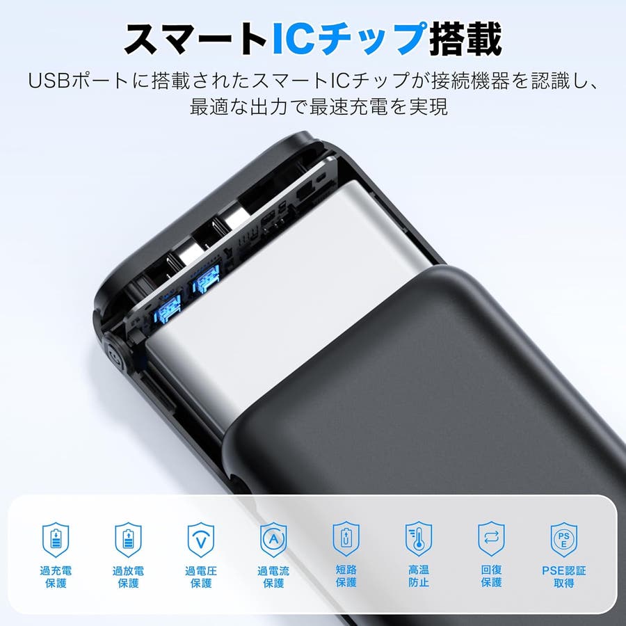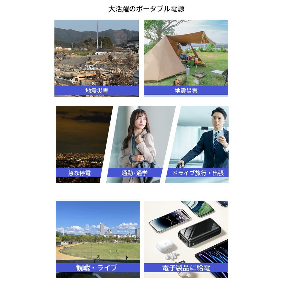 | 素材 | ■ 本体素材(Material) ABS樹脂(難燃性)+PCポリカーボネート └ 衝撃に強く、耐熱性・耐久性に優れた軽量素材 内部バッテリー:高品質リチウムポリマーバッテリー ■ バッテリー容量 50,800mAh(超大容量) ■ サイズ / 重量 サイズ:136mm × 68mm × 27mm 重量:画像では未記載(一般的に約400〜500g)※必要なら追記可能 ■ カラー ブラック(画像ベース) ■ ポート構成 USB-A出力ポート × 2(最大3A対応) USB-Cポート × 1(入力・出力対応) 電源ボタン × 1 LEDデジタル残量表示パネル ■ 出力 / 入力(充電能力) 最大出力:3A急速充電対応 3台同時充電可能 USB-C:入力+出力 USB-A:高速充電対応ポート×2 ■ 主な特長(Features) 50800mAhの超大容量で長時間の電力確保 スマートICチップ搭載でデバイスを自動判別し最適充電 デジタル残量表示でバッテリーの状態が一目でわかる コンパクト設計で持ち運びやすい 旅行・アウトドア・災害時の備えにも最適 ■ 多重安全保護機能(Safety Protection) 過充電保護 過放電保護 過電圧保護 過電流保護 短絡(ショート)保護 高温防止 回復保護 PSE認証取得済み ■ 対応機器(Compatibility) スマートフォン(iPhone / Android) iPad / タブレット Switchなどの携帯ゲーム機 カメラ スマートウォッチ MP3プレイヤー など |