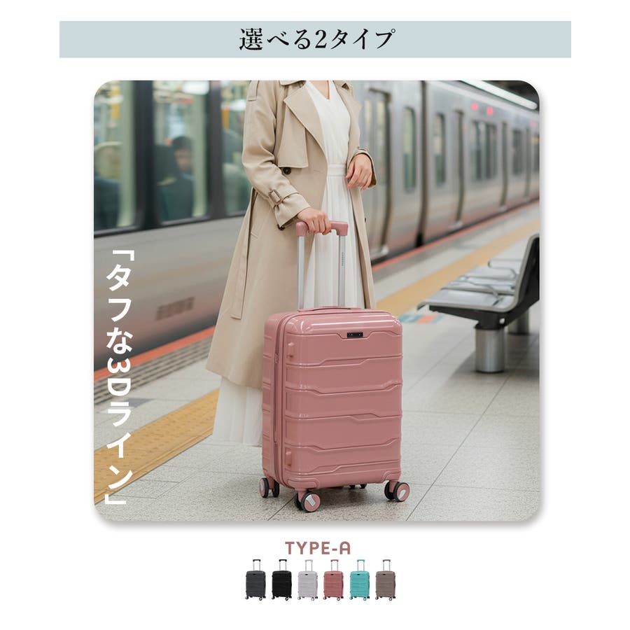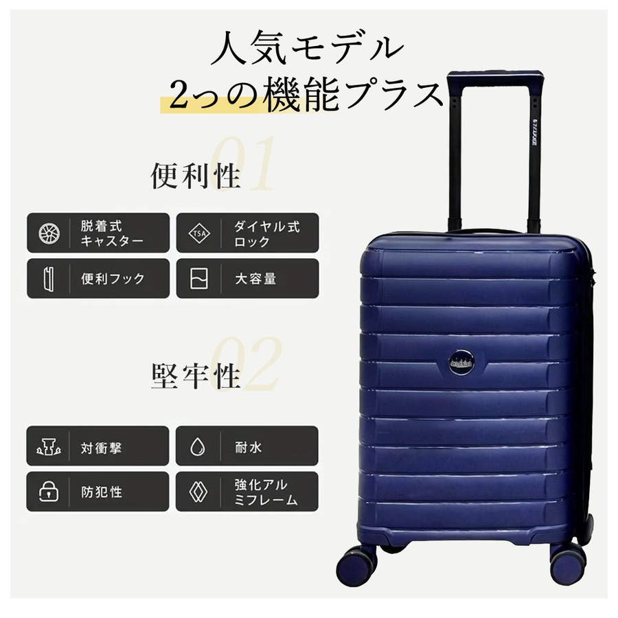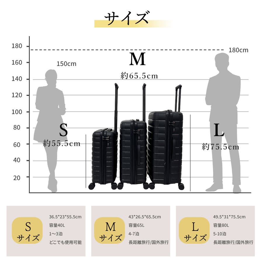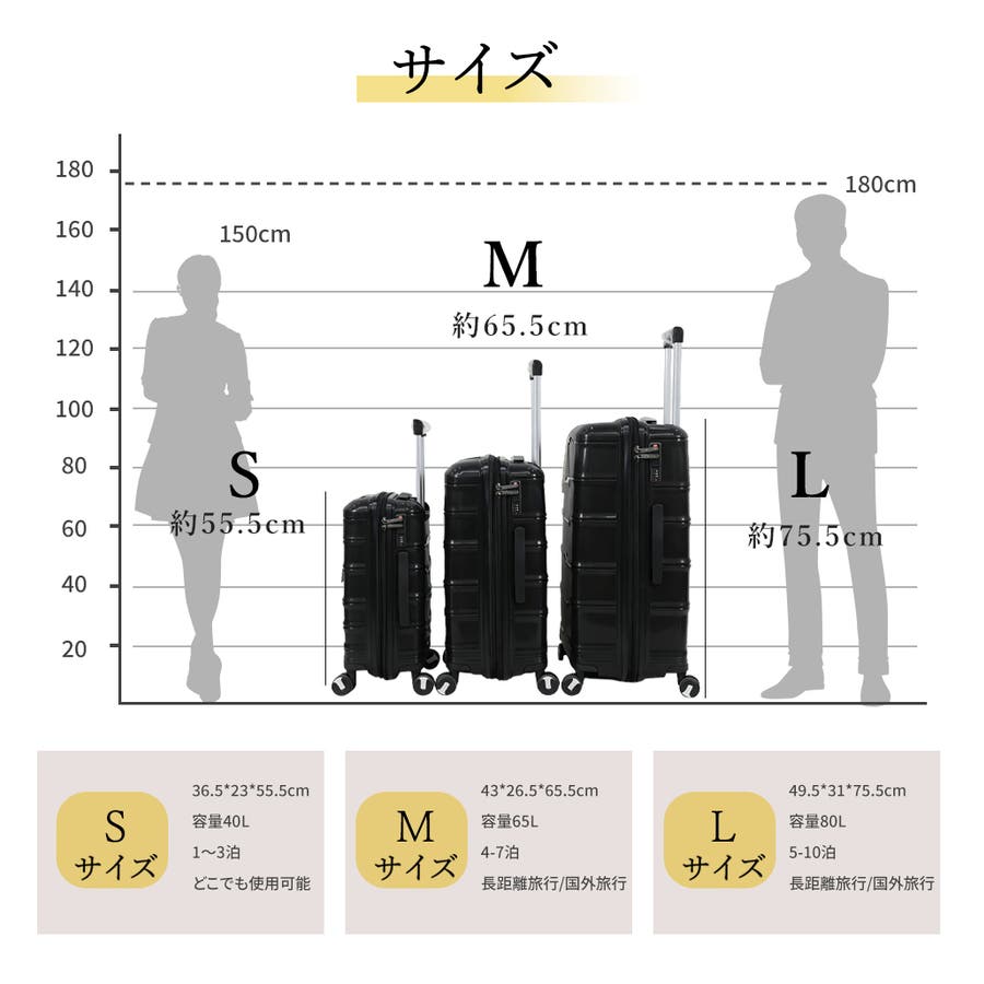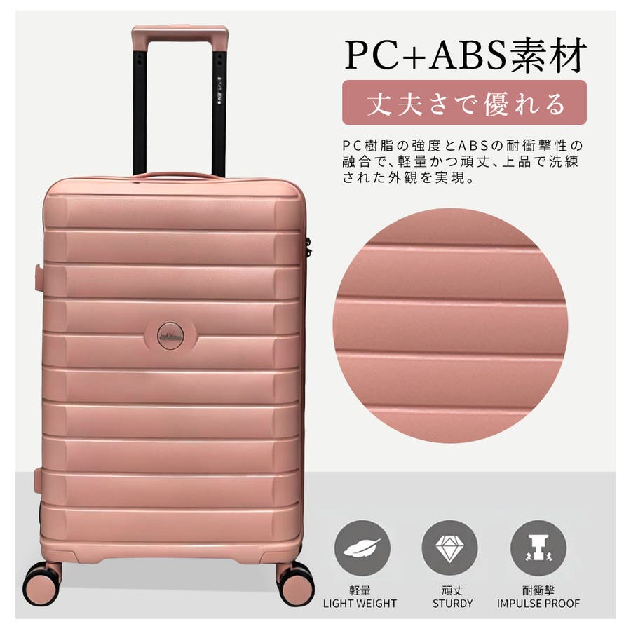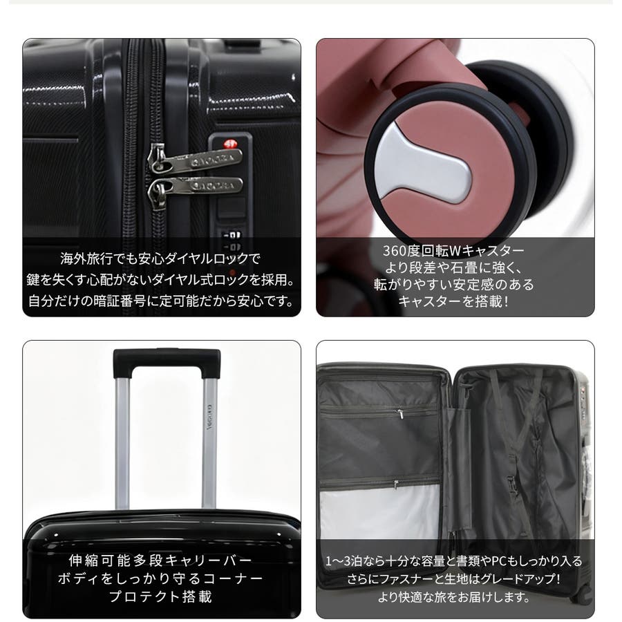 | 素材 | ・軽量設計で持ち運びラクラク ・静音360°ダブルキャスター ・TSAロック搭載 ・大容量収納 |