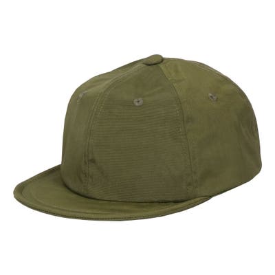 短いつばが特徴的なアンパイヤキャップ。軽量で撥水性に優れたワッシャーナイロン生地を使用し、折りたたんでもシワが目立ちにくくコンパクトに収納ができ、持ち運びにも便利です。表側は無地、裏側はバイカラーのパイピングでさりげなくおしゃれに。