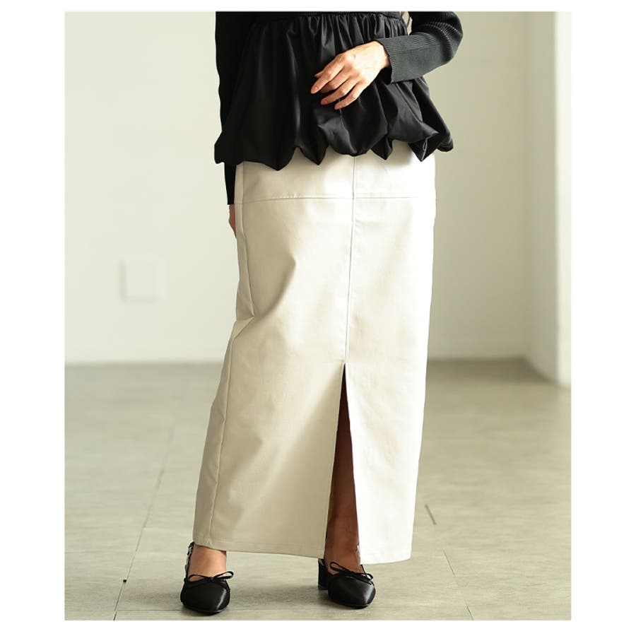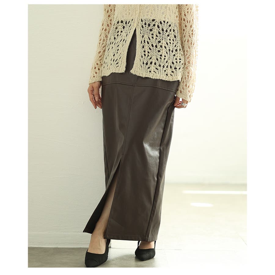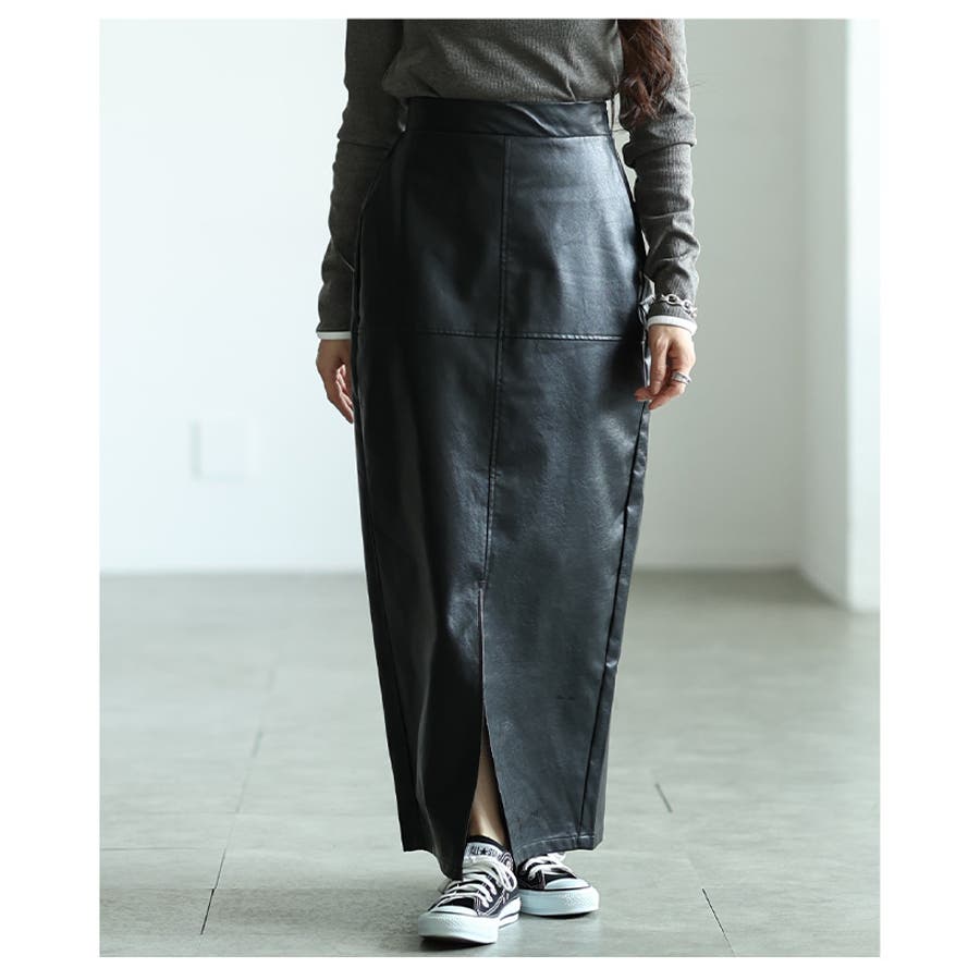 今季のトレンドであるフェイクレザーがスカートで登場です!モードにも上品にも着こなせるフェイクレザーは秋冬に是非取り入れていただきたい素材です◎スラっとしたタイトシルエットはスタイルアップ効果抜群!
