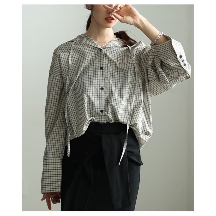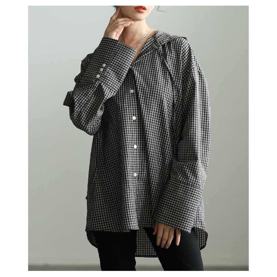 ラフ感漂うチェック柄フーディーオーバーシャツ レディース ファッション