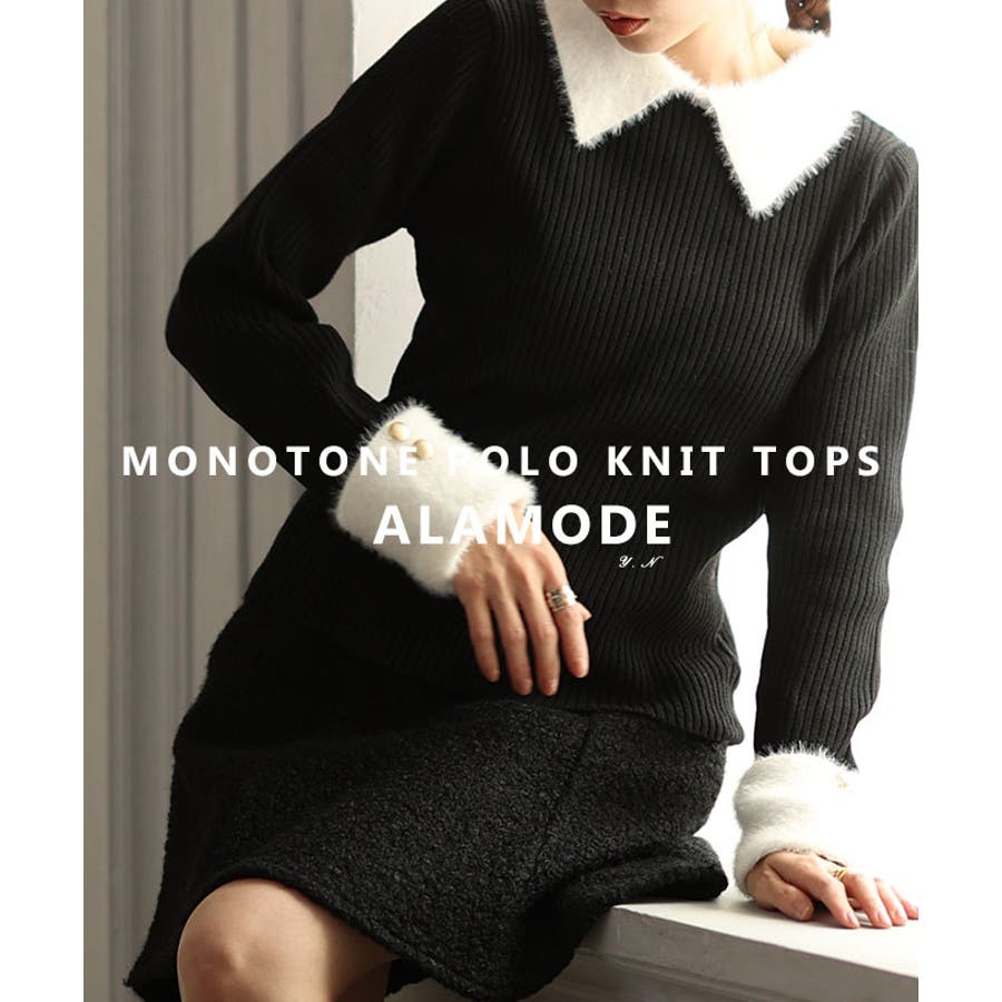レディに着こなすフェザー切替リブニットポロトップス レディース ファッション