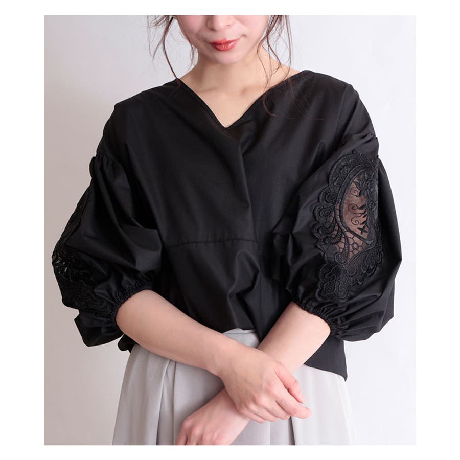 花刺繍レースのぽわん袖トップス ブラック ブラウス