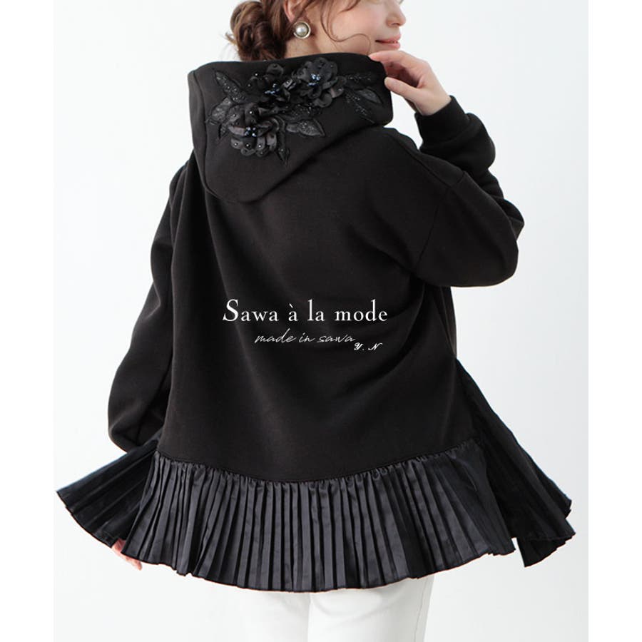 着丈は太もも真ん中ぐらいで、袖丈は伸ばすと指先が見えるぐらいです。袖口のリブで親指付け根あたりで止まります。全体的にゆったりとしていて、裾のテロンとしたプリーツが動きをだしてくれます。フードについた花の装飾がとても豪華で上品です。裏起毛で温かく、スウェット生地のパーカーなので大人カジュアルな1枚です。Mサイズ着用モデル