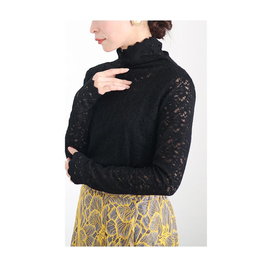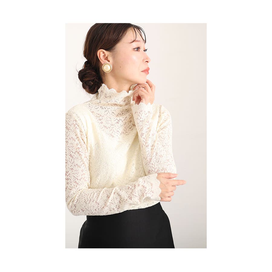 着丈はヒップに少しかかるくらい、袖丈は手の甲が隠れるくらいでした。ストレッチの効いたレース生地で程よく体に沿うサイズ感でしたが窮屈感はありませんでした。首元はクシュっとさせるハイネックで、首元・袖口はスカラップ仕立てで可愛いです。シャツやジャンスカ、スーツやニットなど、色々なアイテムとのコーデを楽しめる一枚です。