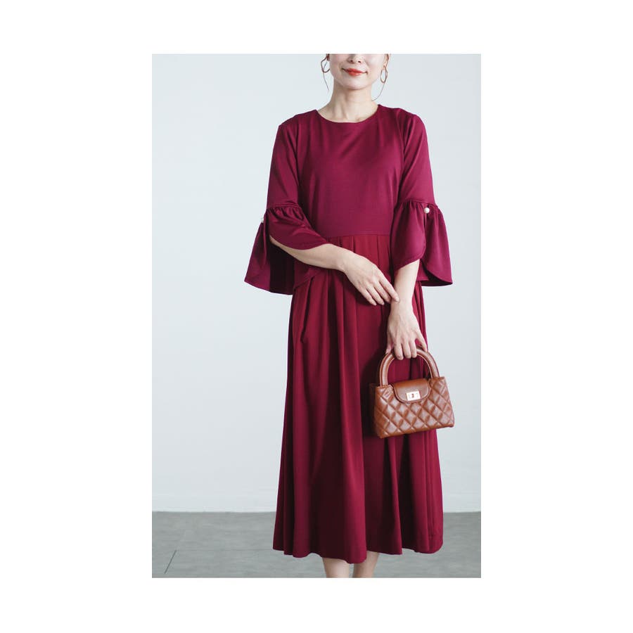 艶めくパールが美しいフレアスリーブロングワンピース。