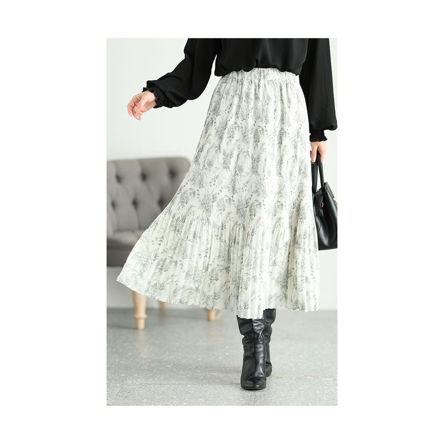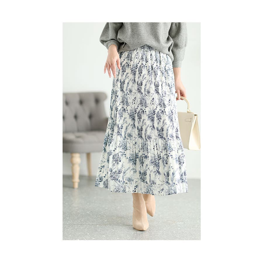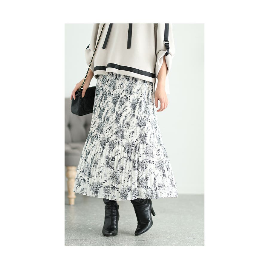 スカート丈は足首丈、ウエストは総ゴム入りで楽に穿けました。細かいプリーツを膝位置で消した、消しプリーツ仕立てなので裾がふんわりしています。単色の線画の草花プリントがシックでステキです。裏地はほんのり裏起毛のカットソー生地なので、暖かく着られました。