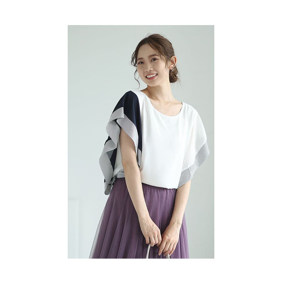 着丈はヒップが隠れるくらい、袖はフレンチです。サラッとした肌触りで透け感があります。アシメトリーデザインの大きなフリルの袖が軽やかに揺れてステキです。首元は鎖骨が半分のぞくくらいです。脇ぐりは広くないので横からのチラ見えの心配はありません。