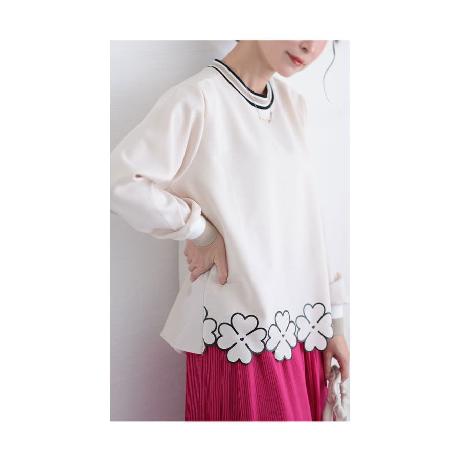 着丈はヒップがほぼ隠れるくらい、袖丈は袖口リブでちょうどで留まりました。サラッと肌触りのカットソーで首元・袖口は配色切り替えでスポーティなイメージですが、フロント裾はクローバープリントのスカラップ仕立てで可愛さもあります。ゆったりしたシルエットで楽に着られました。ベージュはやや透け感があるのでインナーに注意してください。