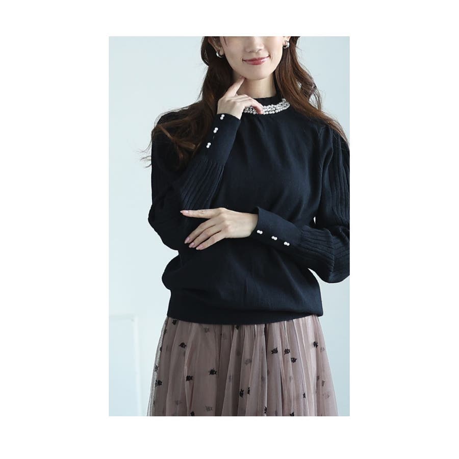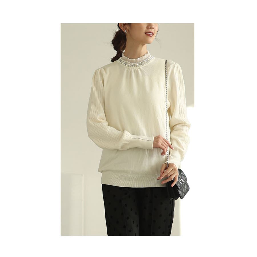 デコレーションパールネックの綺麗めニットトップス。